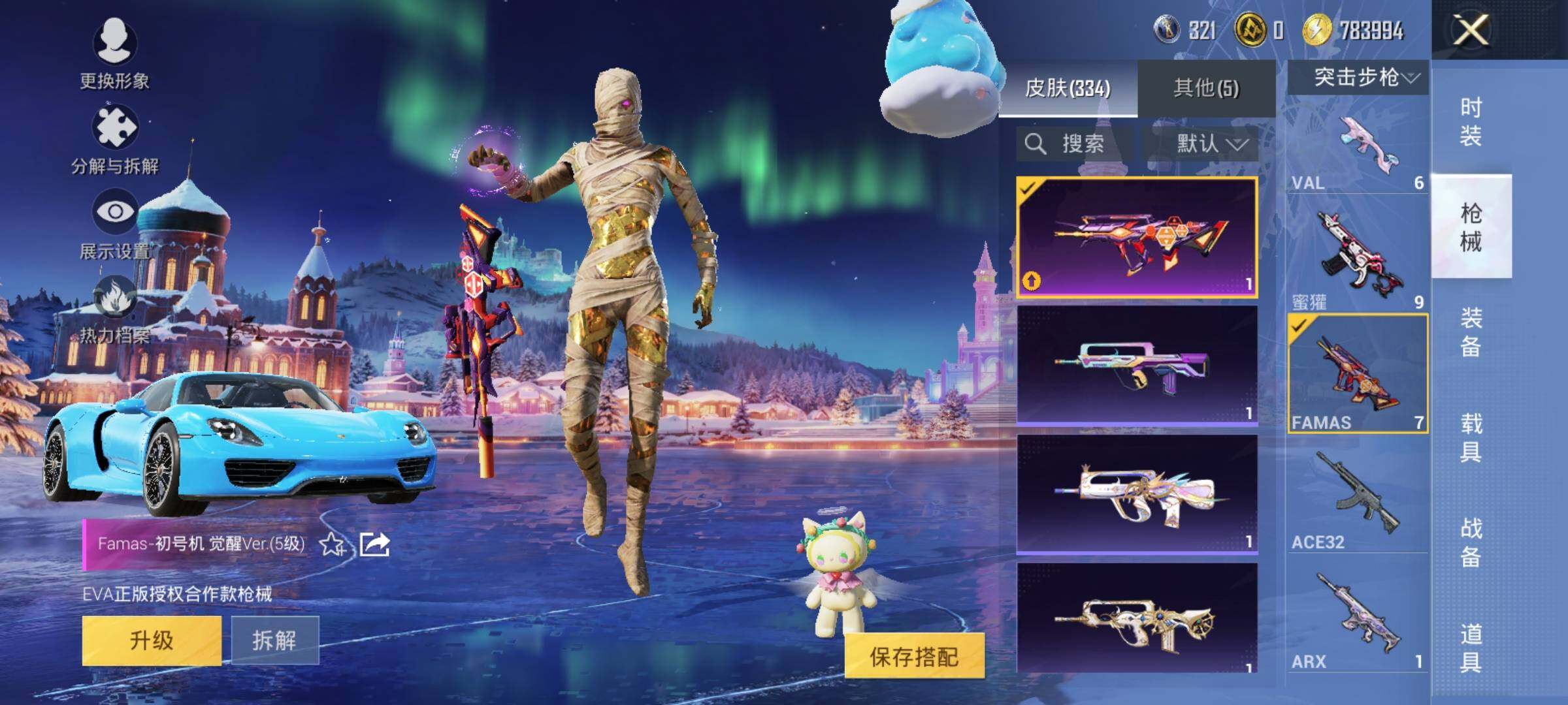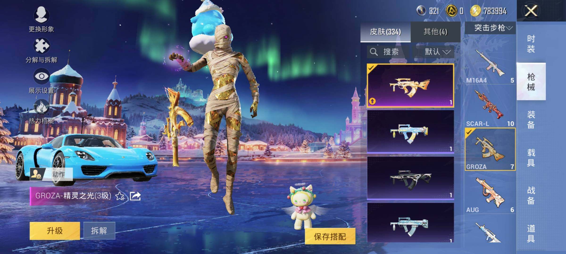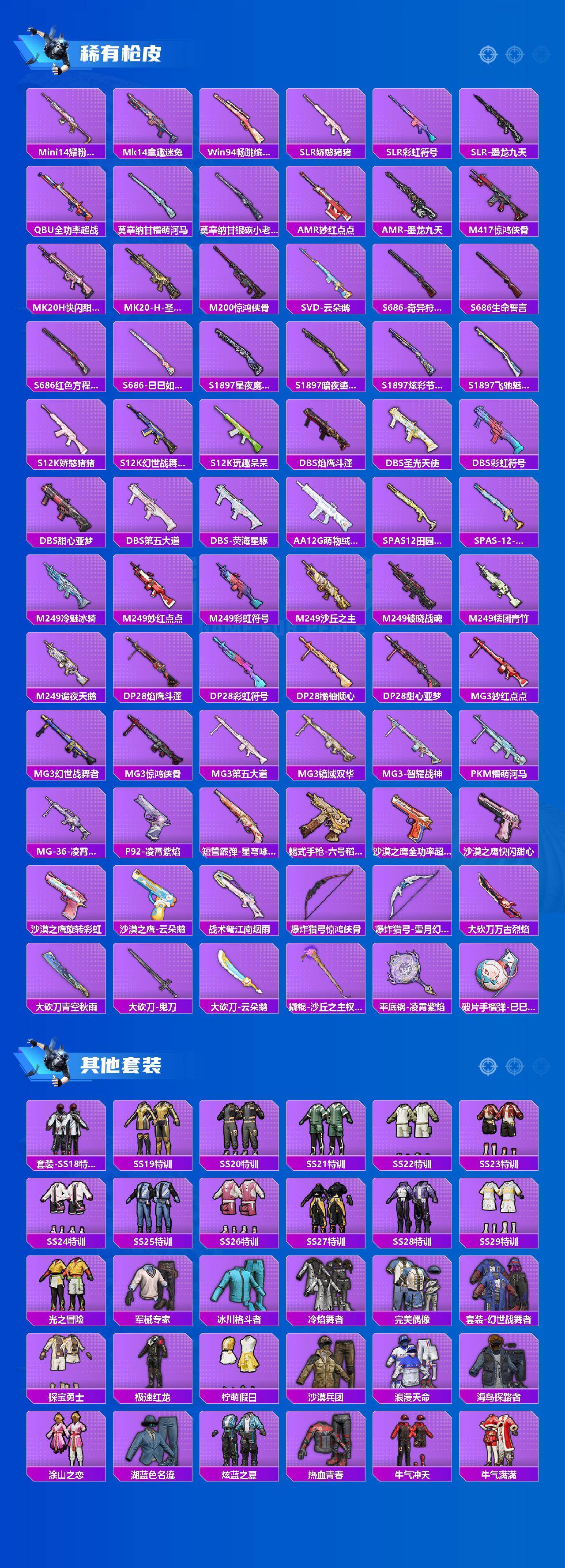 AKM-魔法神域,AKM-幽焰骑士,SCAR-L-锦绣绵绵,M416-全功率超战,M416-墨龙九天,GROZA-精灵之光,AUG-暖羊咩咩,Famas-觉醒初号机,Kar98K-创世·救赎,Kar98K-巳巳如意,M24-莲影清波,M24-镜域双华,Mk14-精灵梦叶罗丽,M417-第五大道,MK12-雪月幻音,MG3-洛神天依