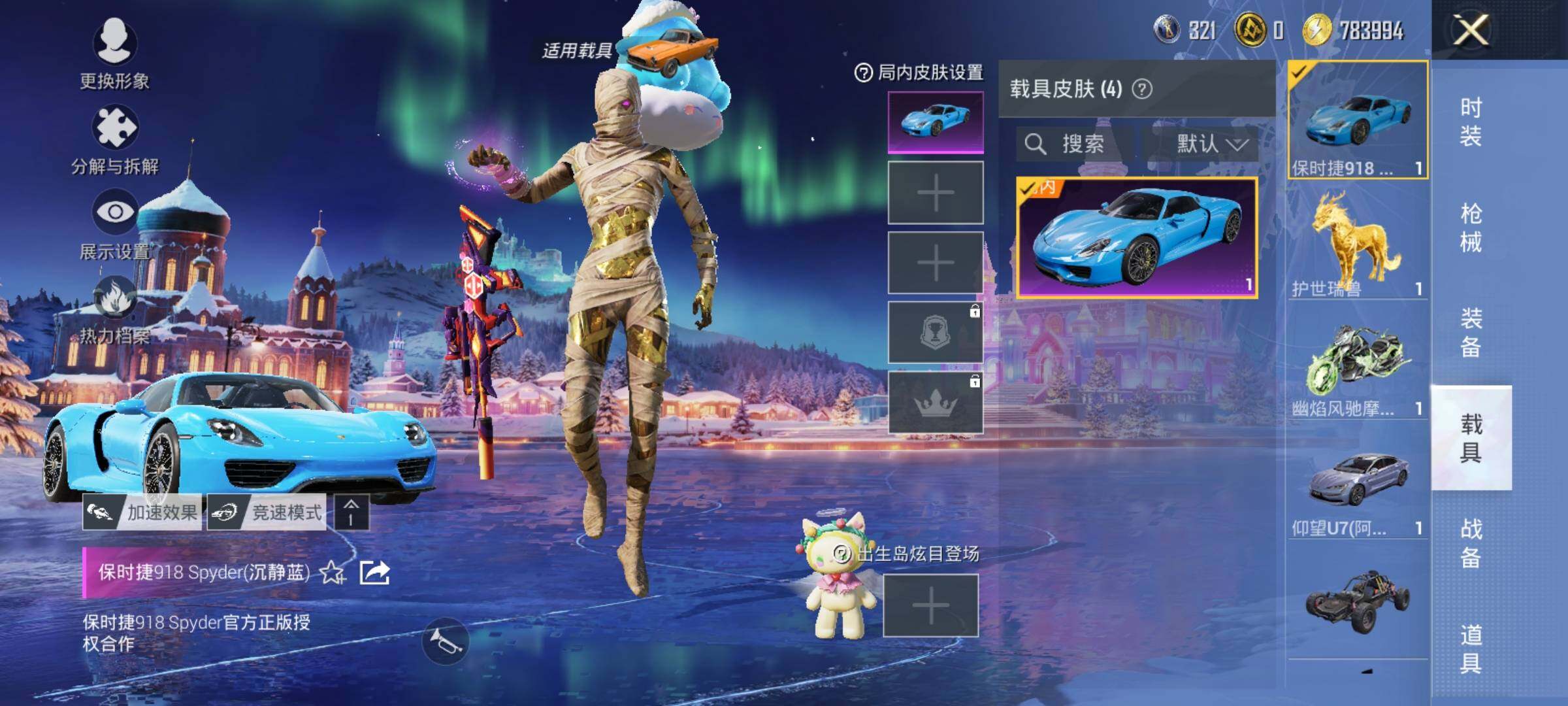 【粉色载具】:仰望U7(阿盖尔紫),保时捷918 Spyder(沉静蓝),幽焰风驰摩托车,僚机-冰龙团团,护世瑞兽