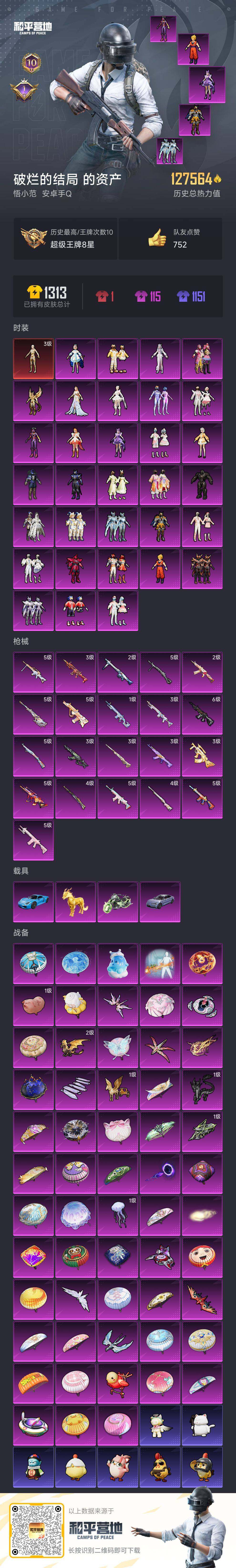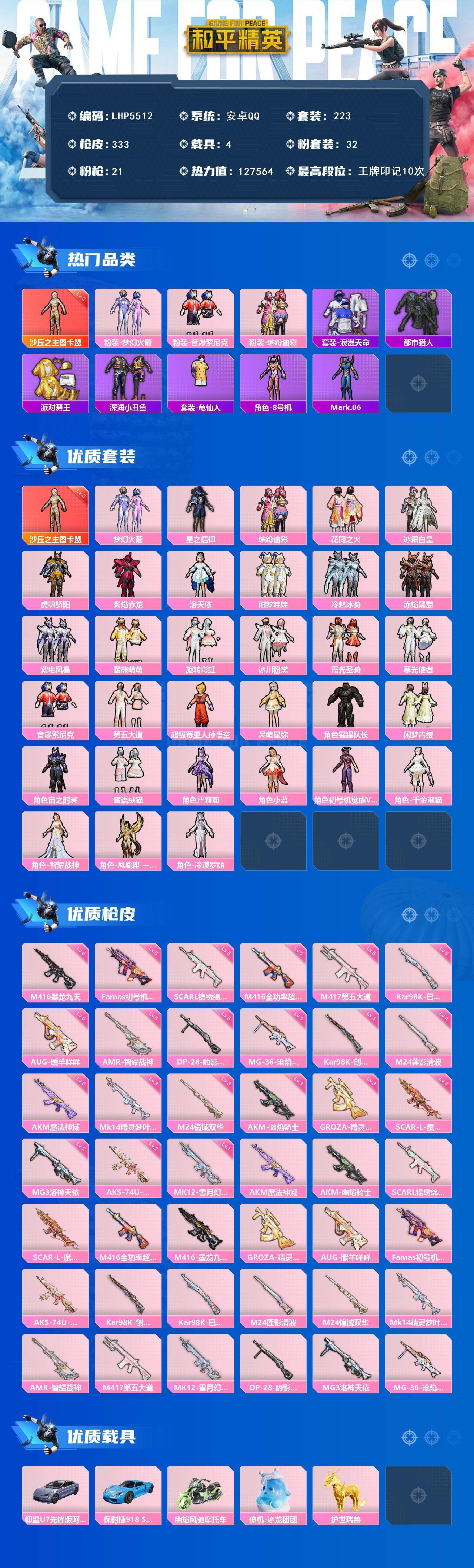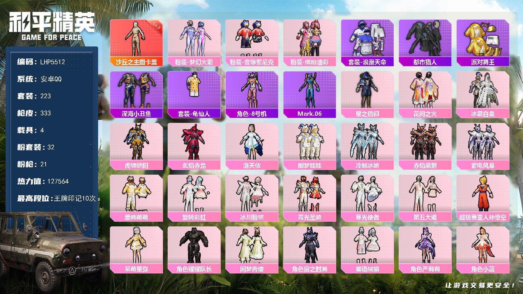 [15614590]【店主推荐捡漏号!可直接换绑】安卓 手Q-1神装-32粉装-21特效枪-4载具-19粉色飞行器-12.7w热力值-10王牌印记-223套装-333枪皮