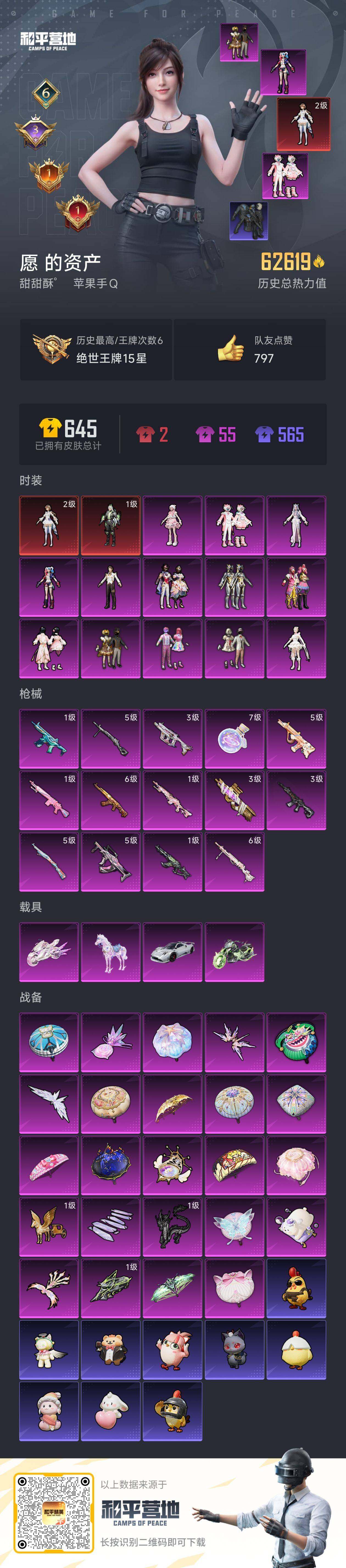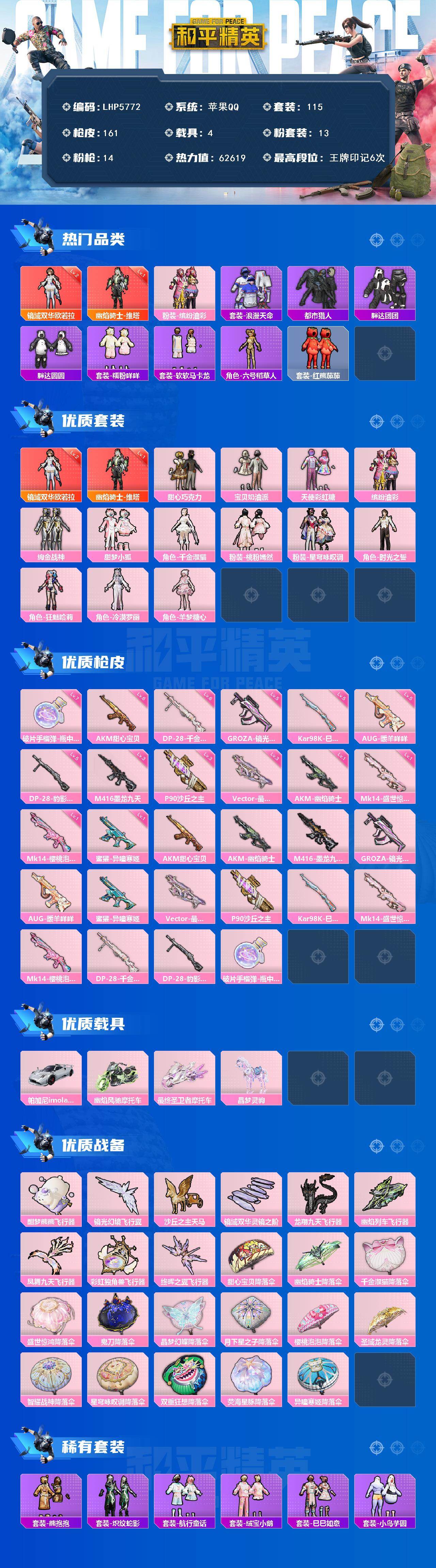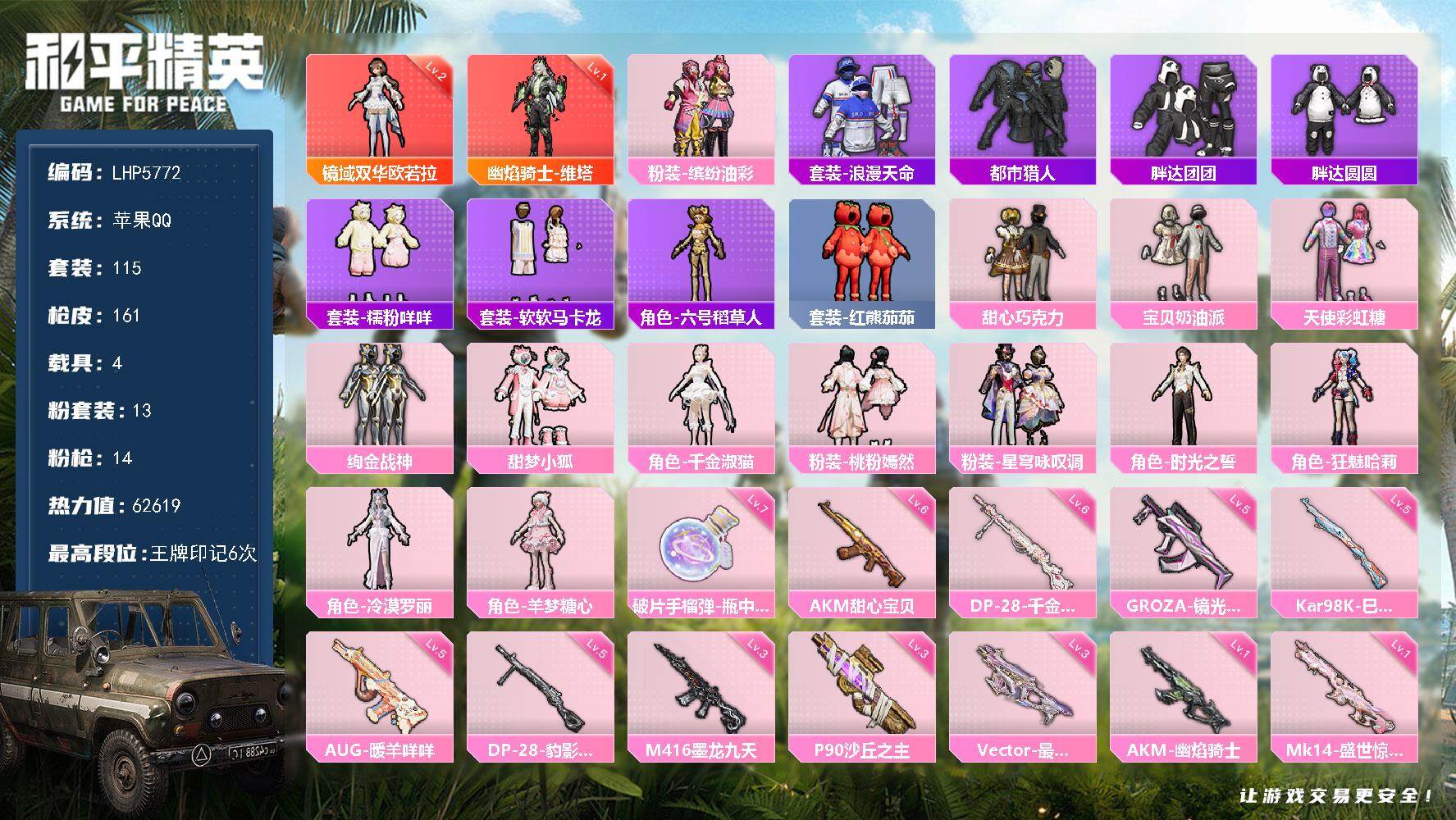 [15614610]【店主推荐捡漏号!可直接换绑】苹果 手Q-2神装-13粉装-14特效枪-4载具-10粉色飞行器-6.2w热力值-6王牌印记-115套装-161枪皮