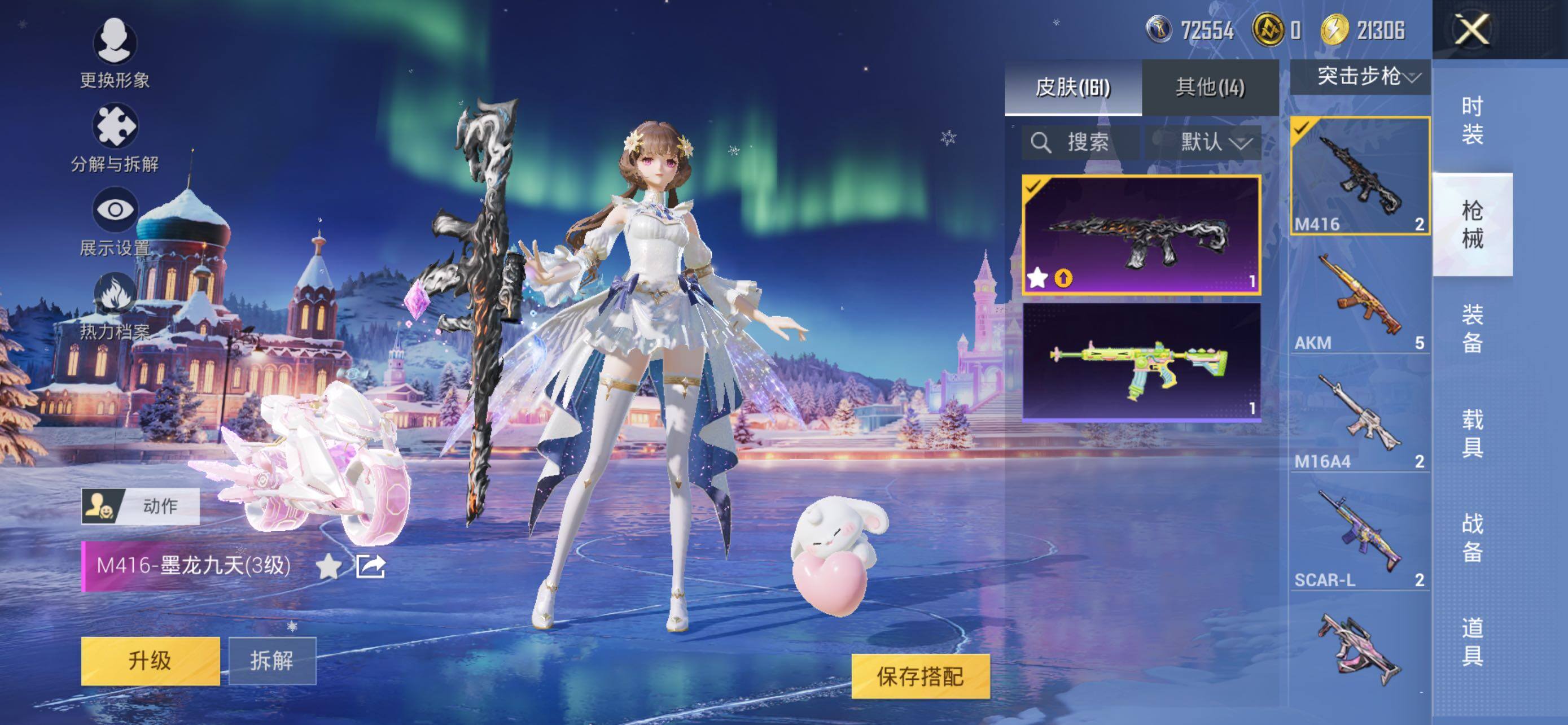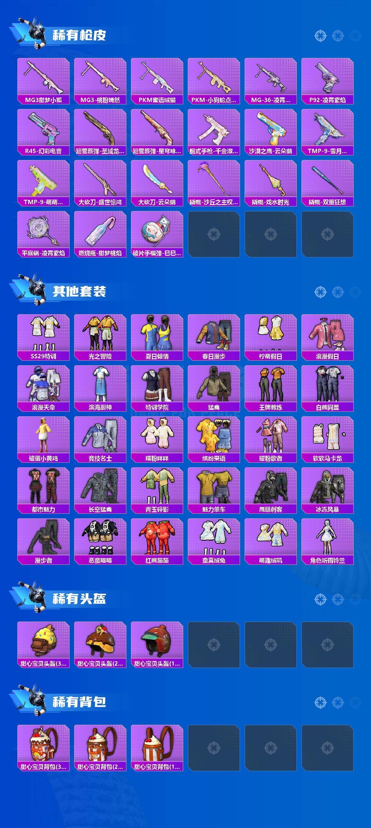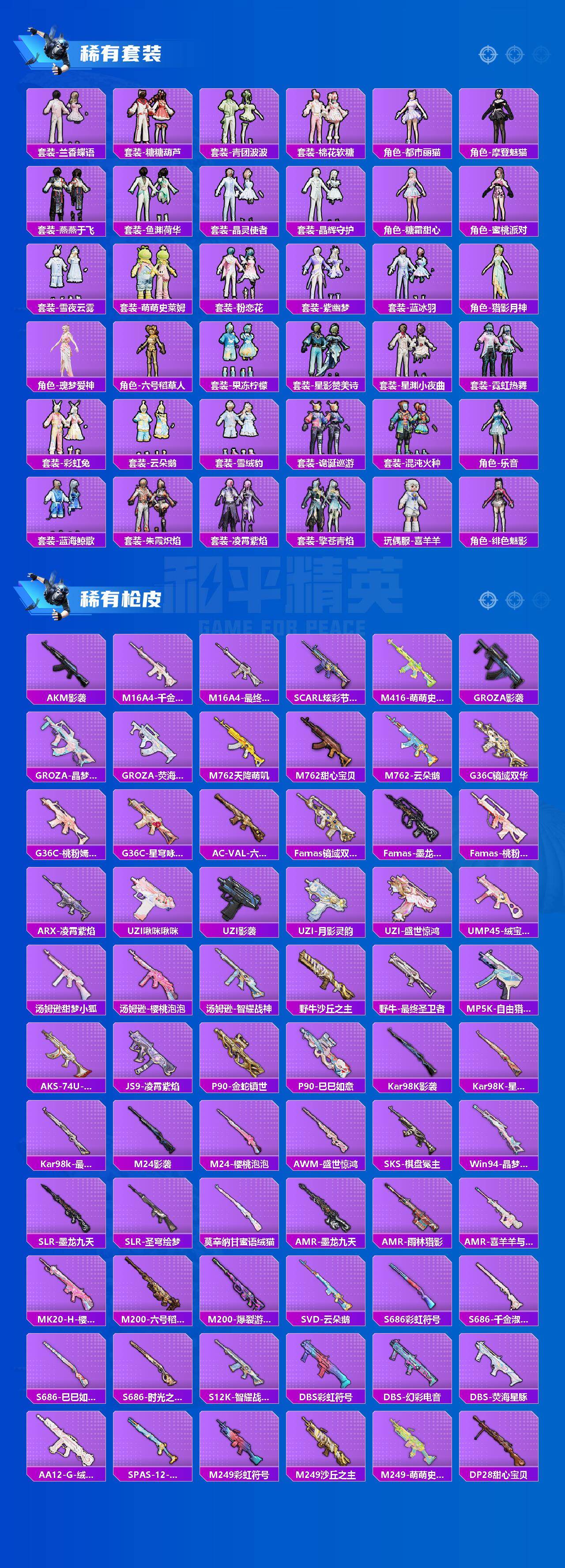 AKM-甜心宝贝,AKM-幽焰骑士,M416-墨龙九天,GROZA-镜光银凌,AUG-暖羊咩咩,P90-沙丘之主,Kar98K-巳巳如意,Mk14-盛世惊鸿,Mk14-樱桃泡泡,DP-28-千金淑猫