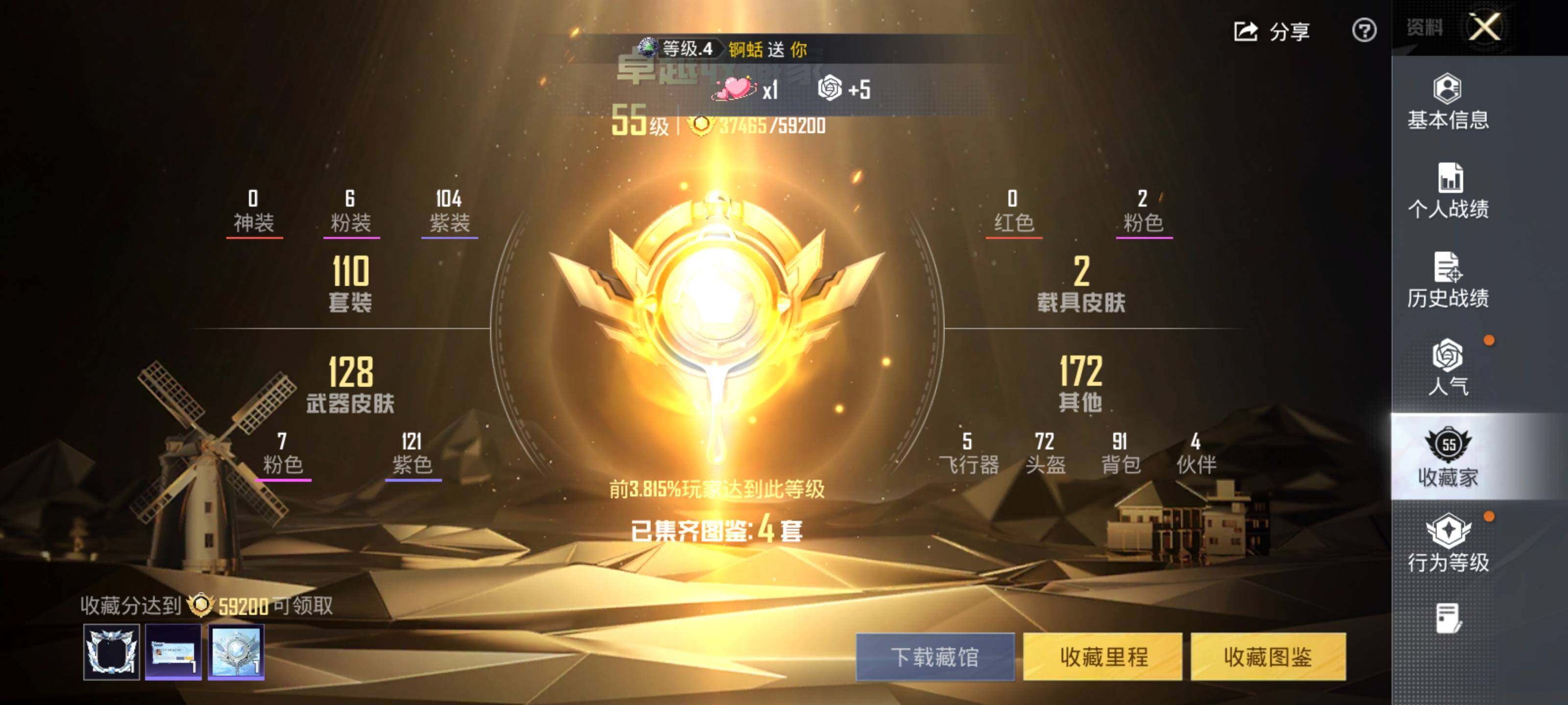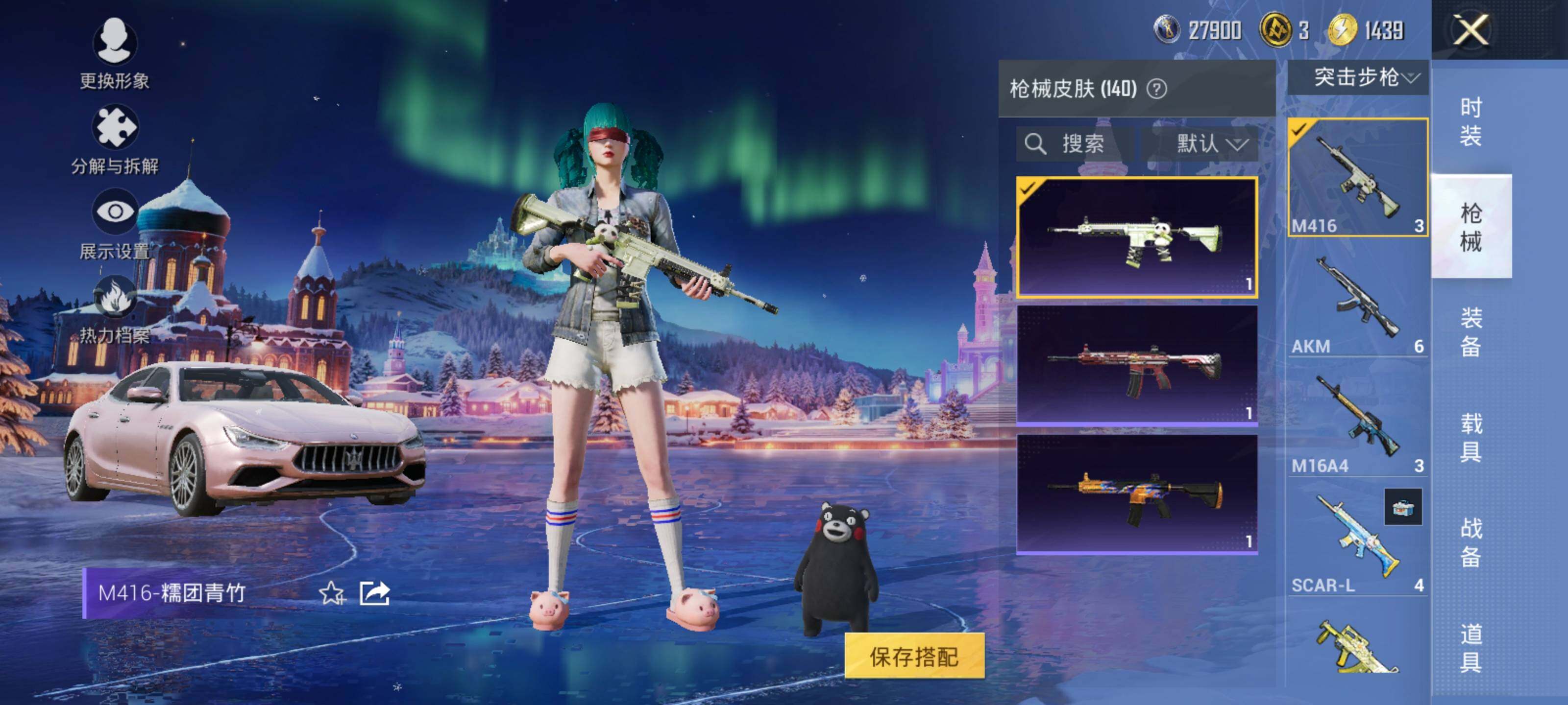 【粉色枪皮等级】:Kar98K-巳巳如意(五级),M24-翩跹演武(四级),SPAS-12-音爆索尼克(五级),M249-彩虹甜喵(四级),DP-28-豹影疾电(五级),MG-36-沧焰双生(五级)
