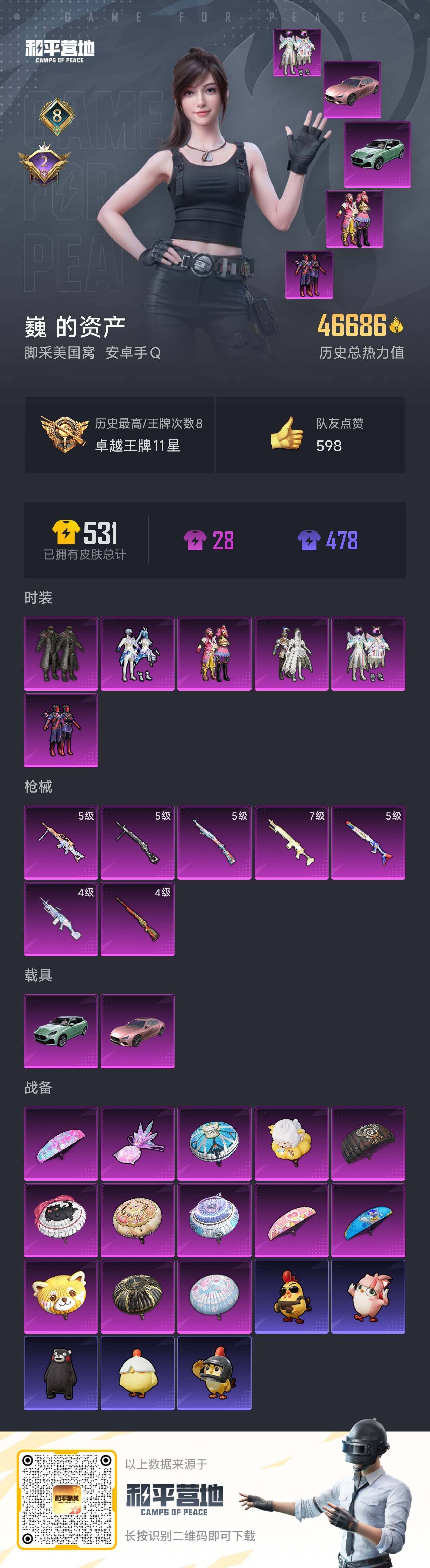 - PX_2103289- 安卓手Q-15王牌印记-14粉装-13特效枪-5载具-100019热力值-226套装-291枪皮-2卓越印记-0传奇印记 【14粉装】,第五大道,恐龙拽拽,木曜青龙,黄族统领,复仇流浪者,星云暗核,薄荷物语,海盐物语,樱桃泡泡,朗月武圣,冰霜白皇,炙焰红王,翡翠骑士,数码大师 【13特效枪】AKM-炫紫旋律-3级 AKM-绿萝繁花-5级 AKM-星际浪客-7级 SCAR-L