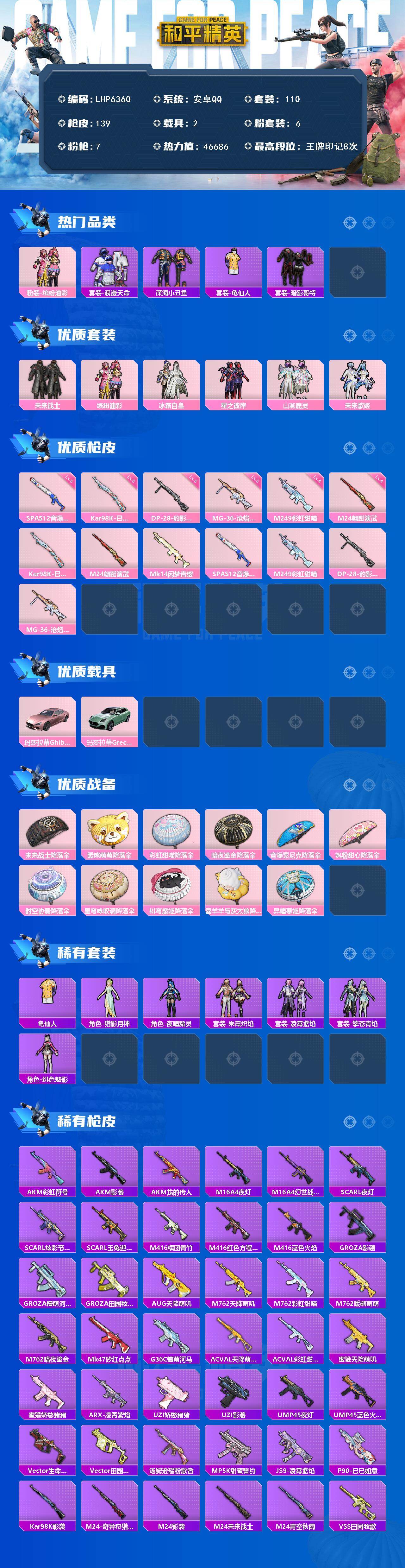 [15614646]【店主推荐捡漏号!可直接换绑】安卓 手Q-6粉装-7特效枪-2载具-1粉色飞行器-4.6w热力值-8王牌印记-110套装-139枪皮 【热门品类】:粉装-缤纷油彩,套装-浪漫天命,套装-深海小丑鱼,套装-龟仙人,套装-暗影哥特 【粉色套装】:粉装-未来战士,粉装-缤纷油彩,粉装-冰霜白皇,粉装-星之彼岸,粉装-山涧鹿灵,粉装-未来歌姬 【粉色枪皮等级】:Kar98K-巳巳如意(五级),M24-翩跹演武(四级),SPAS-12-音爆索尼克(五级),M249-彩虹甜喵(四级),DP-28-豹影疾电(五级),MG-36-沧焰双生(五级) 【粉色载具】:玛莎拉蒂Ghibli(粉),玛莎拉蒂Grecale(薄荷绿) 【粉色枪皮】:Kar98K-巳巳如意,M24-翩跹演武,Mk14-闲梦青缨,SPAS-12-音爆索尼克,M249-彩虹甜喵,DP-28-豹影疾电,MG-36-沧焰双生 【粉色降落伞】:未来战士降落伞,暖熊萌萌降落伞,彩虹甜喵降落伞,暗夜鎏金降落伞,音爆索尼克降落伞,飒粉甜心降落伞,时空协奏降落伞,星穹咏叹调降落伞,绯穹魔姬降落伞,喜羊羊与灰太狼降落伞,异瞳寒姬降落伞,炫彩糖果降落伞 【稀有套装】:套装-龟仙人,角色-猎影月神,角色-夜瞳黯灵,套装-朱霞炽焰,套装-凌霄紫焰,套装-擎苍青焰,角色-绯色魅影,套装-炫彩糖果 【稀有枪皮】:AKM-彩虹符号,AKM-影袭,AKM-龙的传人,M16A4-夜灯,M16A4-幻世战舞者,SCAR-L-夜灯,SCAR-L-炫彩节奏,SCAR-L-玉兔迎春,M416-糯团青竹,M416-红色方程式,M416-蓝色火焰,GROZA-影袭,GROZA-懵萌河马,GROZA-田园牧歌,AUG-天降萌叽,M762-天降萌叽,M762-彩虹甜喵,M762-暖熊萌萌,M762-暗夜鎏金,Mk47-妙红点点,G36C-懵萌河马,AC-VAL-天降萌叽,AC-VAL-彩虹甜喵,蜜獾-天降萌叽,蜜獾-娇憨猪猪,ARX-凌霄紫焰,UZI-娇憨猪猪,UZI-影袭,UMP45-夜灯,UMP45-蓝色火焰,Vector-生命誓言,Vector-田园牧歌,汤姆逊-耀粉歌者,MP5K-甜蜜誓约,JS9-凌霄紫焰,P90-巳巳如意,Kar98K-影袭,M24-影袭,M24-未来战士,M24-青空秋雨,M24-奇异狩猎者,VSS-田园牧歌,VSS-绿野极光,Mi
