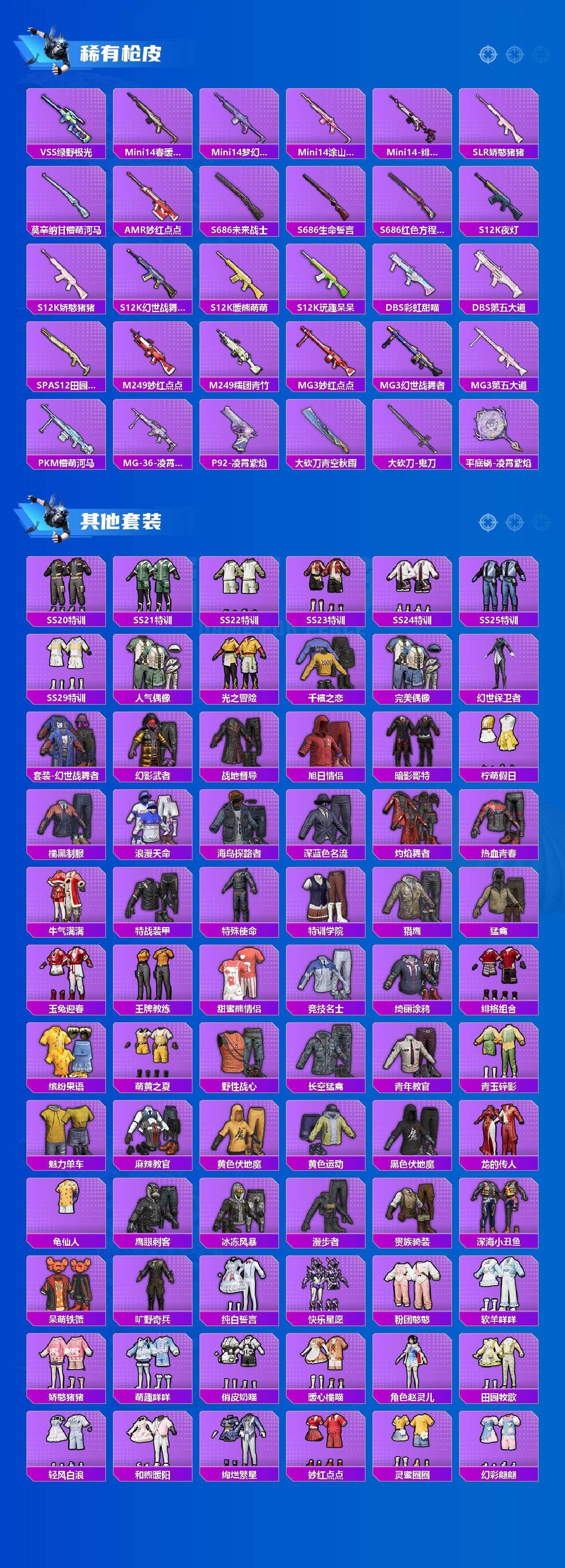 【稀有枪皮】:AKM-彩虹符号,AKM-影袭,AKM-龙的传人,M16A4-夜灯,M16A4-幻世战舞者,SCAR-L-夜灯,SCAR-L-炫彩节奏,SCAR-L-玉兔迎春,M416-糯团青竹,M416-红色方程式,M416-蓝色火焰,GROZA-影袭,GROZA-懵萌河马,GROZA-田园牧歌,AUG-天降萌叽,M762-天降萌叽,M762-彩虹甜喵,M762-暖熊萌萌,M762-暗夜鎏金,Mk47-妙红点点,G36C-懵萌河马,AC-VAL-天降萌叽,AC-VAL-彩虹甜喵,蜜獾-天降萌叽,蜜獾-娇憨猪猪,ARX-凌霄紫焰,UZI-娇憨猪猪,UZI-影袭,UMP45-夜灯,UMP45-蓝色火焰,Vector-生命誓言,Vector-田园牧歌,汤姆逊-耀粉歌者,MP5K-甜蜜誓约,JS9-凌霄紫焰,P90-巳巳如意,Kar98K-影袭,M24-影袭,M24-未来战士,M24-青空秋雨,M24-奇异狩猎者,VSS-田园牧歌,VSS-绿野极光,Mi