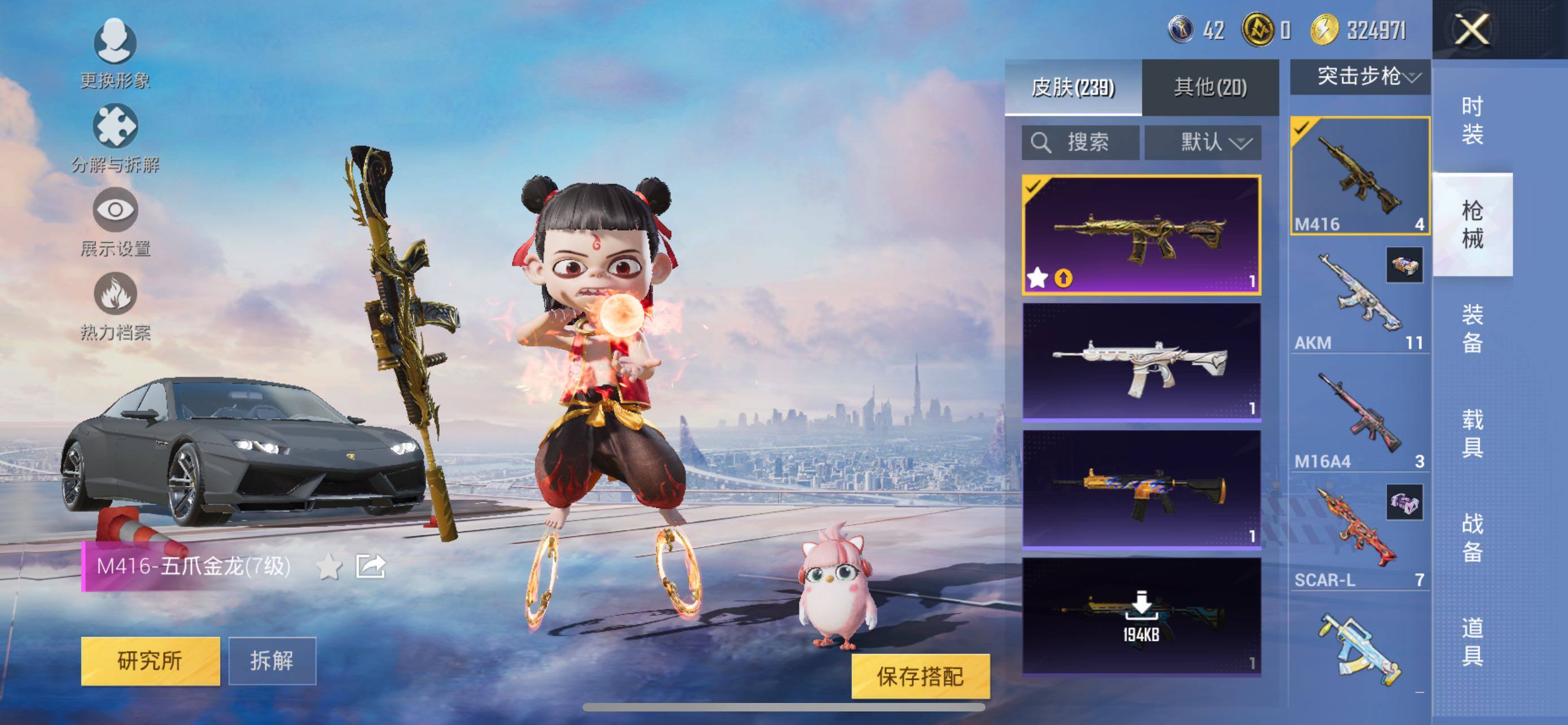 【粉色枪皮等级】:SCAR-L-锦绣绵绵(五级),SCAR-L-魔童闹海 哪吒(三级),M416-五爪金龙(七级),AUG-暖羊咩咩(五级),P90-魔童闹海 敖丙(三级),Kar98K-创世·救赎(七级),Kar98K-巳巳如意(五级),DP-28-豹影疾电(二级)