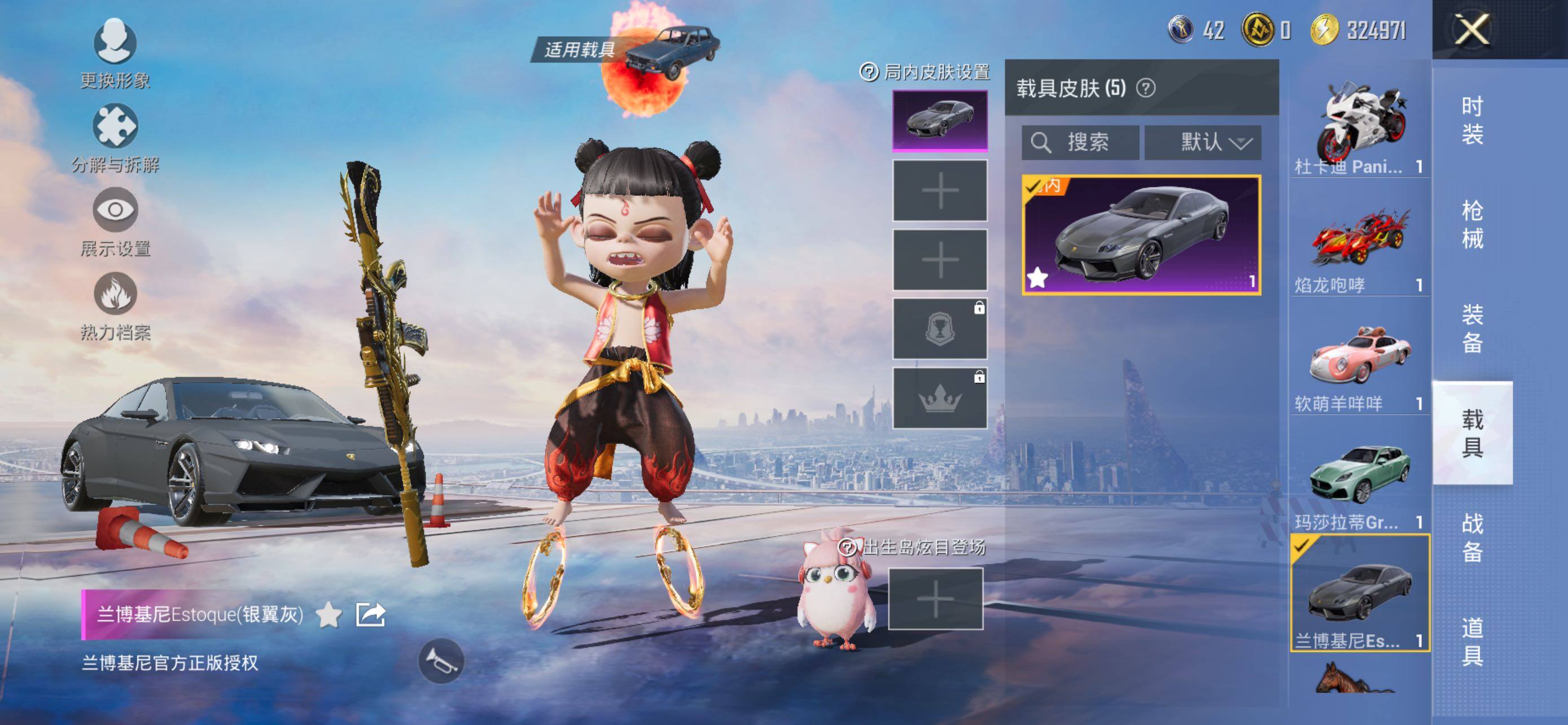 【粉色载具】:兰博基尼Estoque(银翼灰),玛莎拉蒂Grecale(薄荷绿),焰龙咆哮,软萌羊咩咩,杜卡迪 Panigale V4(星耀白)