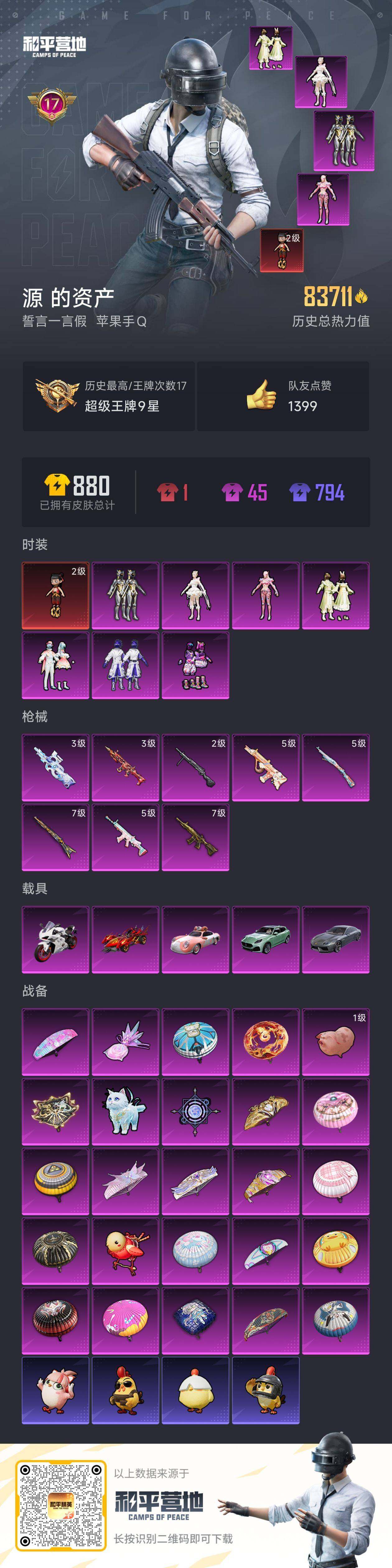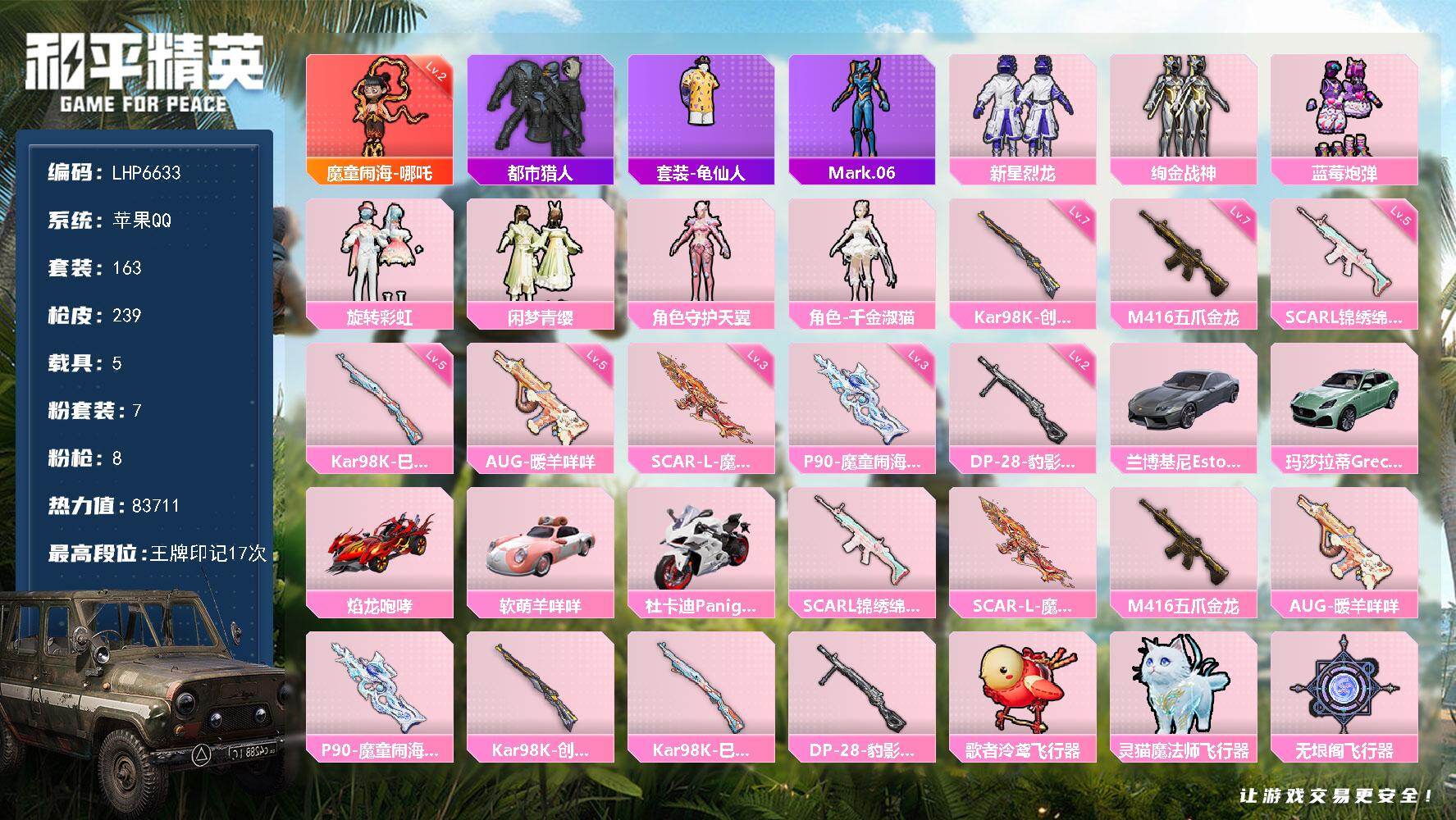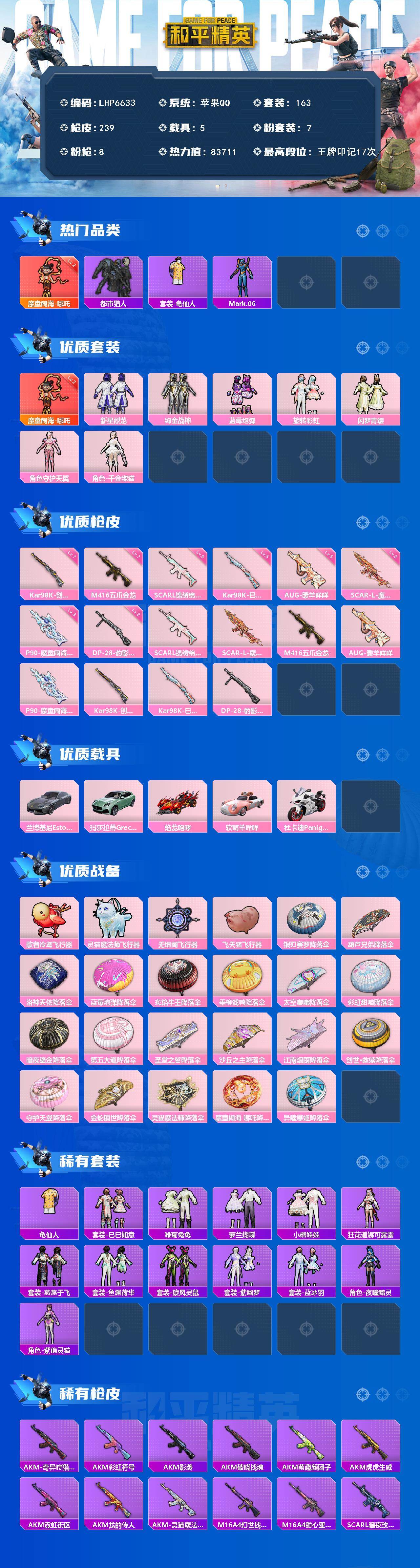 [15614715]【特价出售/店主推荐】苹果 手Q-1神装-7粉装-8特效枪-5载具-5粉色飞行器-8.3w热力值-17王牌印记-163套装-239枪皮