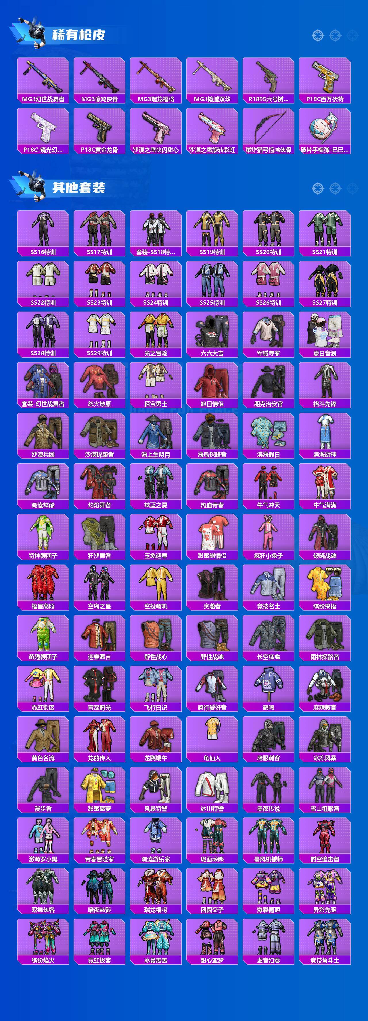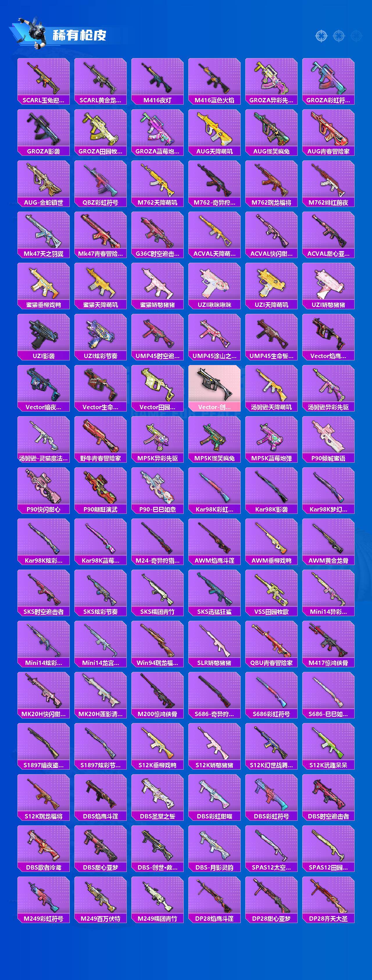 【稀有枪皮】:AUG-冰晶雪宝,AKM-奇异狩猎者,AKM-彩虹符号,AKM-影袭,AKM-破晓战魂,AKM-萌趣颜团子,AKM-虎虎生威,AKM-霓虹街区,AKM-龙的传人,AKM-灵猫魔法师,M16A4-幻世战舞者,M16A4-甜心亚梦,SCAR-L-暗夜玫瑰,SCAR-L-玉兔迎春,SCAR-L-黄金龙骨