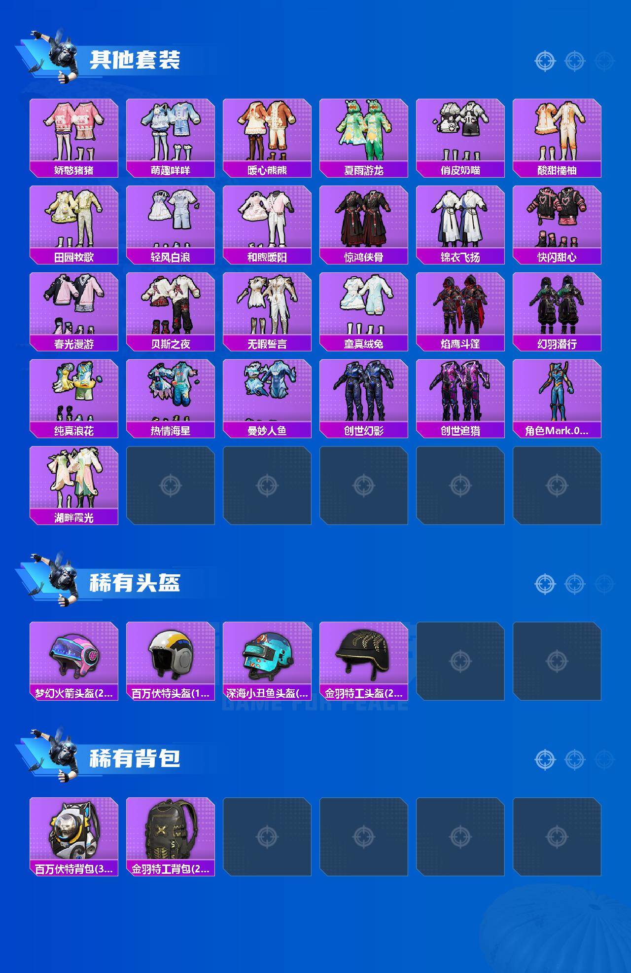 套装-都市猎人,套装-新星烈龙,套装-绚金战神,套装-蓝莓炮弹,套装-旋转彩虹,套装-闲梦青缨,角色-守护天翼,角色-千金淑猫,套装-鹰眼刺客