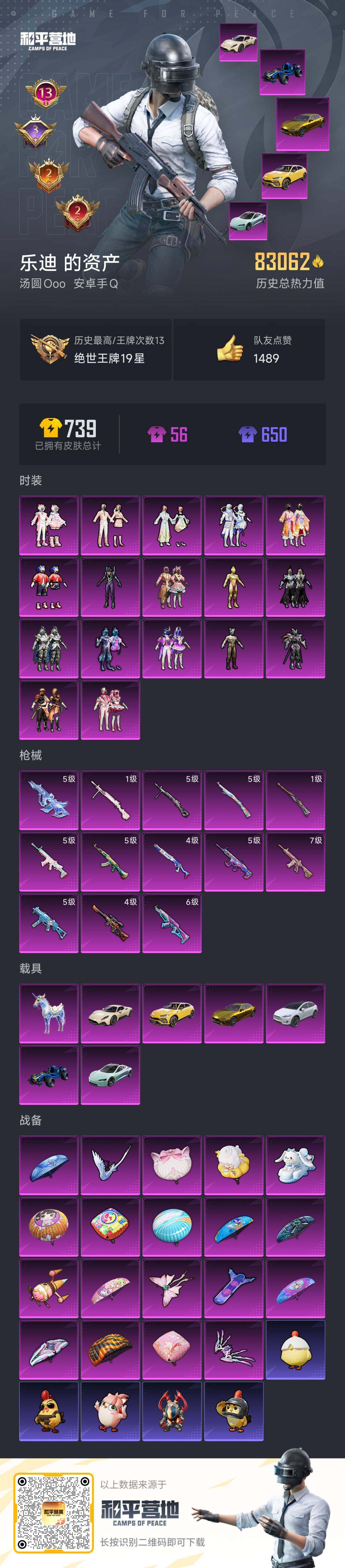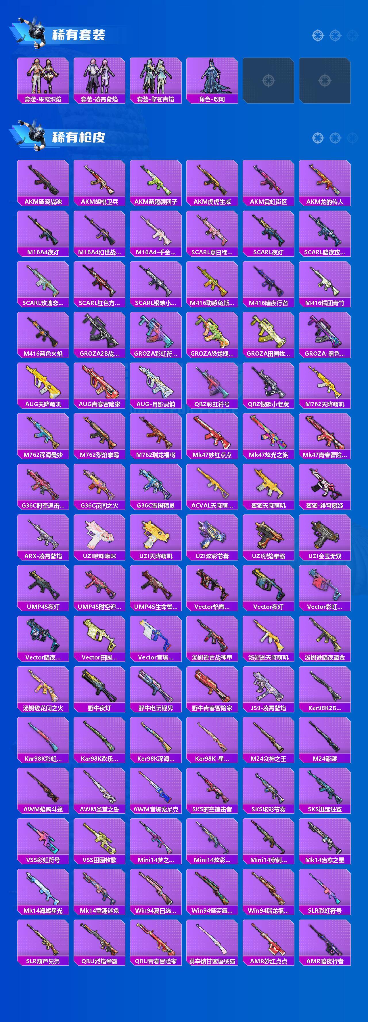 - [12039315]【暑期末清货/特价急出/永久包赔】:安卓 手Q-6粉装-7特效枪-2载具-4.9w热力值-5印记-121套装-164枪皮【热门品类】:M416-星际漫游【稀有载具】:路特斯ELETRE(冰川蓝),合金龙骨(蓝)【特效枪等级】:UZI-绮梦青鸾(五级),UMP45-恐龙拽拽(六级),汤姆逊-热量炸弹(五级),Kar98K-巳巳如意(五级),Mk14-甜梦熊击(五级),DP-28-豹影疾电(五级),MG-36-幻彩电音(五级)【优质套装】:粉装-梦幻火箭,粉装-天禅智恒,粉装-彗云及圣,粉装-炙焰红王,粉装-天之羽翼,角色-绯穹魔姬【优质飞行器】:梦幻火箭飞行器,天之羽翼飞行器