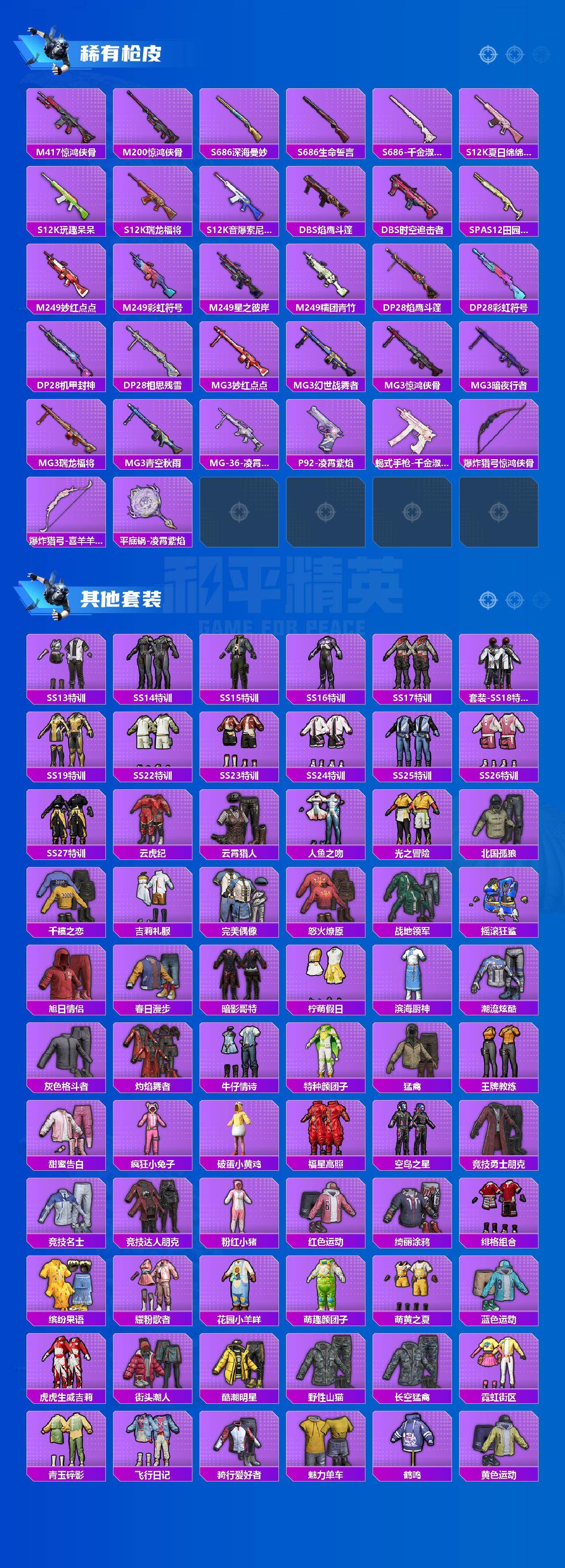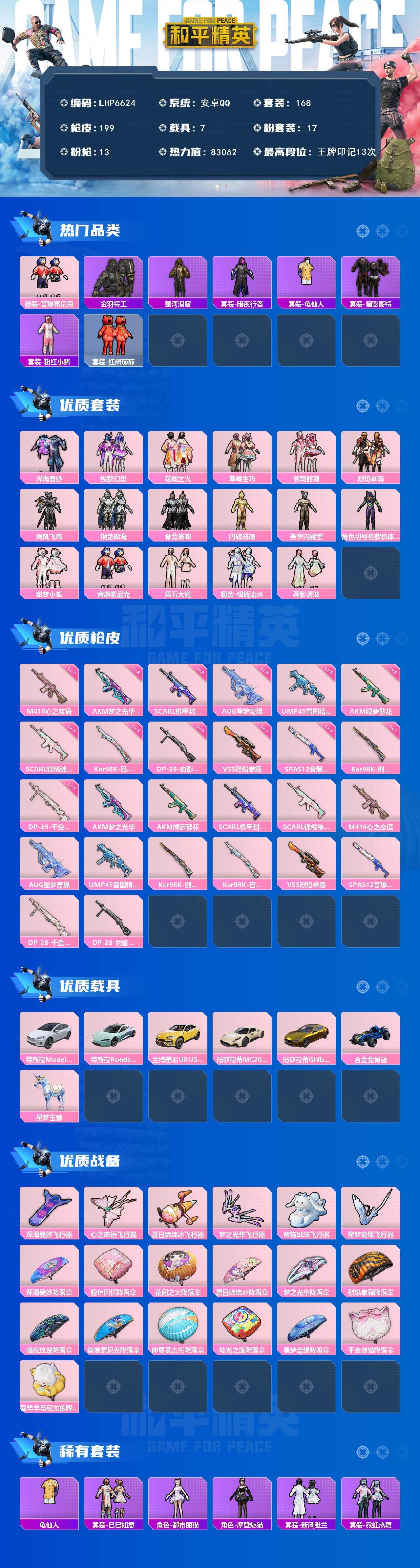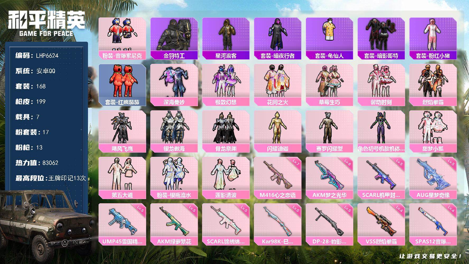 [15614722]【店主推荐捡漏号!可直接换绑】安卓 手Q-17粉装-13特效枪-7载具-6粉色飞行器-8.3w热力值-13王牌印记-168套装-199枪皮 【热门品类】:粉装-音爆索尼克,套装-金羽特工,套装-星河浪客,套装-暗夜行者,套装-龟仙人,套装-暗影哥特,套装-粉红小猪,套装-红熊茄茄 【粉色套装】:粉装-深海曼妙,粉装-极致幻想,粉装-花间之火,粉装-草莓生巧,粉装-馨动时刻,粉装-烈焰拳霸,粉装-飓风飞鹰,粉装-银龙傲海,粉装-骨龙祭渊,角色-闪耀迪迦,角色-赛罗闪耀型,角色-初号机款机体服,粉装-甜梦小狐,粉装-音爆索尼克,粉装-第五大道,粉装-银瓶流水,粉装-莲影清波 【粉色枪皮等级】:AKM-梦之光华(六级),AKM-绿萝繁花(五级),SCAR-L-机甲封神(五级),SCAR-L-锦绣绵绵(五级),M416-心之恋语(七级),AUG-星梦奇缘(五级),UMP45-雪国精灵(五级),Kar98K-创世·救赎(一级),Kar98K-巳巳如意(五级),VSS-烈焰拳霸(四级),SPAS-12-音爆索尼克(四级),DP-28-千金淑猫(一级),DP-28-豹影疾电(五级) 【粉色载具】:特斯拉Model X(珍珠白),特斯拉Roadster(水滴蓝),兰博基尼URUS(明艳黄),玛莎拉蒂MC20(星石白),玛莎拉蒂Ghibli(金),合金龙骨(蓝),星梦玉骢 【粉色枪皮】:AKM-梦之光华,AKM-绿萝繁花,SCAR-L-机甲封神,SCAR-L-锦绣绵绵,M416-心之恋语,AUG-星梦奇缘,UMP45-雪国精灵,Kar98K-创世·救赎,Kar98K-巳巳如意,VSS-烈焰拳霸,SPAS-12-音爆索尼克,DP-28-千金淑猫,DP-28-豹影疾电 【粉色飞行器】:深海曼妙飞行器,心之恋语飞行翼,夏日绵绵冰飞行器,梦之光华飞行器,萌物绒绒飞行器,星梦奇缘飞行器 【粉色降落伞】:深海曼妙降落伞,粉色回忆降落伞,花间之火降落伞,夏日绵绵冰降落伞,梦之光华降落伞,烈焰拳霸降落伞,暗夜玫瑰降落伞,音爆索尼克降落伞,仲夏莫吉托降落伞,炫光之旅降落伞,星梦奇缘降落伞,千金淑猫降落伞,喜羊羊与灰太狼降落伞 【稀有套装】:套装-龟仙人,套装-巳巳如意,角色-都市丽猫,角色-摩登魅猫,套装-新风雅兰,套装-霓虹热舞,套装-朱霞炽焰,套装-凌霄紫焰,套装-擎苍青焰,角色-敖闰 【稀有枪