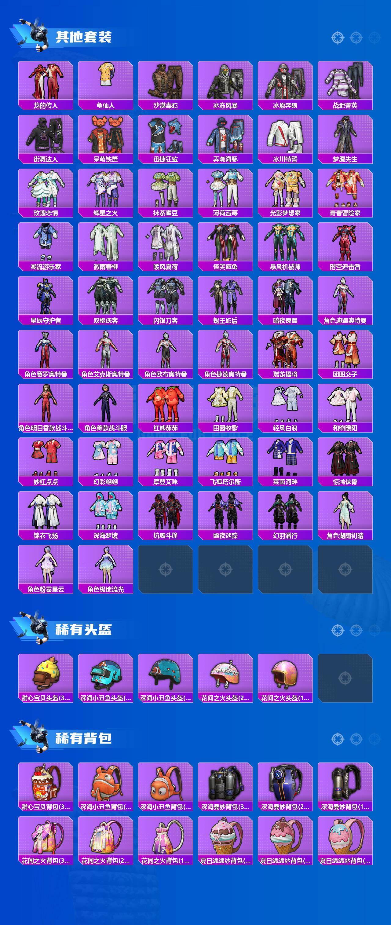 套装-音爆索尼克,套装-暗夜行者,套装-深海曼妙,套装-极致幻想,套装-花间之火,套装-草莓生巧,套装-馨动时刻,套装-烈焰拳霸,套装-飓风飞鹰,套装-银龙傲海,套装-骨龙祭渊,角色-闪耀迪迦,角色-赛罗闪耀型,角色-初号机款机体服,套装-甜梦小狐,套装-第五大道,套装-银瓶流水,套装-莲影清波,套装-呆萌铁蟹,套装-迅捷狂鲨,套装-梦魇先生