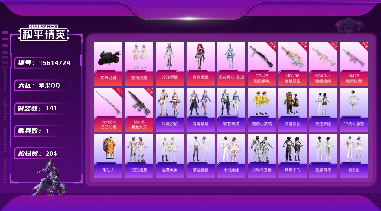 [15614724]【特价出售/店主推荐】苹果 手Q-4粉装-6特效枪-1载具-7粉色飞行器-6.4w热力值-10王牌印记-141套装-204枪皮