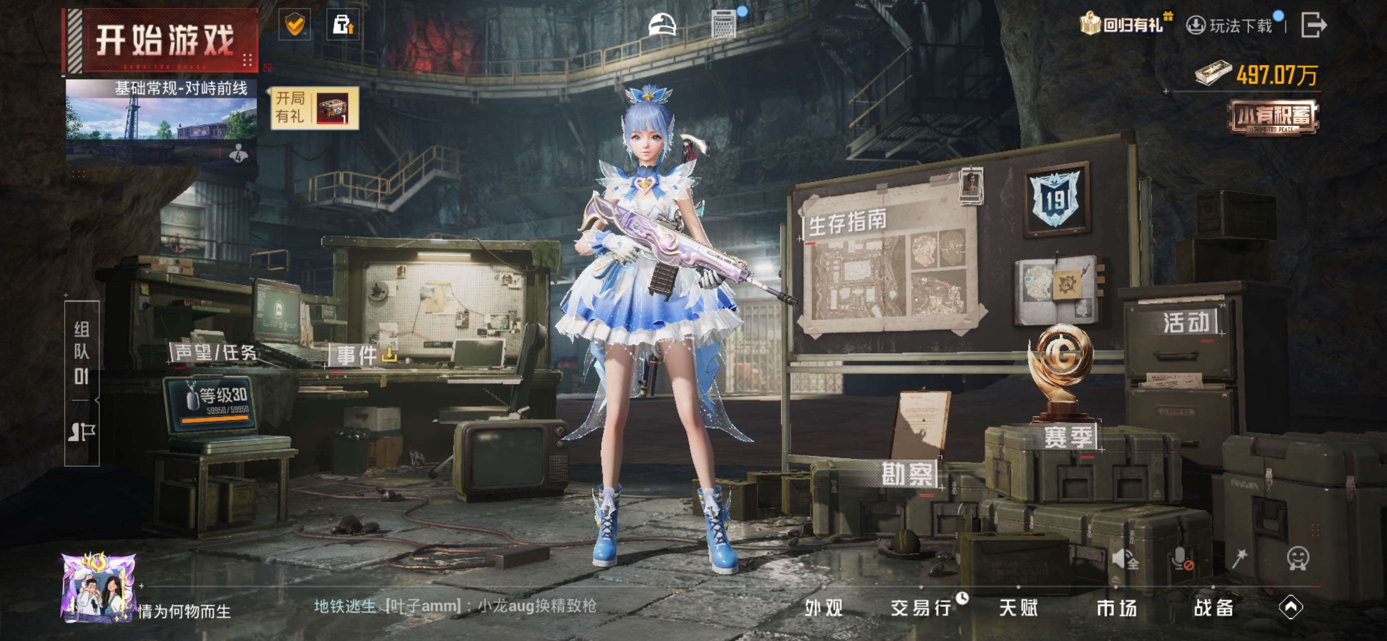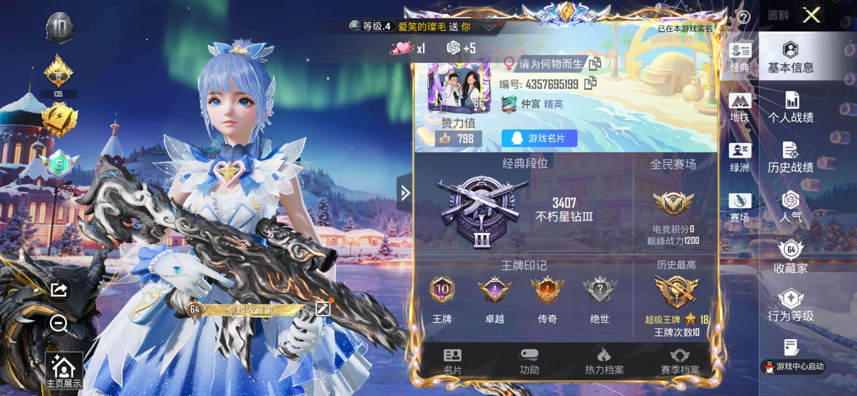 - PX_2095719-实名: 可修改 时装数: 810 载具数: 2 枪械数: 297 战备数: 195 热门装扮: 奇异狩猎者,极限特训,宝贝奶油派,天使彩虹糖,鹰眼刺客,智能音符,都市猎人,冰霜白皇,复仇流浪者,浪客战士,诡夜天鹅,第五大道 载具: 玛莎拉蒂Ghibli(蓝),鬼马风驰 稀有枪皮: M416五爪金龙,M416风花雪月,SCAR-L青春物语,Kar98K-巳巳如意