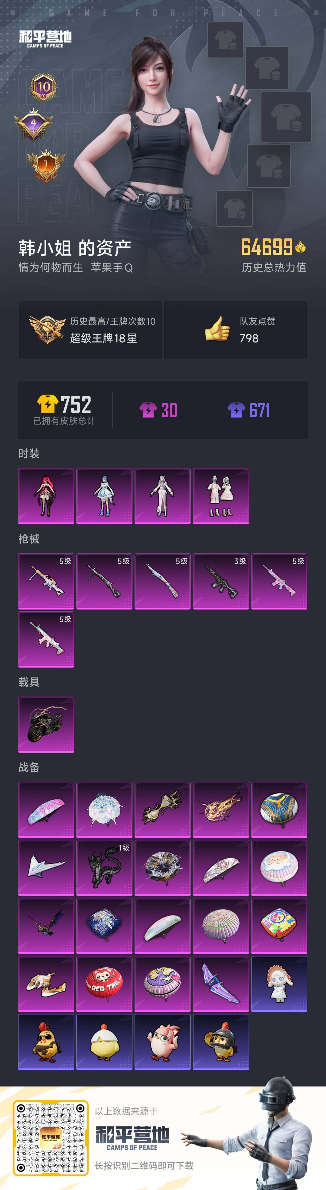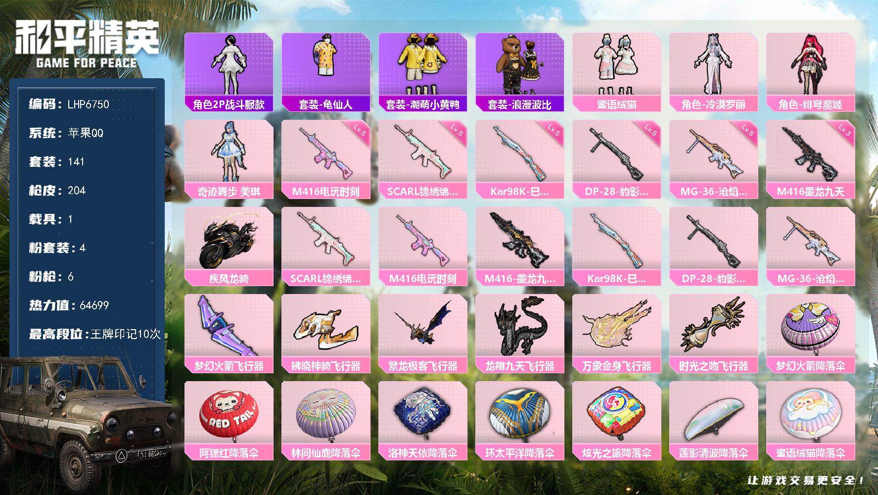 [15614724]【特价出售/店主推荐】苹果 手Q-4粉装-6特效枪-1载具-7粉色飞行器-6.4w热力值-10王牌印记-141套装-204枪皮 【热门品类】:角色-2P战斗服款,套装-龟仙人,套装-潮萌小黄鸭,套装-浪漫波比 【粉色套装】:粉装-蜜语绒猫,角色-冷漠罗丽,角色-绯穹魔姬,角色-奇迹舞步 美琪 【粉色枪皮等级】:SCAR-L-锦绣绵绵(五级),M416-电玩时刻(五级),M416-墨龙九天(三级),Kar98K-巳巳如意(五级),DP-28-豹影疾电(五级),MG-36-沧焰双生(五级) 【粉色载具】:疾风龙骑 【粉色枪皮】:SCAR-L-锦绣绵绵,M416-电玩时刻,M416-墨龙九天,Kar98K-巳巳如意,DP-28-豹影疾电,MG-36-沧焰双生 【粉色飞行器】:梦幻火箭飞行器,拂晓神骑飞行器,繁龙极客飞行器,龙翔九天飞行器,万象金身飞行器,时光之吻飞行器 【粉色降落伞】:梦幻火箭降落伞,阿狸红降落伞,林间仙鹿降落伞,洛神天依降落伞,环太平洋降落伞,炫光之旅降落伞,莲影清波降落伞,蜜语绒猫降落伞,精灵梦叶罗丽降落伞,墨龙九天降落伞,无垠阁降落伞,炫彩糖果降落伞 【稀有套装】:套装-龟仙人,套装-巳巳如意,套装-雏菊兔兔,套装-萝兰蝴蝶,套装-小熊娃娃,套装-火种守卫者,套装-燕燕于飞,套装-鱼渊荷华,套装-粉恋花,套装-紫幽梦,套装-蓝冰羽,角色-猎影月神,套装-彩虹兔,套装-云朵鹅,套装-雪绒豹,套装-蜜露汐语,套装-朱霞炽焰,套装-凌霄紫焰,套装-擎苍青焰 【稀有枪皮】:AKM-2P战斗服款,AKM-夜灯,AKM-江南烟雨,AKM-霓虹街区,AKM-龙的传人,SCAR-L-炫彩节奏,SCAR-L-甜蜜旋律,M416-糯团青竹,M416-绯红前夜,GROZA-2B战斗服款,GROZA-林间仙鹿,GROZA-治愈之星,AUG-2P战斗服款,AUG-耀粉歌者,QBZ-原初圣火,QBZ-洛神天依,M762-奇异狩猎者,M762-牛气冲天,M762-云朵鹅,Mk47-林间仙鹿,Mk47-洛神天依,G36C-镜域双华,G36C-不夜海上花,AC-VAL-快闪甜心,Famas-墨龙九天,ARX-凌霄紫焰,UZI-啾咪啾咪,UMP45-炫光之旅,UMP45-生命誓言,Vector-焰鹰斗篷,Vector-彩虹符号,Vector-治愈之星,Vector-生命誓言,汤姆逊-