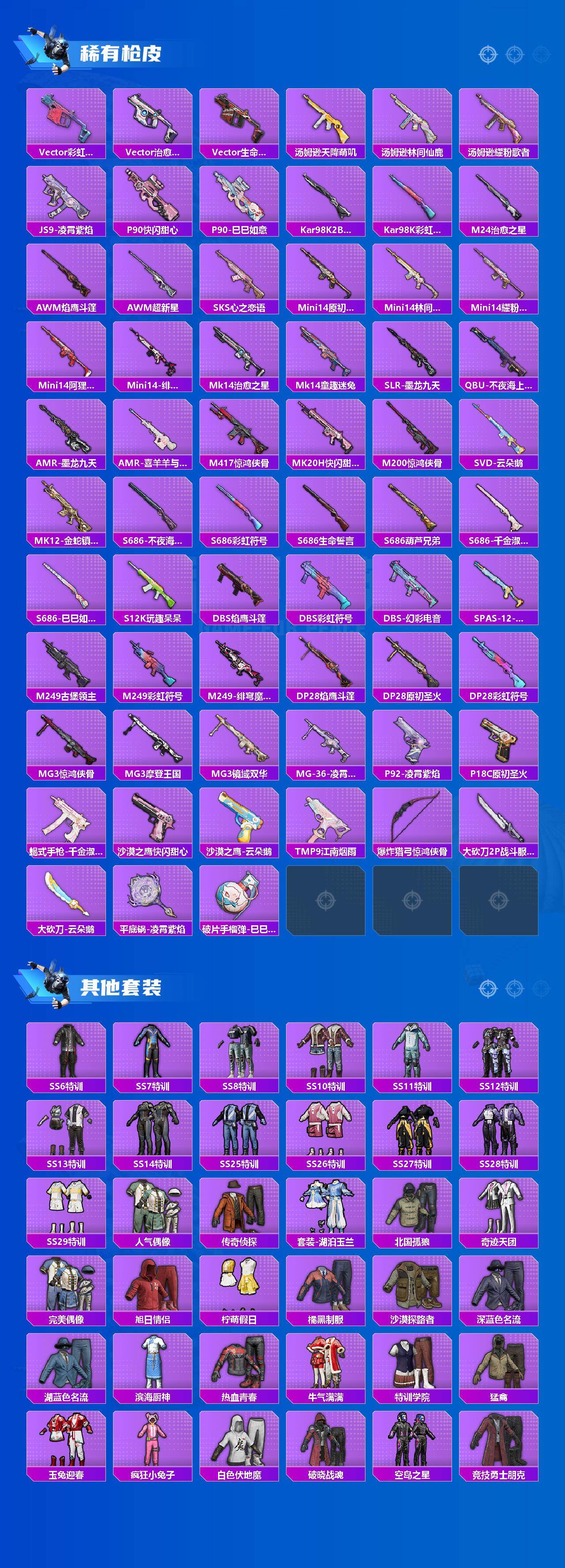 【稀有枪皮】:AKM-2P战斗服款,AKM-夜灯,AKM-江南烟雨,AKM-霓虹街区,AKM-龙的传人,SCAR-L-炫彩节奏,SCAR-L-甜蜜旋律,M416-糯团青竹,M416-绯红前夜,GROZA-2B战斗服款,GROZA-林间仙鹿,GROZA-治愈之星,AUG-2P战斗服款,AUG-耀粉歌者,QBZ-原初圣火,QBZ-洛神天依,M762-奇异狩猎者,M762-牛气冲天,M762-云朵鹅,Mk47-林间仙鹿,Mk47-洛神天依,G36C-镜域双华,G36C-不夜海上花,AC-VAL-快闪甜心,Famas-墨龙九天,ARX-凌霄紫焰,UZI-啾咪啾咪,UMP45-炫光之旅,UMP45-生命誓言,Vector-焰鹰斗篷,Vector-彩虹符号,Vector-治愈之星,Vector-生命誓言,汤姆逊-