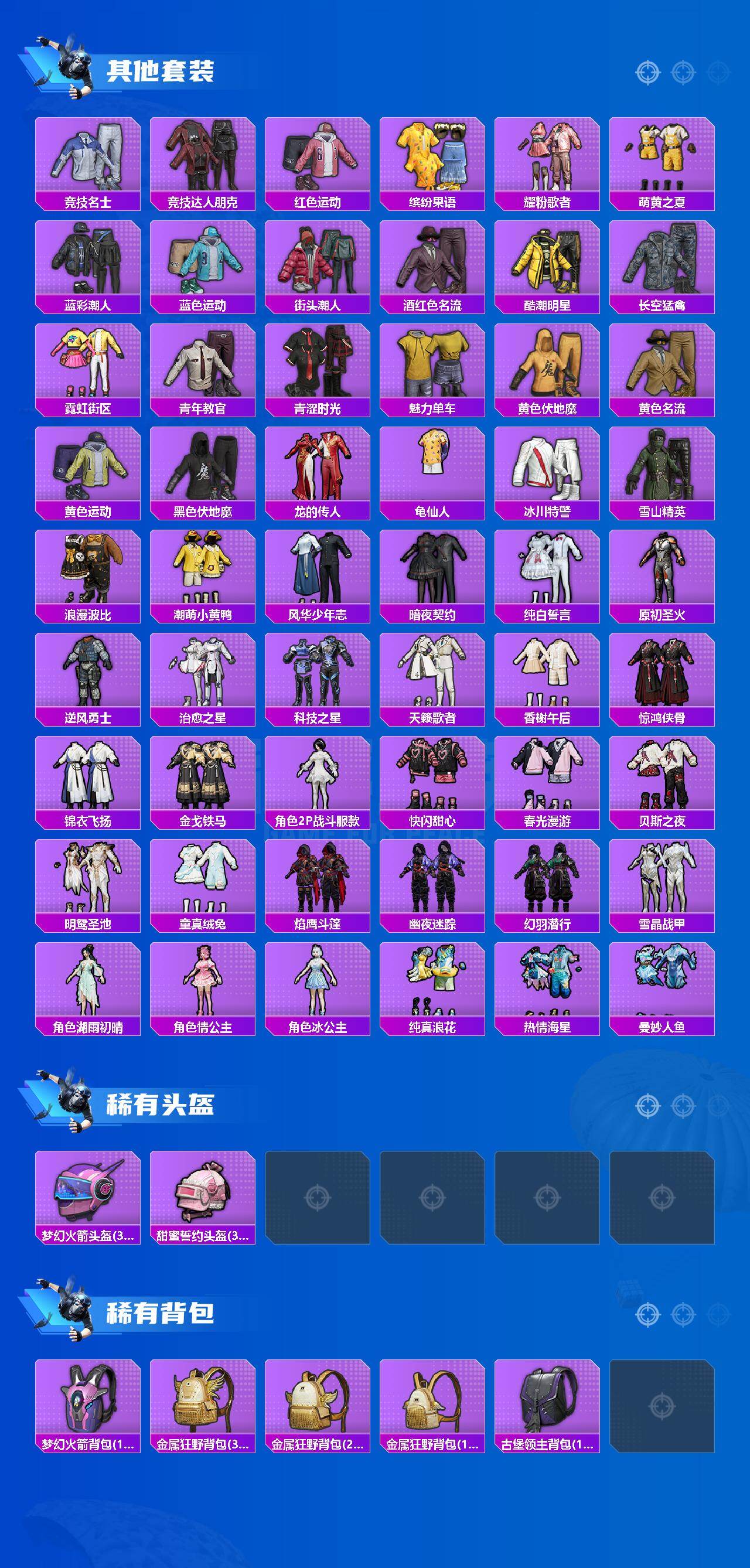【稀有套装】:套装-龟仙人,套装-巳巳如意,套装-雏菊兔兔,套装-萝兰蝴蝶,套装-小熊娃娃,套装-火种守卫者,套装-燕燕于飞,套装-鱼渊荷华,套装-粉恋花,套装-紫幽梦,套装-蓝冰羽,角色-猎影月神,套装-彩虹兔,套装-云朵鹅,套装-雪绒豹,套装-蜜露汐语,套装-朱霞炽焰,套装-凌霄紫焰,套装-擎苍青焰