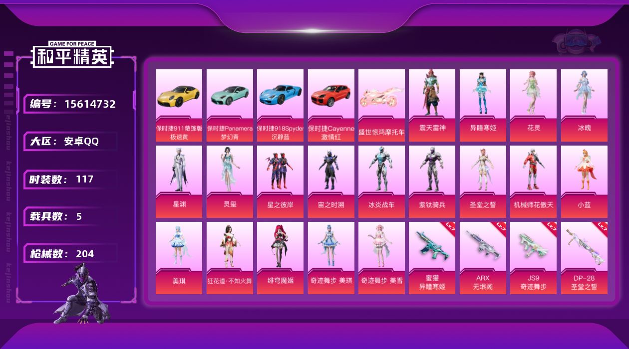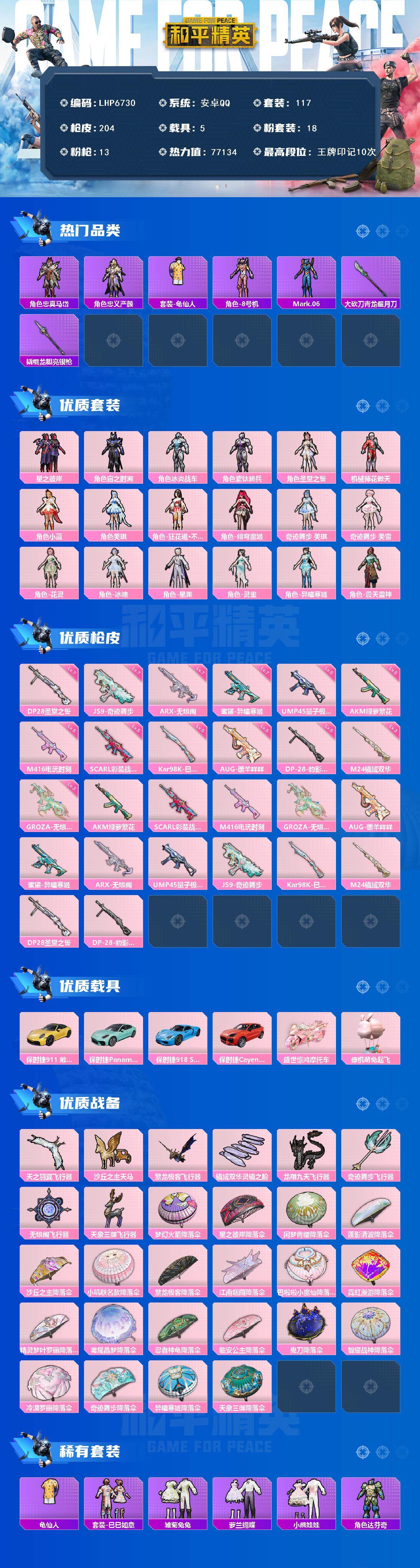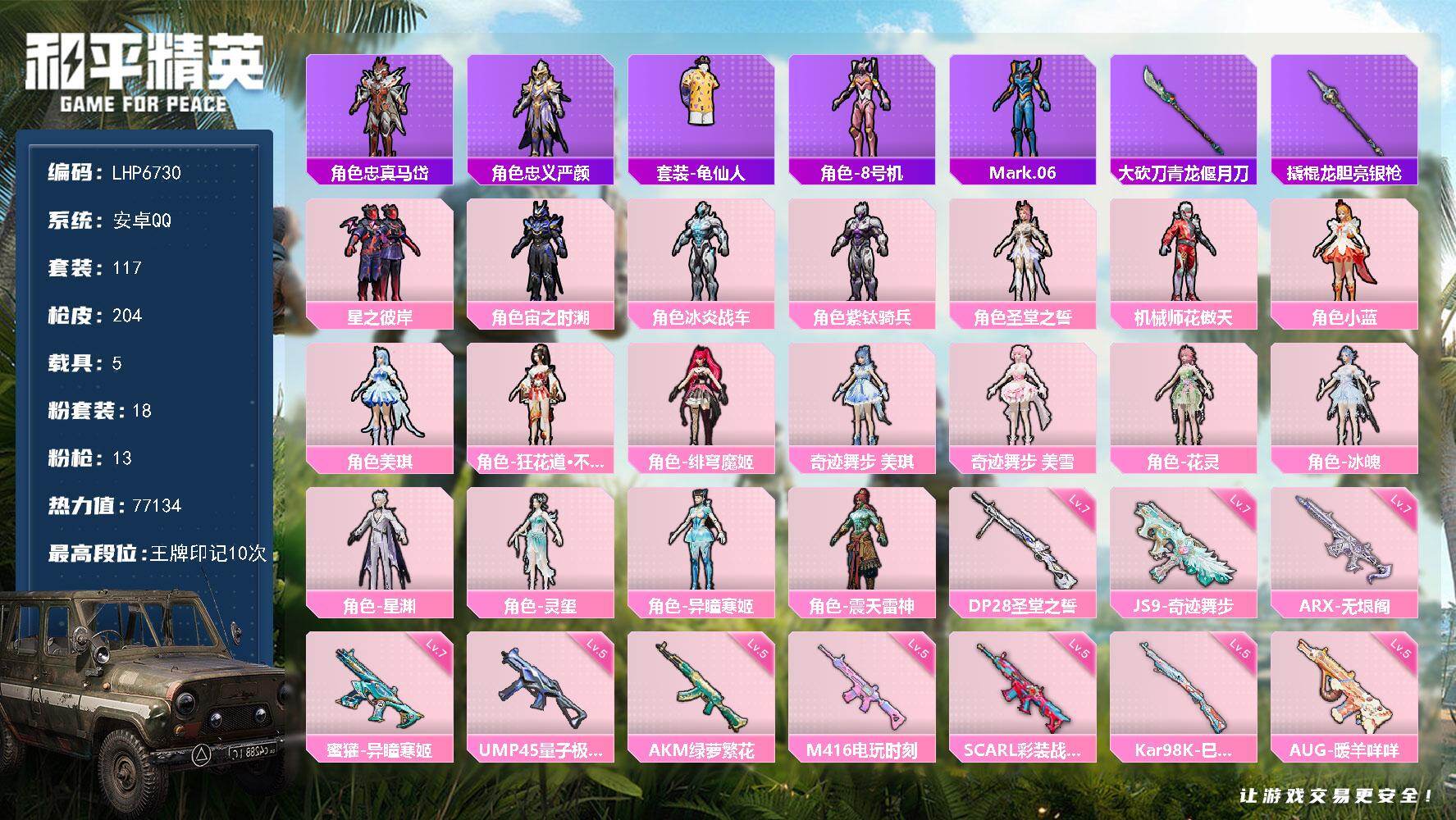 [15614732]【店主推荐捡漏号!可直接换绑】安卓 手Q-18粉装-13特效枪-5载具-9粉色飞行器-7.7w热力值-10王牌印记-117套装-204枪皮 【热门品类】:角色-忠真马岱,角色-忠义严颜,套装-龟仙人,角色-8号机,角色-Mark.06,大砍刀-青龙偃月刀,撬棍-龙胆亮银枪 【粉色套装】:粉装-星之彼岸,角色-宙之时溯,角色-冰炎战车,角色-紫钛骑兵,角色-圣堂之誓,粉装-机械师花傲天,角色-小蓝,角色-美琪,角色-狂花道·不知火舞,角色-绯穹魔姬,角色-奇迹舞步 美琪,角色-奇迹舞步 美雪,角色-花灵,角色-冰魄,角色-星渊,角色-灵玺,角色-异瞳寒姬,角色-震天雷神 【粉色枪皮等级】:AKM-绿萝繁花(五级),SCAR-L-彩装战姬(五级),M416-电玩时刻(五级),GROZA-无垠阁(三级),AUG-暖羊咩咩(五级),蜜獾-异瞳寒姬(七级),ARX-无垠阁(七级),UMP45-量子极限(五级),JS9-奇迹舞步(七级),Kar98K-巳巳如意(五级),M24-镜域双华(三级),DP-28-圣堂之誓(七级),DP-28-豹影疾电(五级) 【粉色载具】:保时捷911 敞篷版(极速黄),保时捷Panamera(梦幻青),保时捷918 Spyder(沉静蓝),保时捷Cayenne(激情红),盛世惊鸿摩托车,僚机-萌兔起飞 【粉色枪皮】:AKM-绿萝繁花,SCAR-L-彩装战姬,M416-电玩时刻,GROZA-无垠阁,AUG-暖羊咩咩,蜜獾-异瞳寒姬,ARX-无垠阁,UMP45-量子极限,JS9-奇迹舞步,Kar98K-巳巳如意,M24-镜域双华,DP-28-圣堂之誓,DP-28-豹影疾电 【粉色飞行器】:天之羽翼飞行器,沙丘之主天马,繁龙极客飞行器,镜域双华-灵镜之阶,龙翔九天飞行器,奇迹舞步飞行器,无垠阁飞行器,天象三御飞行器 【粉色降落伞】:梦幻火箭降落伞,星之彼岸降落伞,闲梦青缨降落伞,莲影清波降落伞,沙丘之主降落伞,小叽联名款降落伞,繁龙极客降落伞,江南烟雨降落伞,巴啦啦小魔仙降落伞,霓虹漫游降落伞,精灵梦叶罗丽降落伞,鸢尾晶梦降落伞,忍者神龟降落伞,临安公主降落伞,鬼刀降落伞,智耀战神降落伞,冷漠罗丽降落伞,奇迹舞步降落伞,异瞳寒姬降落伞,天象三御降落伞,炫彩糖果降落伞 【稀有套装】:套装-龟仙人,套装-巳巳如意,套装-雏菊兔兔,套装-萝兰蝴蝶,套装-小熊