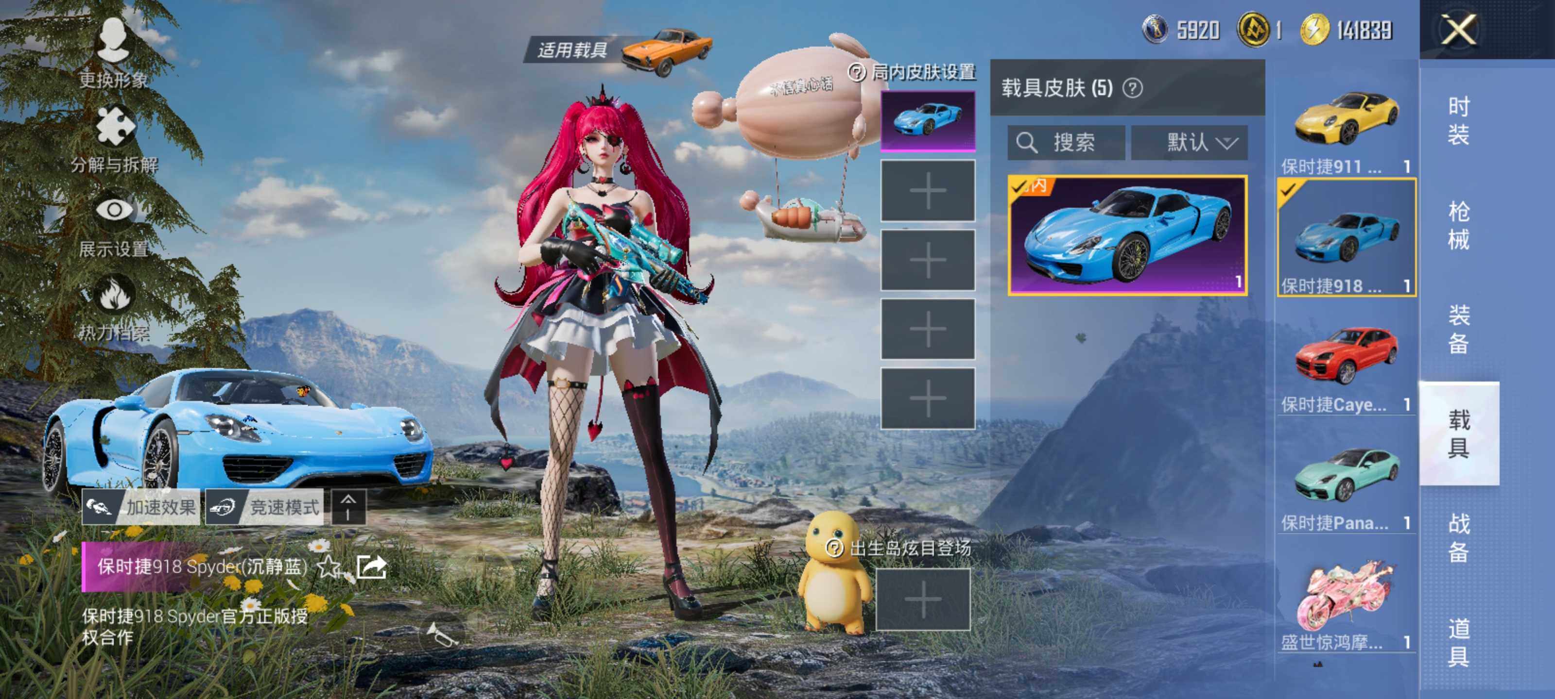 【粉色载具】:保时捷911 敞篷版(极速黄),保时捷Panamera(梦幻青),保时捷918 Spyder(沉静蓝),保时捷Cayenne(激情红),盛世惊鸿摩托车,僚机-萌兔起飞