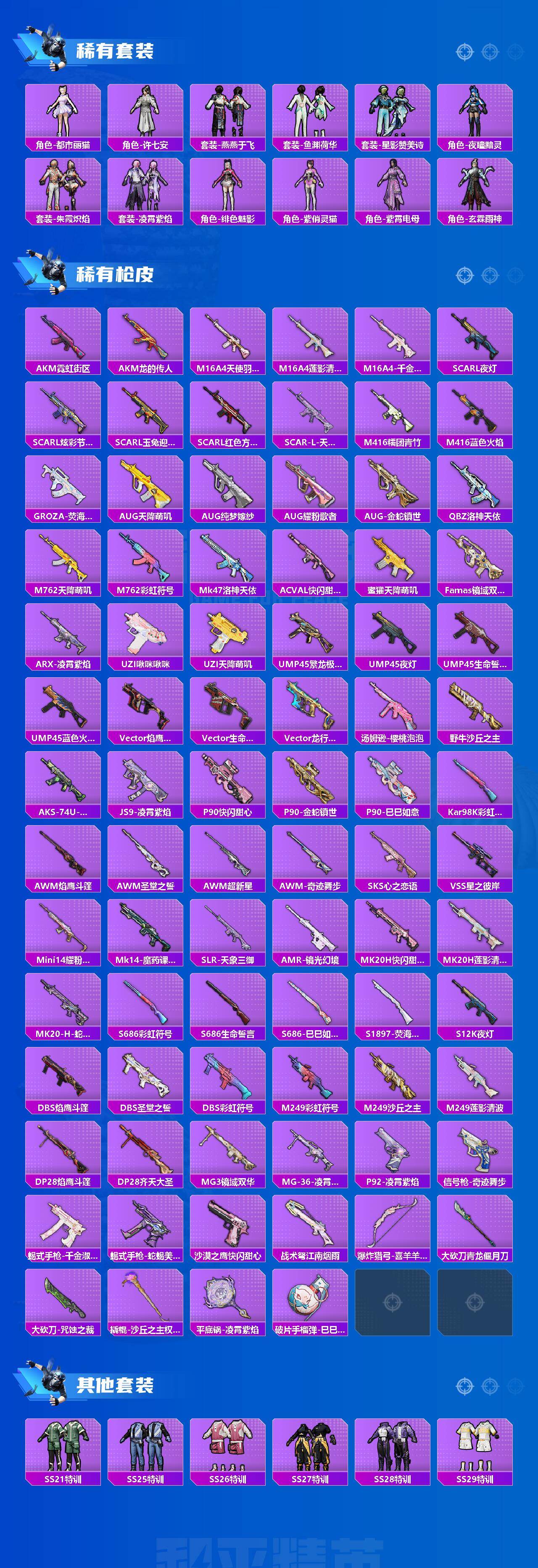 【粉色枪皮】:AKM-绿萝繁花,SCAR-L-彩装战姬,M416-电玩时刻,GROZA-无垠阁,AUG-暖羊咩咩,蜜獾-异瞳寒姬,ARX-无垠阁,UMP45-量子极限,JS9-奇迹舞步,Kar98K-巳巳如意,M24-镜域双华,DP-28-圣堂之誓,DP-28-豹影疾电