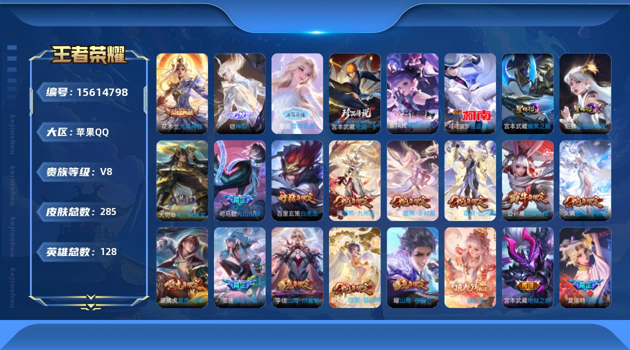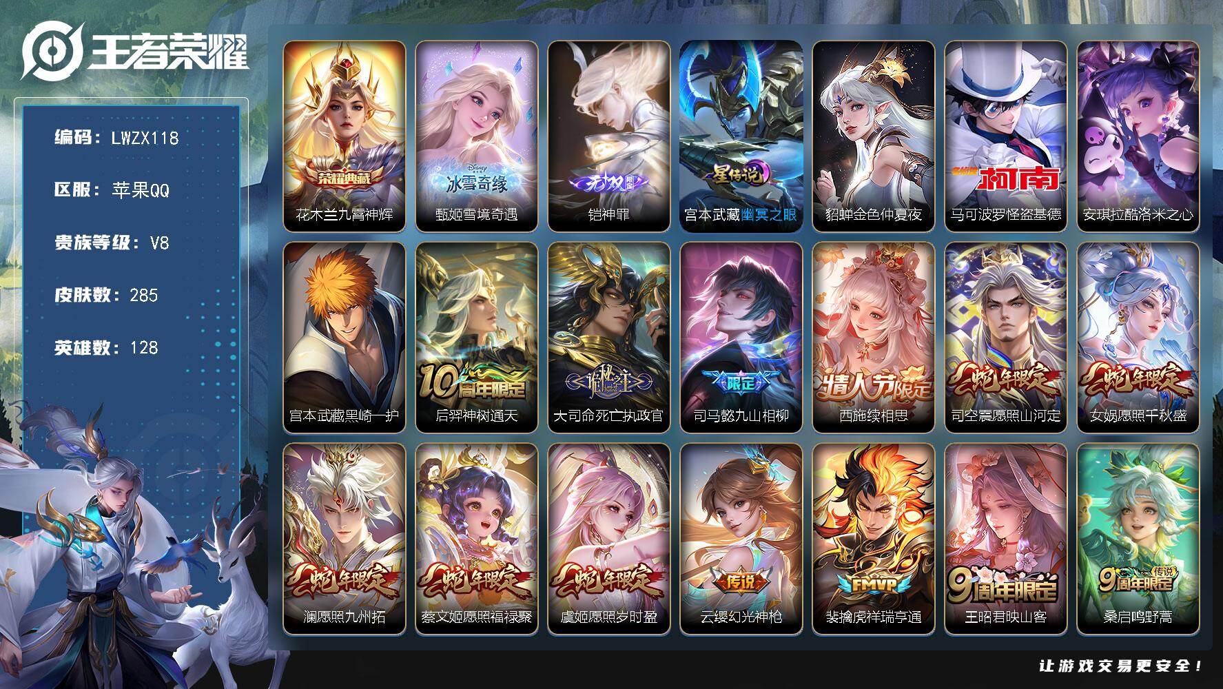 [15614798]【特价出售/店主推荐】苹果Q-V8-至尊星耀III段位-128英雄-285皮肤-1典藏皮肤-2无双-3珍品传说-38传说-74史诗-2星元