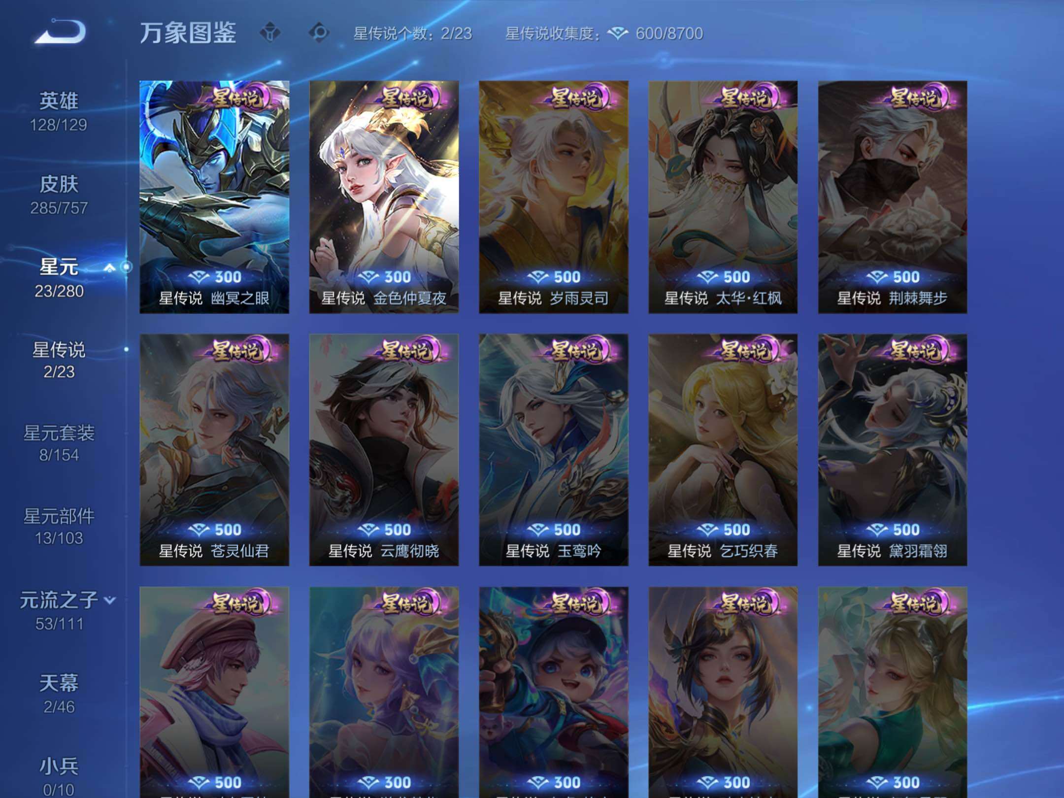 达摩黄金狮子座,李信一念神魔,赵云淬星耀世,干将莫邪画中仙,夏洛特浮生妄,公孙离记忆之芯,露娜霜月吟,亚连落雪白狼,裴擒虎祥瑞亨通,云缨幻光神枪,西施续相思
