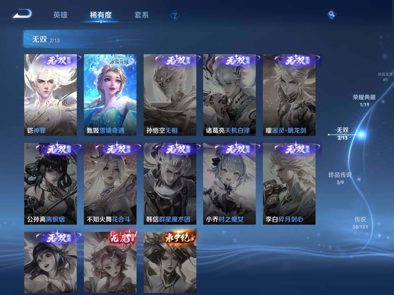 - PX_2099937-Q/非凡王者/232皮肤/123英雄/0典藏/0珍品无双/1无双/2珍品传说/15传说/61史诗/8稀有英雄 【2 珍品传说】怪盗基德 马可波罗,器灵·落星盏 嫦娥, 【1 无双皮肤】器灵·螭龙剑 曜, 【15 传说皮肤】胖达荣荣 梦奇,启明星使 虞姬,逐花归海 澜,无双飞将 马超,白虎志 百里玄策,地狱之眼 宫本武藏,祈雪灵祝 公孙离,启示之音 露娜,末日机甲 孙尚香,一念