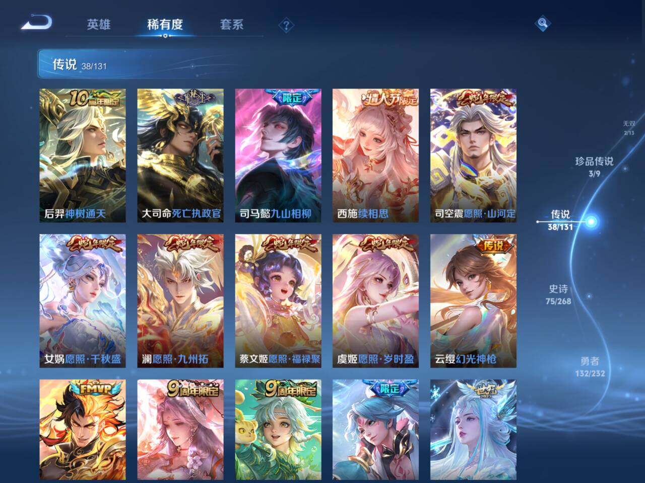 【传说皮肤】:后羿神树通天,大司命死亡执政官,司马懿九山相柳,西施续相思,司空震愿照山河定,女娲愿照千秋盛,澜愿照九州拓,蔡文姬愿照福禄聚,虞姬愿照岁时盈,云缨幻光神枪,裴擒虎祥瑞亨通,王昭君映山客,桑启鸣野蒿,亚连落雪白狼,露娜霜月吟,云缨鹤归松栖,公孙离记忆之芯,夏洛特浮生妄,干将莫邪画中仙,小乔山海琳琅生,曜山海苍雷引,李信山海炽霜斩,吕布怒海麟威,不知火舞绯月行,裴擒虎寅虎赤拳,鲁班七号寅虎瑞焰,赵云淬星耀世,兰陵王默契交锋,公孙离祈雪灵祝,诸葛亮时雨天司,虞姬启明星使,李信一念神魔,达摩黄金狮子座,百里玄策白虎志,后羿黄金射手座,貂蝉仲夏夜之梦,孙尚香末日机甲,宫本武藏地狱之眼