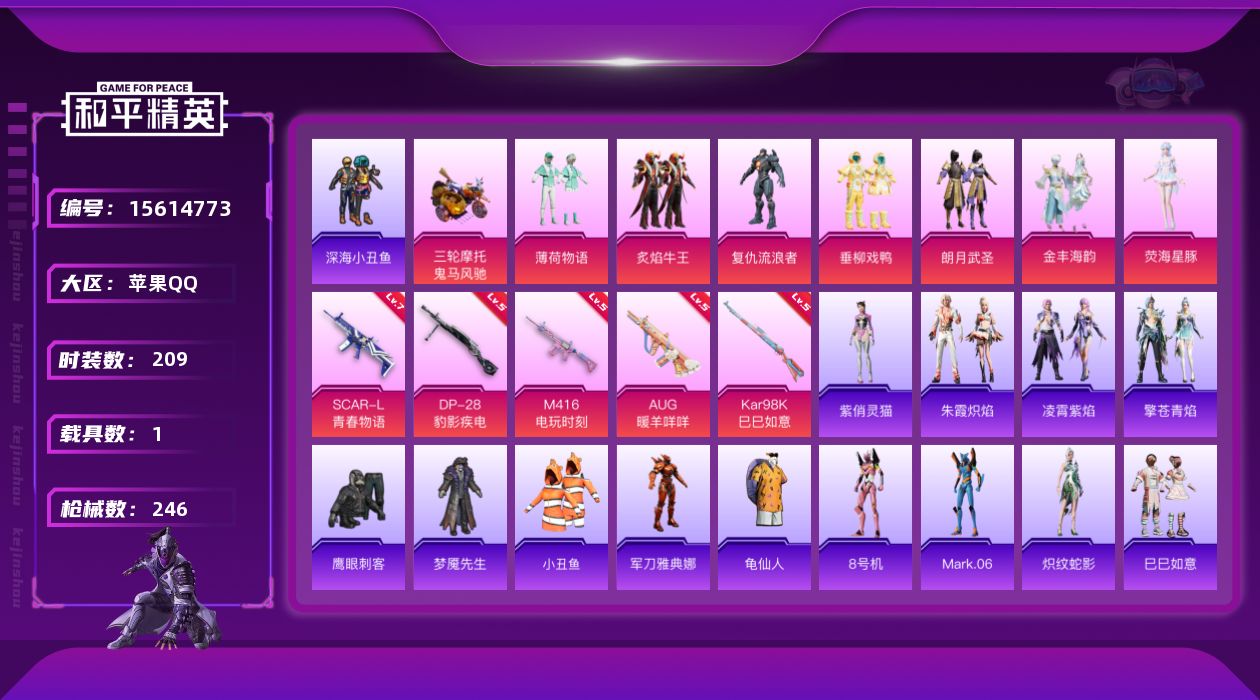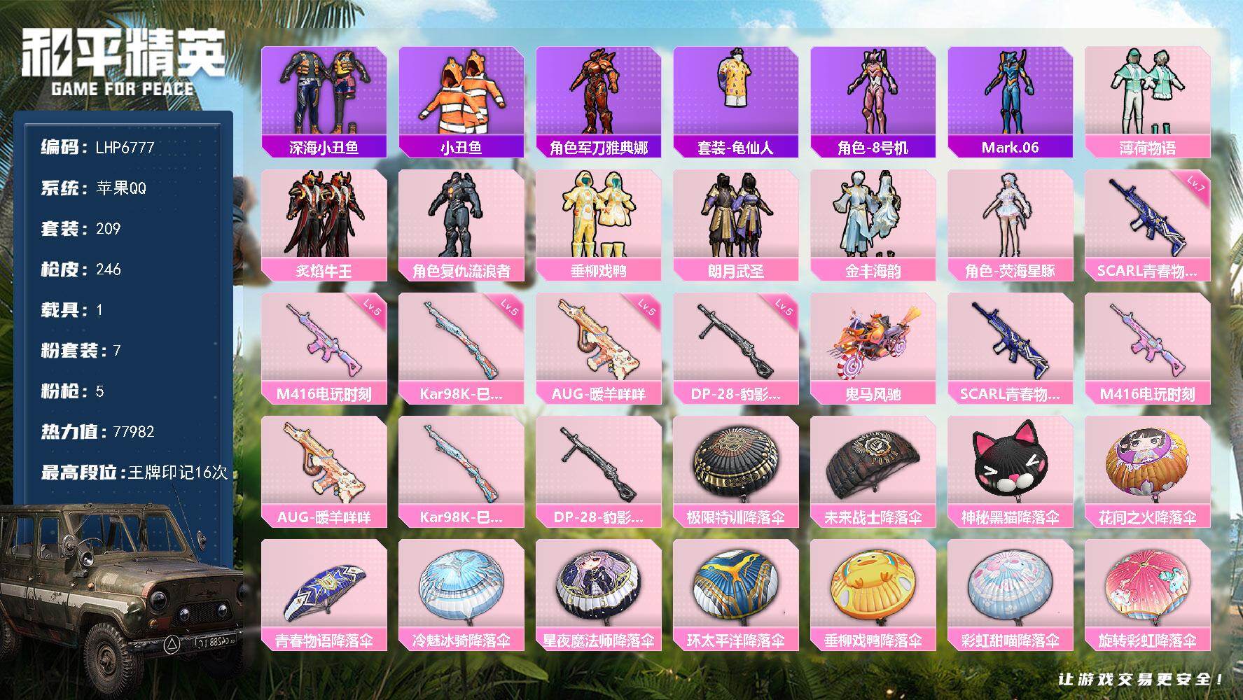 [15614773]【特价出售/店主推荐】苹果 手Q-7粉装-5特效枪-1载具-7.7w热力值-16王牌印记-209套装-246枪皮 【热门品类】:套装-深海小丑鱼,套装-小丑鱼,角色-军刀雅典娜,套装-龟仙人,角色-8号机,角色-Mark.06 【粉色套装】:粉装-薄荷物语,粉装-炙焰牛王,角色-复仇流浪者,粉装-垂柳戏鸭,粉装-朗月武圣,粉装-金丰海韵,角色-荧海星豚 【粉色枪皮等级】:SCAR-L-青春物语(七级),M416-电玩时刻(五级),AUG-暖羊咩咩(五级),Kar98K-巳巳如意(五级),DP-28-豹影疾电(五级) 【粉色载具】:鬼马风驰 【粉色枪皮】:SCAR-L-青春物语,M416-电玩时刻,AUG-暖羊咩咩,Kar98K-巳巳如意,DP-28-豹影疾电 【粉色降落伞】:极限特训降落伞,未来战士降落伞,神秘黑猫降落伞,花间之火降落伞,青春物语降落伞,冷魅冰骑降落伞,星夜魔法师降落伞,环太平洋降落伞,垂柳戏鸭降落伞,彩虹甜喵降落伞,旋转彩虹降落伞,炫光之旅降落伞,莲影清波降落伞,精灵梦叶罗丽降落伞,临安公主降落伞,动力核心降落伞,时光之吻降落伞,最终圣卫者降落伞,荧海星豚降落伞 【稀有套装】:套装-龟仙人,套装-炽纹蛇影,套装-巳巳如意,套装-荒原牛仔,套装-云鹰凌岚,套装-雏菊兔兔,套装-萝兰蝴蝶,角色-达芬奇,角色-摩登魅猫,角色-怀庆长公主,套装-燕燕于飞,套装-鱼渊荷华,套装-镭金极速,套装-晶辉守护,套装-闪电轻猫,套装-星影赞美诗,套装-彩虹兔,套装-云朵鹅,套装-雪绒豹,套装-蓝海鲸歌,套装-朱霞炽焰,套装-凌霄紫焰,套装-擎苍青焰,角色-紫俏灵猫 【稀有枪皮】:AKM-夜灯,AKM-彩虹符号,AKM-恐龙拽拽,AKM-海渊国主,AKM-灼热熔岩,AKM-破晓战魂,AKM-缤纷海域,AKM-萌趣颜团子,AKM-虎虎生威,AKM-霓虹街区,AKM-龙的传人,M16A4-幻世战舞者,M16A4-甜心亚梦,M16A4-红色方程式,M16A4-蓝色火焰,SCAR-L-夜灯,SCAR-L-未来战士,SCAR-L-玉兔迎春,SCAR-L-红色方程式,SCAR-L-冷漠罗丽,M416-月影鸳鸯,M416-糯团青竹,M416-红色方程式,M416-绯红前夜,M416-蓝色火焰,GROZA-异彩先驱,GROZA-影袭,GROZA-懵萌河马,GROZA-田园牧歌,GR