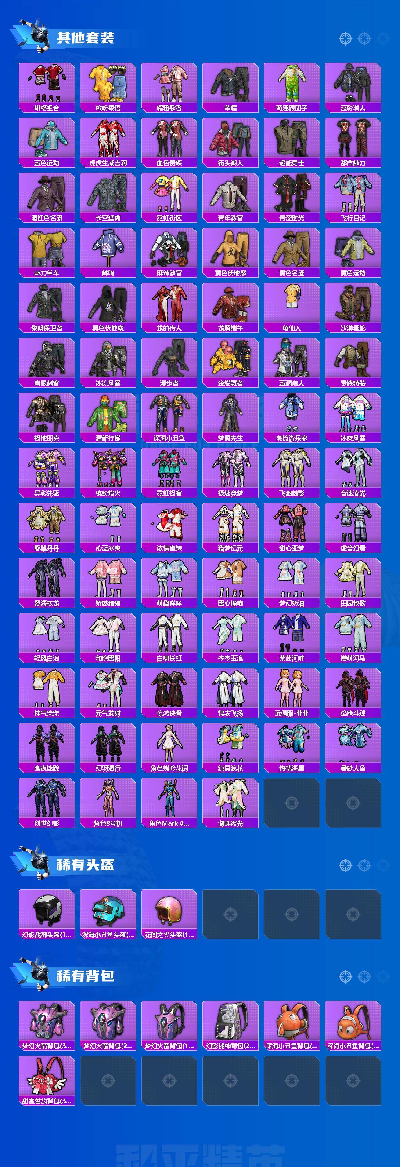 套装-深海小丑鱼,套装-薄荷物语,套装-炙焰牛王,角色-复仇流浪者,套装-垂柳戏鸭,套装-朗月武圣,套装-金丰海韵,套装-鹰眼刺客,套装-梦魇先生