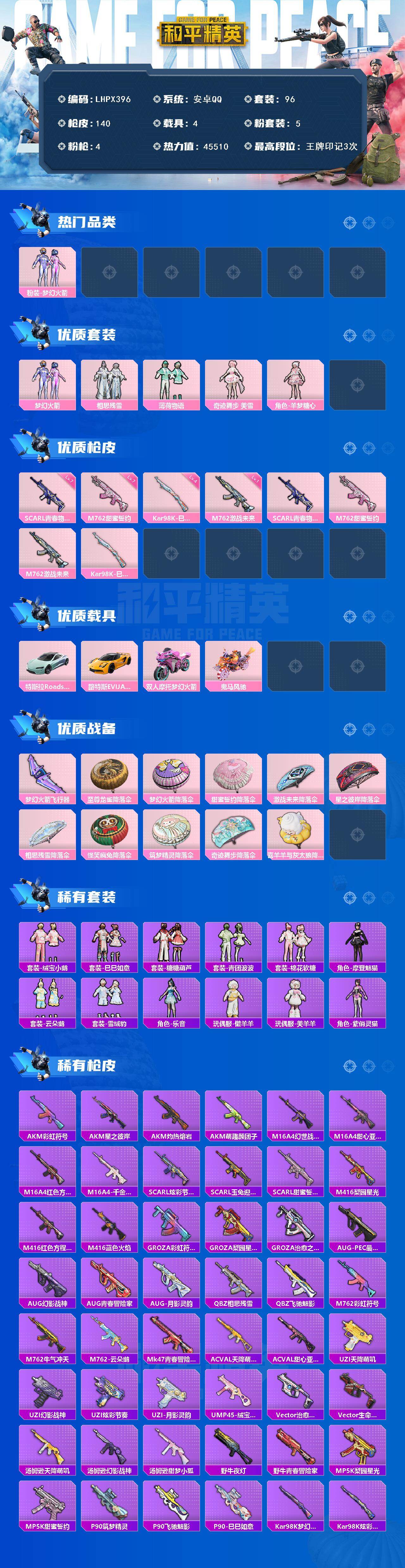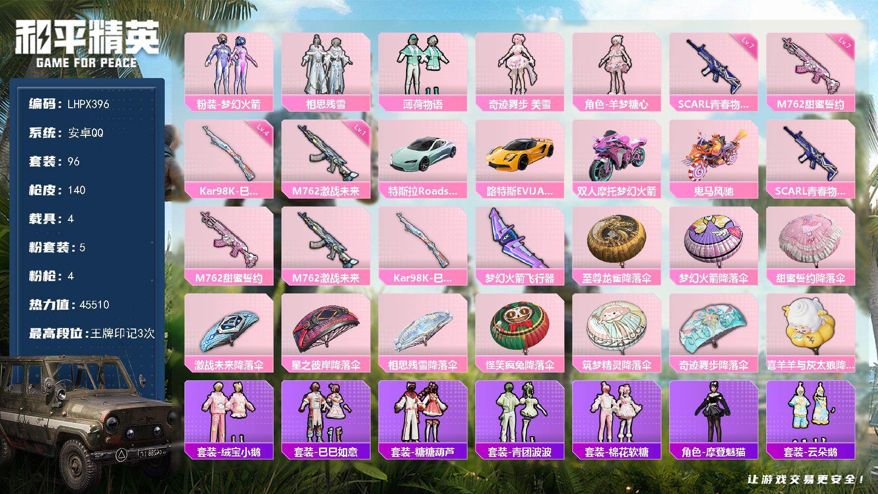 [15615583]安卓 手Q-5粉装-4特效枪-4载具-1粉色飞行器-45510热力值-3王牌印记-96套装-140枪皮 【热门品类】:粉装-梦幻火箭 【粉色套装】:粉装-梦幻火箭,粉装-相思残雪,粉装-薄荷物语,角色-奇迹舞步 美雪,角色-羊梦糖心 【粉色枪皮等级】:SCAR-L-青春物语(七级),M762-甜蜜誓约(七级),M762-激战未来(一级),Kar98K-巳巳如意(四级) 【粉色载具】:特斯拉Roadster(水滴蓝),路特斯EVIJA(星际黄),双人摩托-梦幻火箭,鬼马风驰 【粉色枪皮】:SCAR-L-青春物语,M762-甜蜜誓约,M762-激战未来,Kar98K-巳巳如意 【粉色飞行器】:梦幻火箭飞行器 【粉色降落伞】:至尊龙雀降落伞,梦幻火箭降落伞,甜蜜誓约降落伞,激战未来降落伞,星之彼岸降落伞,相思残雪降落伞,怪笑疯兔降落伞,筑梦精灵降落伞,奇迹舞步降落伞,喜羊羊与灰太狼降落伞 【稀有套装】:套装-绒宝小鹅,套装-巳巳如意,套装-糖糖葫芦,套装-青团波波,套装-棉花软糖,角色-摩登魅猫,套装-云朵鹅,套装-雪绒豹,角色-乐音,玩偶服-懒羊羊,玩偶服-美羊羊,角色-紫俏灵猫 【稀有枪皮】:AKM-彩虹符号,AKM-星之彼岸,AKM-灼热熔岩,AKM-萌趣颜团子,M16A4-幻世战舞者,M16A4-甜心亚梦,M16A4-红色方程式,M16A4-千金淑猫,SCAR-L-炫彩节奏,SCAR-L-玉兔迎春,SCAR-L-甜蜜誓约,M416-梨园星光,M416-红色方程式,M416-蓝色火焰,GROZA-彩虹符号,GROZA-梨园星光,GROZA-治愈之星,AUG-PEC最牛战神,AUG-幻影战神,AUG-青春冒险家,AUG-月影灵韵,QBZ-相思残雪,QBZ-飞驰魅影,M762-彩虹符号,M762-牛气冲天,M762-云朵鹅,Mk47-青春冒险家,AC-VAL-天降萌叽,AC-VAL-甜心亚梦,UZI-天降萌叽,UZI-幻影战神,UZI-炫彩节奏,UZI-月影灵韵,UMP45-绒宝小鹅,Vector-治愈之星,Vector-生命誓言,汤姆逊-天降萌叽,汤姆逊-幻影战神,汤姆逊-甜梦小狐,野牛-夜灯,野牛-青春冒险家,MP5K-梨园星光,MP5K-甜蜜誓约,P90-筑梦精灵,P90-飞驰魅影,P90-巳巳如意,Kar98K-梦幻火箭,Kar98K-炫彩节奏,Kar98K-