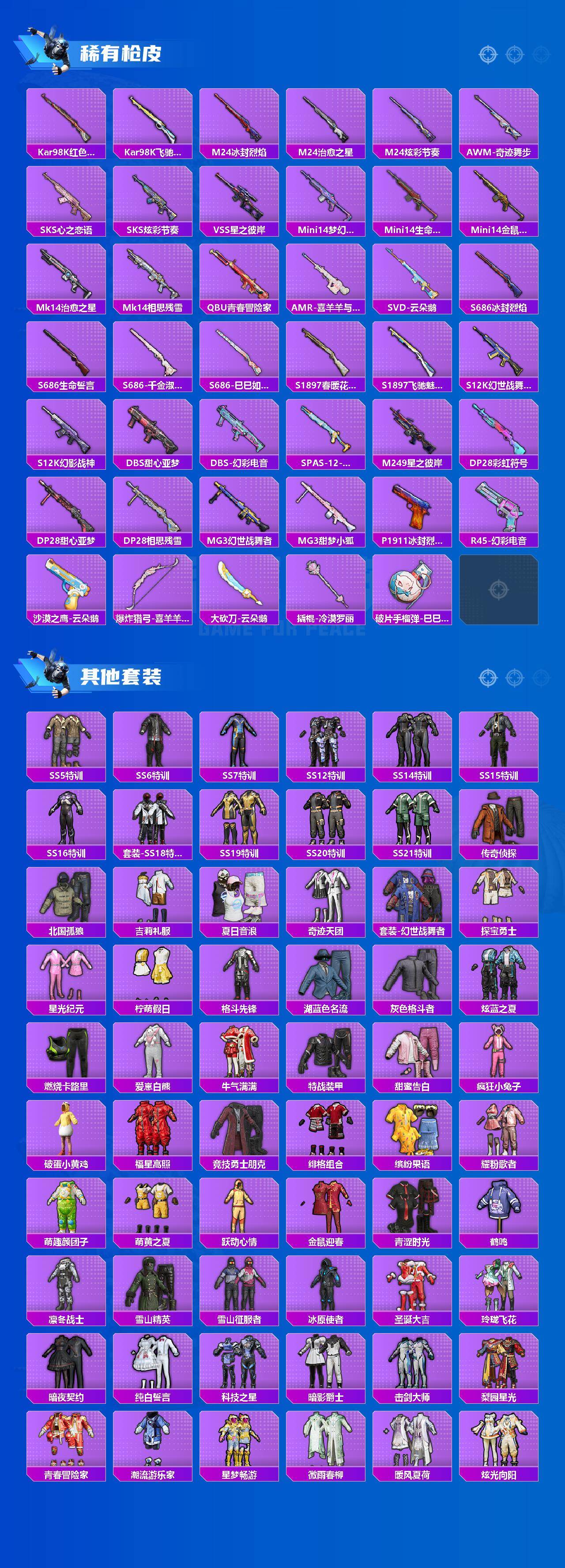 【稀有枪皮】:AKM-彩虹符号,AKM-星之彼岸,AKM-灼热熔岩,AKM-萌趣颜团子,M16A4-幻世战舞者,M16A4-甜心亚梦,M16A4-红色方程式,M16A4-千金淑猫,SCAR-L-炫彩节奏,SCAR-L-玉兔迎春,SCAR-L-甜蜜誓约,M416-梨园星光,M416-红色方程式,M416-蓝色火焰,GROZA-彩虹符号,GROZA-梨园星光,GROZA-治愈之星,AUG-PEC最牛战神,AUG-幻影战神,AUG-青春冒险家,AUG-月影灵韵,QBZ-相思残雪,QBZ-飞驰魅影,M762-彩虹符号,M762-牛气冲天,M762-云朵鹅,Mk47-青春冒险家,AC-VAL-天降萌叽,AC-VAL-甜心亚梦,UZI-天降萌叽,UZI-幻影战神,UZI-炫彩节奏,UZI-月影灵韵,UMP45-绒宝小鹅,Vector-治愈之星,Vector-生命誓言,汤姆逊-天降萌叽,汤姆逊-幻影战神,汤姆逊-甜梦小狐,野牛-夜灯,野牛-青春冒险家,MP5K-梨园星光,MP5K-甜蜜誓约,P90-筑梦精灵,P90-飞驰魅影,P90-巳巳如意,Kar98K-梦幻火箭,Kar98K-炫彩节奏,Kar98K-