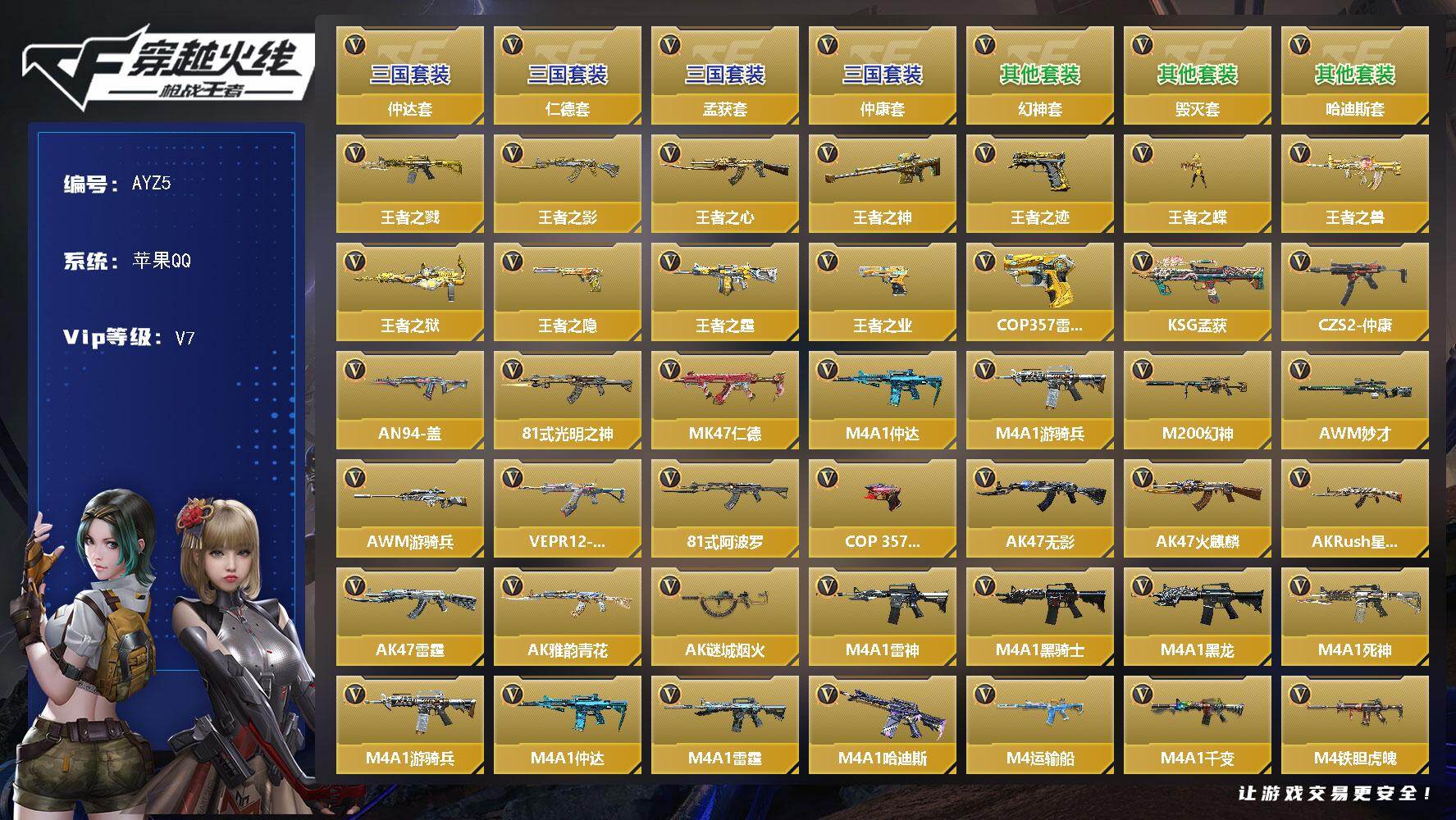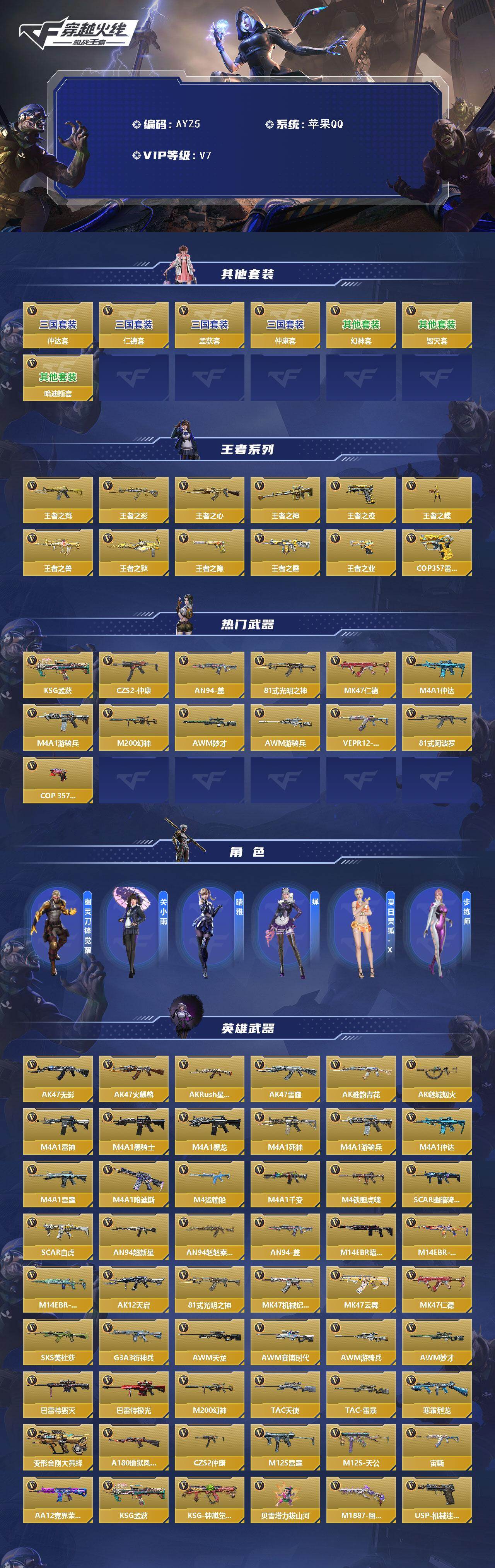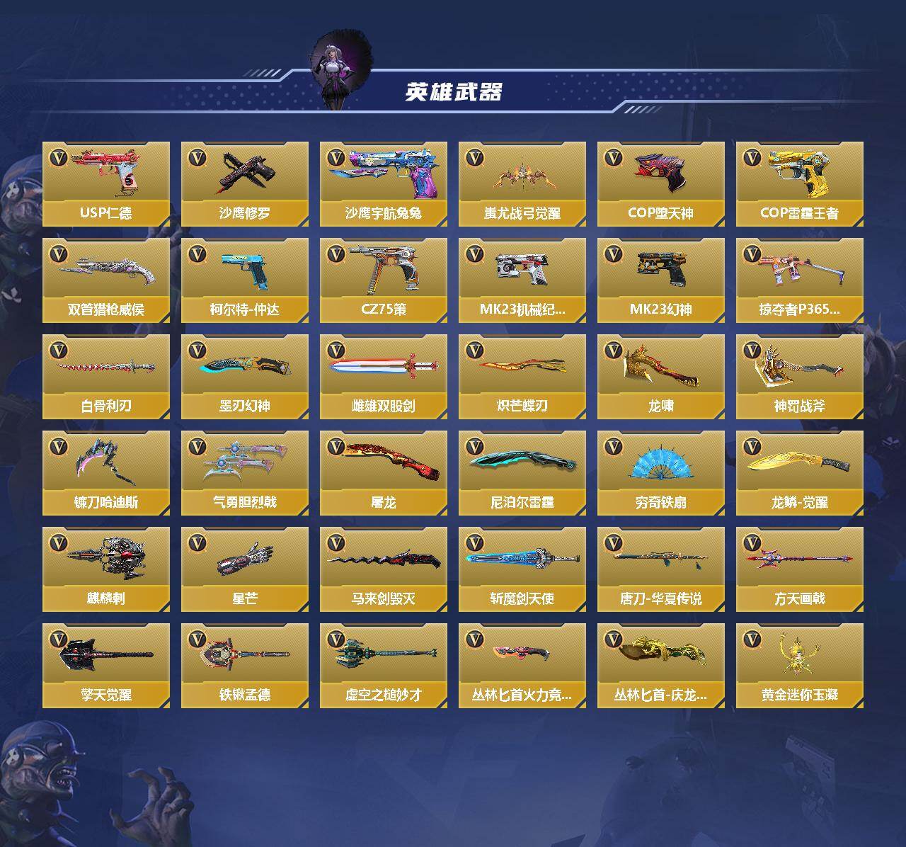 【英雄武器】:AK47-无影,AK47-火麒麟,AK47-Rush-星速,AK47-雷霆,AK47-雅韵青花,AK47-谜城烟火,M4A1-雷神,M4A1-黑骑士*2,M4A1-黑龙*2,M4A1-死神,M4A1-游骑兵,M4A1-仲达,M4A1-雷霆,M4A1-哈迪斯,M4A1-运输船,M4A1-千变,M4A1-铁胆虎魄,SCAR-幽暗骑士,SCAR Light-白虎,AN94-超新星,AN94-赳赳秦师,AN94-盖,M14EBR-暗夜,M14EBR-拂影,M14EBR-葫芦山庄,AK12-天启,81式-光明之神,MK47-机械纪元,MK47-云舞,MK47-仁德,SKS-美杜莎,G3A3-衍神兵,AWM-天龙,AWM-赛博时代,AWM-游骑兵,AWM-妙才,巴雷特-毁灭,巴雷特-极光*6,M200-幻神,TAC-天使,TAC-雷暴,寒霜烈龙*5,QCW05-变形金刚·大黄蜂,A180-地狱凤凰,CZS2-仲康,M12S-雷霆,M12S-天公,VEPR12-宙斯,AA12-竞界荣光,KSG-孟获,KSG-钟馗觉醒,贝雷塔-力拔山河,M1887-幽冥玄喵觉醒*2,USP-机械迷城,USP-仁德,沙鹰-修罗,沙鹰-宇航兔兔,蚩尤战弓觉醒,COP 357-堕天神,COP 357-雷霆王者,双管猎枪-威侯,柯尔特-仲达,CZ75-策,MK23-机械纪元,MK23-幻神,掠夺者P365-虹舞,白骨利刃,墨刃-幻神,雌雄双股剑,炽芒蝶刃*6,龙啸,神罚战斧*2,镰刀-哈迪斯,气勇胆烈戟,屠龙*14,尼泊尔-雷霆*3,穷奇铁扇,龙鳞-觉醒,麒麟刺,星芒,马来剑-毁灭,斩魔剑-天使,唐刀-华夏传说,方天画戟,擎天觉醒,铁锹-孟德,虚空之槌-妙才,丛林匕首-火力竞放觉醒,丛林匕首-庆龙觉醒,黄金迷你玉凝