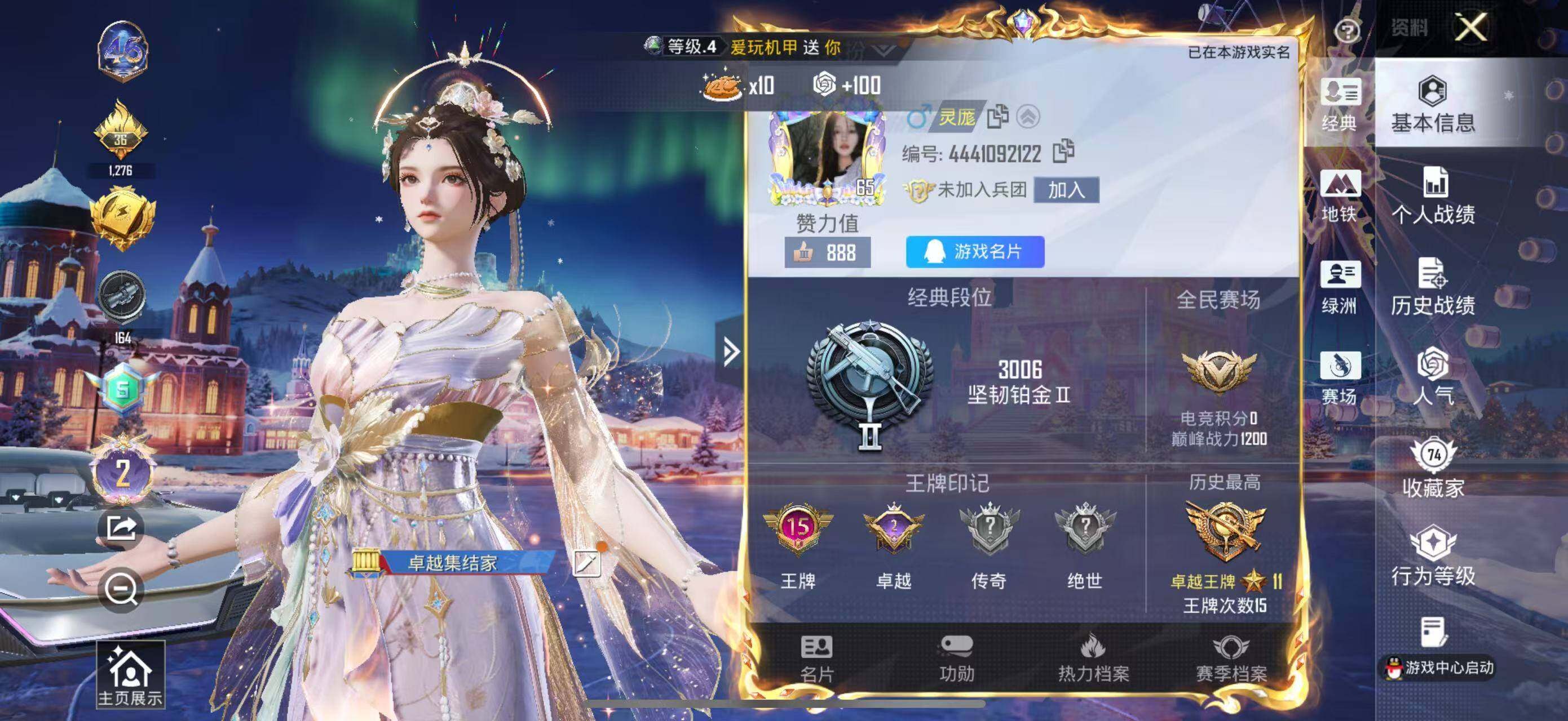 - PX_2081500-贵族等级: V5 英雄数: 103 皮肤数: 59 传说皮: 云鹰飞将,炽翼辉光 限定皮: 百木心枪,启示之音,鸣野蒿