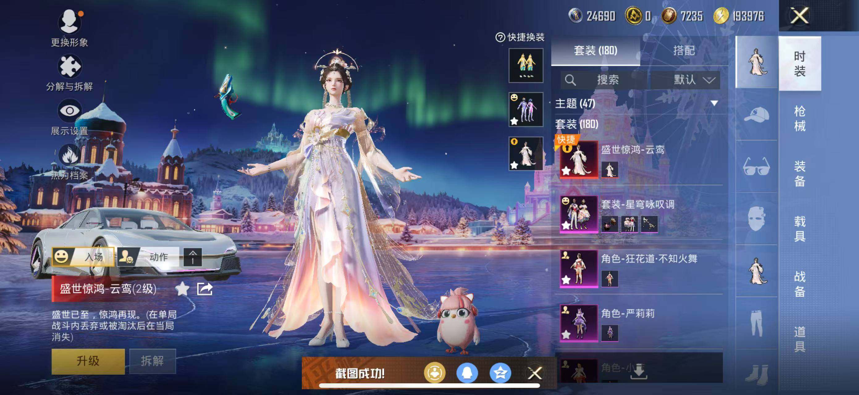 【粉色枪皮等级】:M416-风花雪月(七级),GROZA-镜光银凌(五级),AUG-暖羊咩咩(五级),Kar98K-巳巳如意(五级),M24-镜域双华(三级),Mk14-盛世惊鸿(三级),DP-28-千金淑猫(四级),DP-28-豹影疾电(一级)