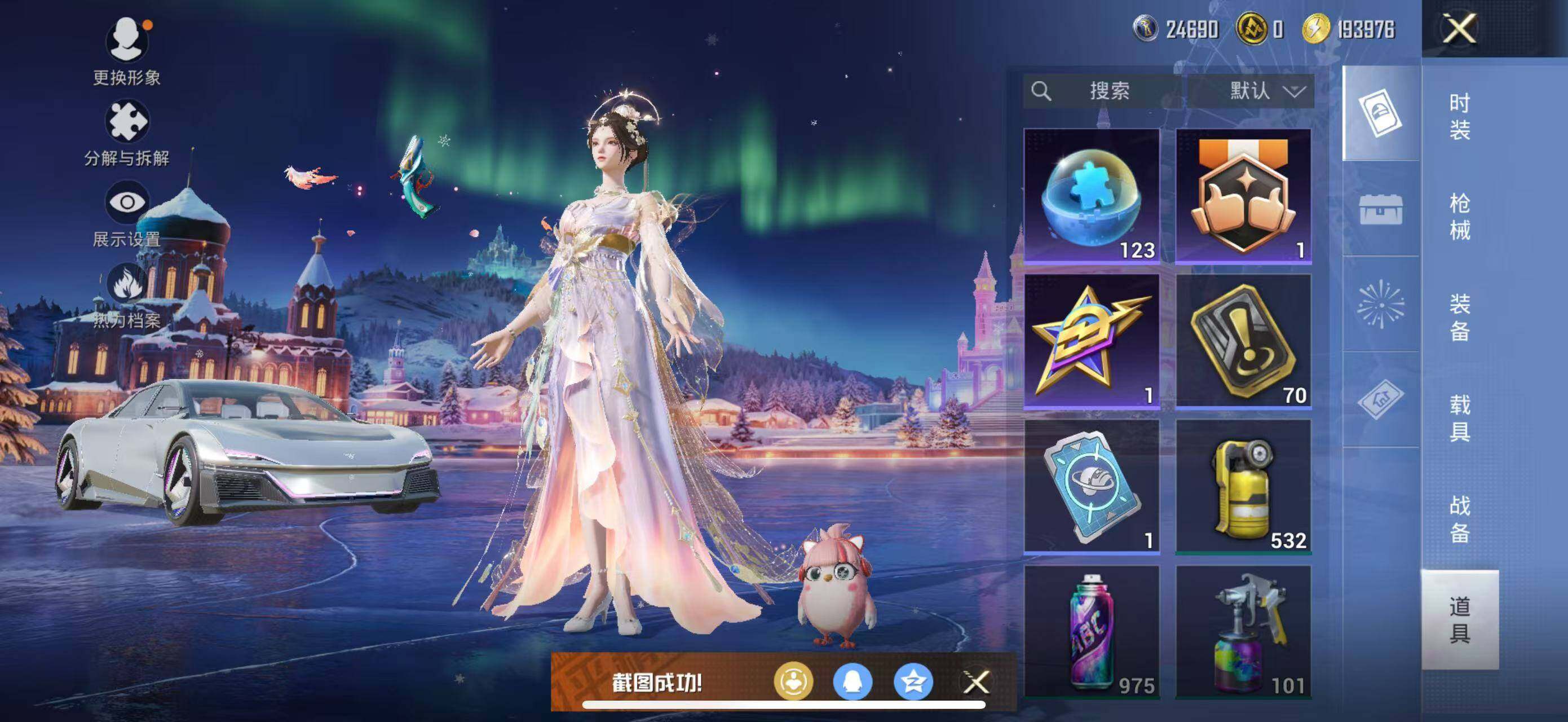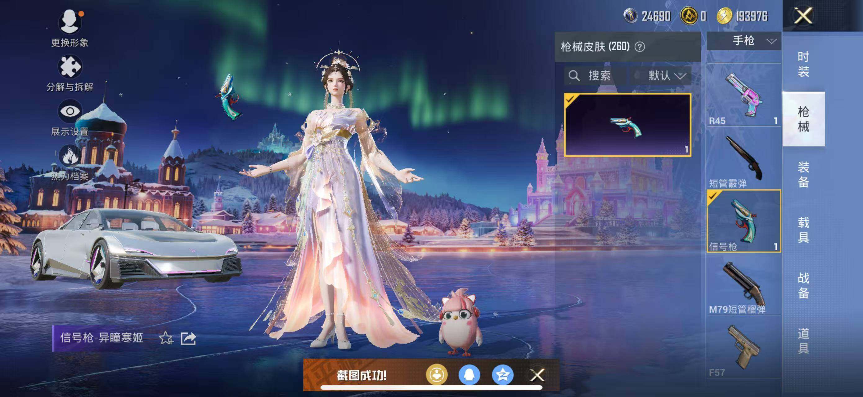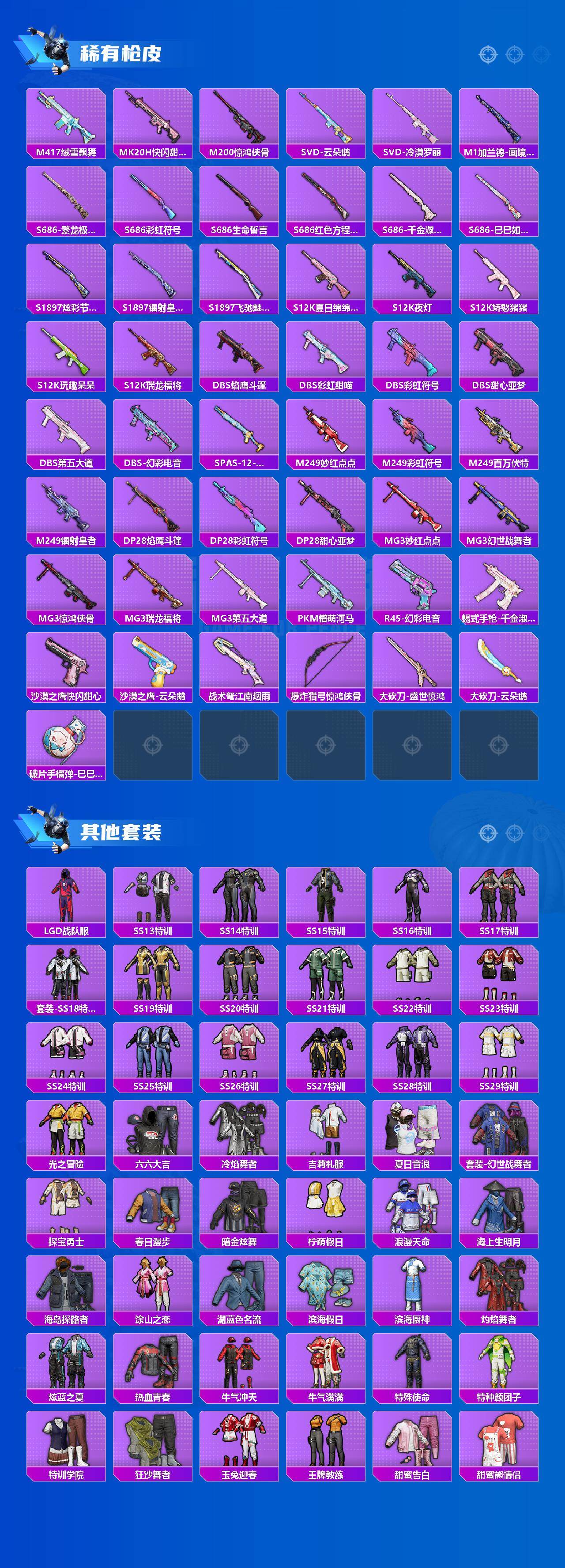 M416-风花雪月,GROZA-镜光银凌,AUG-暖羊咩咩,Kar98K-巳巳如意,M24-镜域双华,Mk14-盛世惊鸿,DP-28-千金淑猫