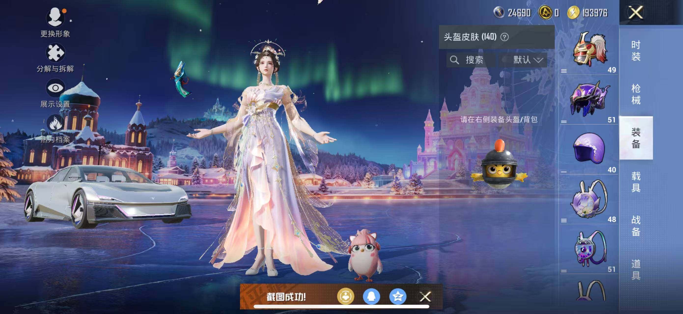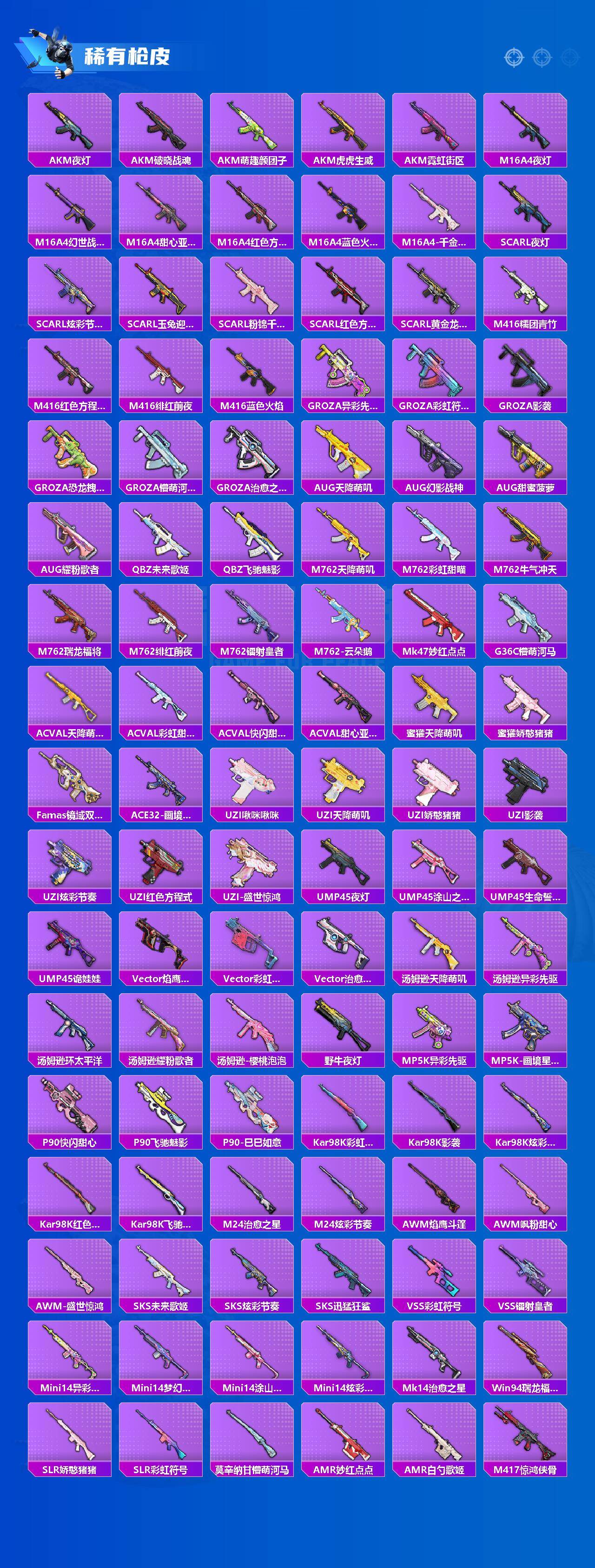 【粉色枪皮】:M416-风花雪月,GROZA-镜光银凌,AUG-暖羊咩咩,Kar98K-巳巳如意,M24-镜域双华,Mk14-盛世惊鸿,DP-28-千金淑猫,DP-28-豹影疾电