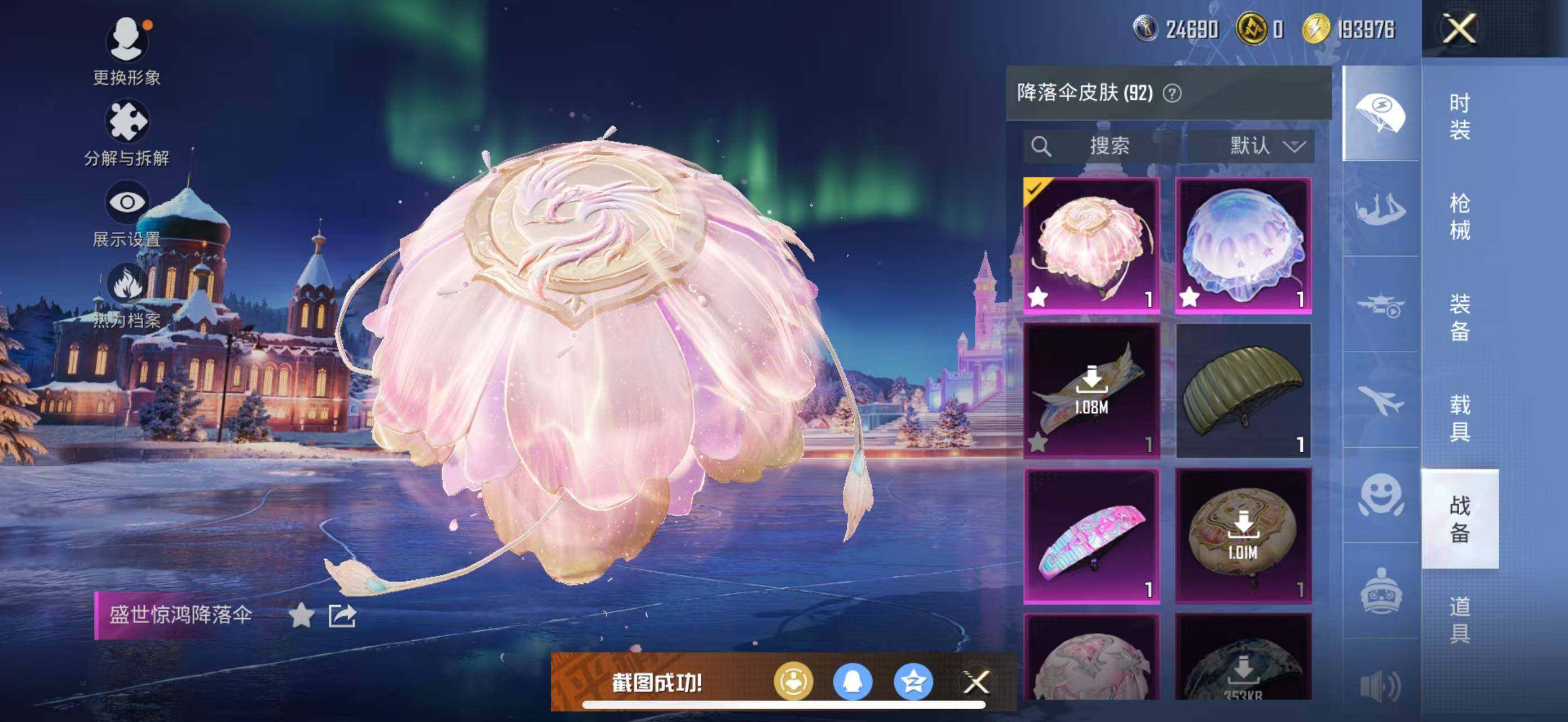 【粉色降落伞】:百万伏特降落伞,梦幻火箭降落伞,暗夜玫瑰降落伞,洛神天依降落伞,绒雪飘舞降落伞,彩虹甜喵降落伞,飒粉甜心降落伞,黄族统领降落伞,镜域双华降落伞,辉耀战甲降落伞,巴啦啦小魔仙降落伞,精灵梦叶罗丽降落伞,创世·救赎降落伞,千金淑猫降落伞,盛世惊鸿降落伞,幻影飞狐降落伞,雪月幻音降落伞,星穹咏叹调降落伞,冷漠罗丽降落伞,炫彩糖果降落伞