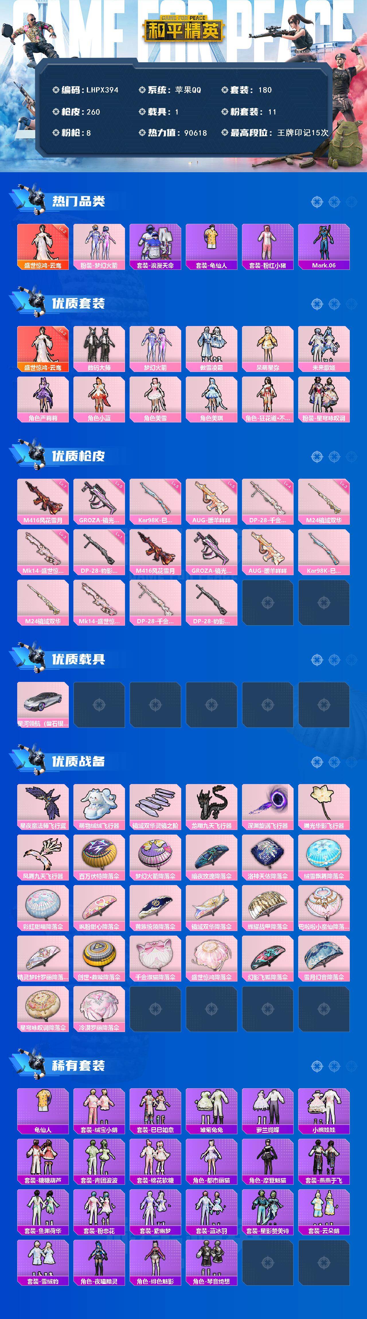 [15615613]【特价出售/店主推荐】苹果 手Q-1神装-11粉装-8特效枪-1载具-8粉色飞行器-90618热力值-15王牌印记-180套装-260枪皮 【红色神装等级】:盛世惊鸿-云鸾(二级) 【红色角色神装】:盛世惊鸿-云鸾 【热门品类】:粉装-梦幻火箭,套装-浪漫天命,套装-龟仙人,套装-粉红小猪,角色-Mark.06 【粉色套装】:粉装-数码大师,粉装-梦幻火箭,粉装-傲雪凌霜,角色-呆萌星弥,粉装-未来歌姬,角色-严莉莉,角色-小蓝,角色-美雪,角色-美琪,角色-狂花道·不知火舞,粉装-星穹咏叹调 【粉色枪皮等级】:M416-风花雪月(七级),GROZA-镜光银凌(五级),AUG-暖羊咩咩(五级),Kar98K-巳巳如意(五级),M24-镜域双华(三级),Mk14-盛世惊鸿(三级),DP-28-千金淑猫(四级),DP-28-豹影疾电(一级) 【粉色载具】:星河领航(磐石银) 【粉色枪皮】:M416-风花雪月,GROZA-镜光银凌,AUG-暖羊咩咩,Kar98K-巳巳如意,M24-镜域双华,Mk14-盛世惊鸿,DP-28-千金淑猫,DP-28-豹影疾电 【粉色飞行器】:星夜魔法师飞行翼,萌物绒绒飞行器,镜域双华-灵镜之阶,龙翔九天飞行器,深渊漩涡飞行器,曦光华影飞行器,凤舞九天飞行器 【粉色降落伞】:百万伏特降落伞,梦幻火箭降落伞,暗夜玫瑰降落伞,洛神天依降落伞,绒雪飘舞降落伞,彩虹甜喵降落伞,飒粉甜心降落伞,黄族统领降落伞,镜域双华降落伞,辉耀战甲降落伞,巴啦啦小魔仙降落伞,精灵梦叶罗丽降落伞,创世·救赎降落伞,千金淑猫降落伞,盛世惊鸿降落伞,幻影飞狐降落伞,雪月幻音降落伞,星穹咏叹调降落伞,冷漠罗丽降落伞,炫彩糖果降落伞 【稀有套装】:套装-龟仙人,套装-绒宝小鹅,套装-巳巳如意,套装-雏菊兔兔,套装-萝兰蝴蝶,套装-小熊娃娃,套装-糖糖葫芦,套装-青团波波,套装-棉花软糖,角色-都市丽猫,角色-摩登魅猫,套装-燕燕于飞,套装-鱼渊荷华,套装-粉恋花,套装-紫幽梦,套装-蓝冰羽,套装-星影赞美诗,套装-云朵鹅,套装-雪绒豹,角色-夜瞳黯灵,角色-绯色魅影,套装-琴音绮想 【稀有枪皮】:AKM-夜灯,AKM-破晓战魂,AKM-萌趣颜团子,AKM-虎虎生威,AKM-霓虹街区,M16A4-夜灯,M16A4-幻世战舞者,M16A4-甜心亚梦,M16A4-红色方程式,M16A
