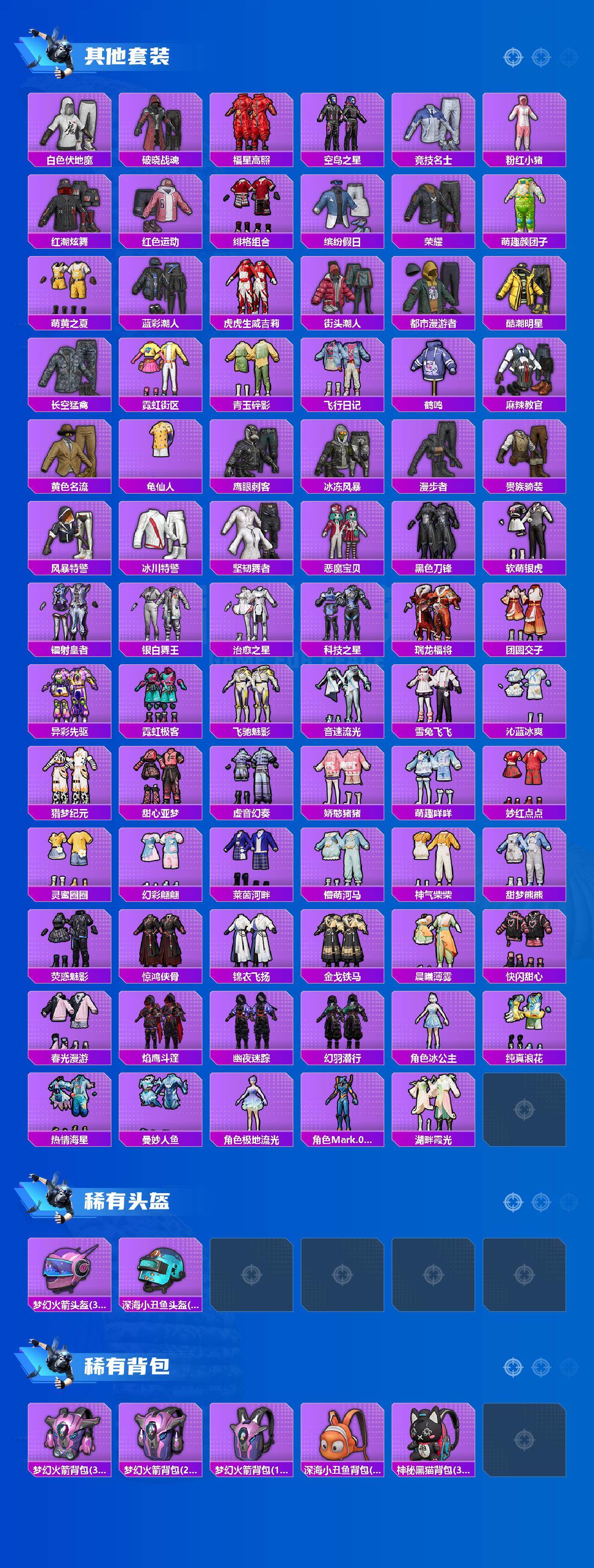 【稀有套装】:套装-龟仙人,套装-绒宝小鹅,套装-巳巳如意,套装-雏菊兔兔,套装-萝兰蝴蝶,套装-小熊娃娃,套装-糖糖葫芦,套装-青团波波,套装-棉花软糖,角色-都市丽猫,角色-摩登魅猫,套装-燕燕于飞,套装-鱼渊荷华,套装-粉恋花,套装-紫幽梦,套装-蓝冰羽,套装-星影赞美诗,套装-云朵鹅,套装-雪绒豹,角色-夜瞳黯灵,角色-绯色魅影,套装-琴音绮想