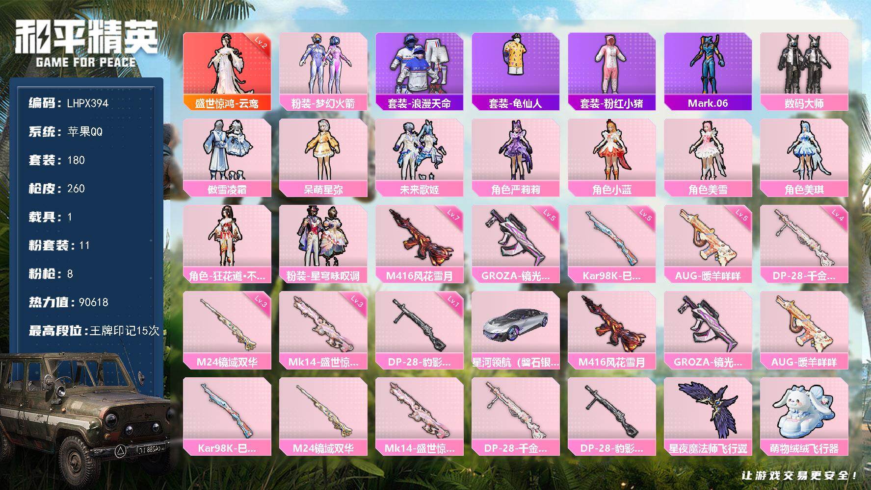 [15615613]【特价出售/店主推荐】苹果 手Q-1神装-11粉装-8特效枪-1载具-8粉色飞行器-90618热力值-15王牌印记-180套装-260枪皮