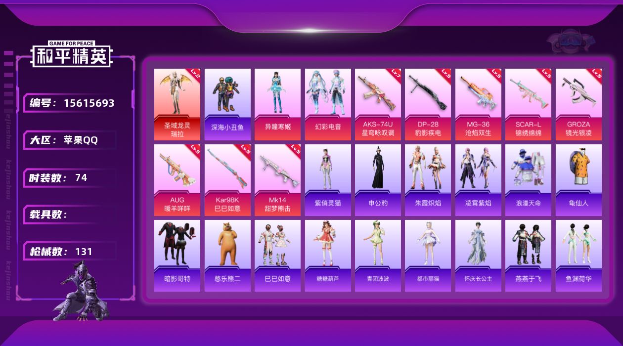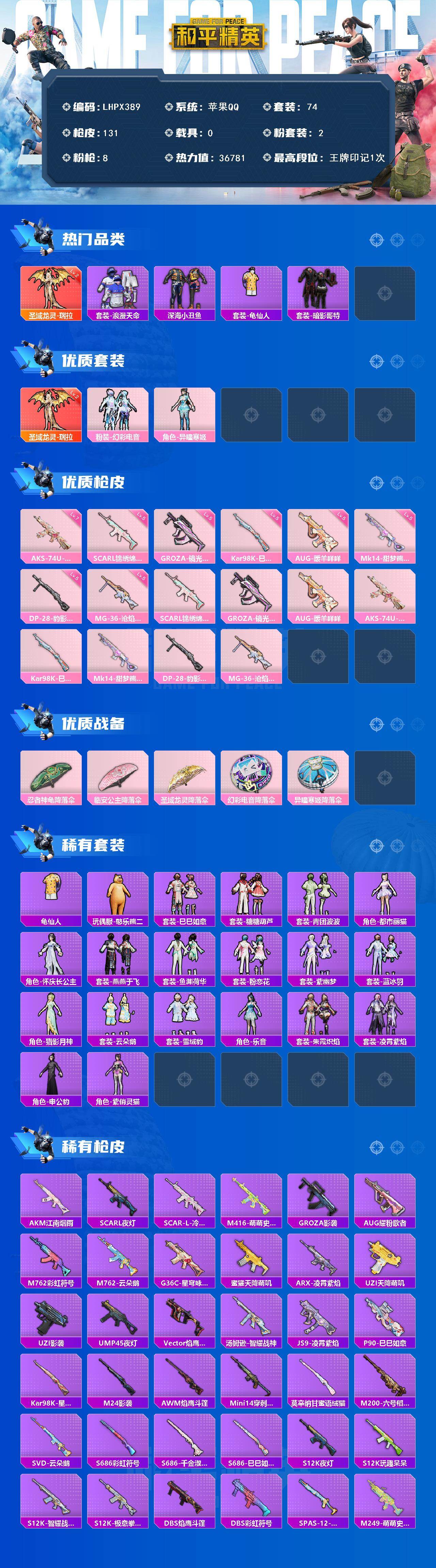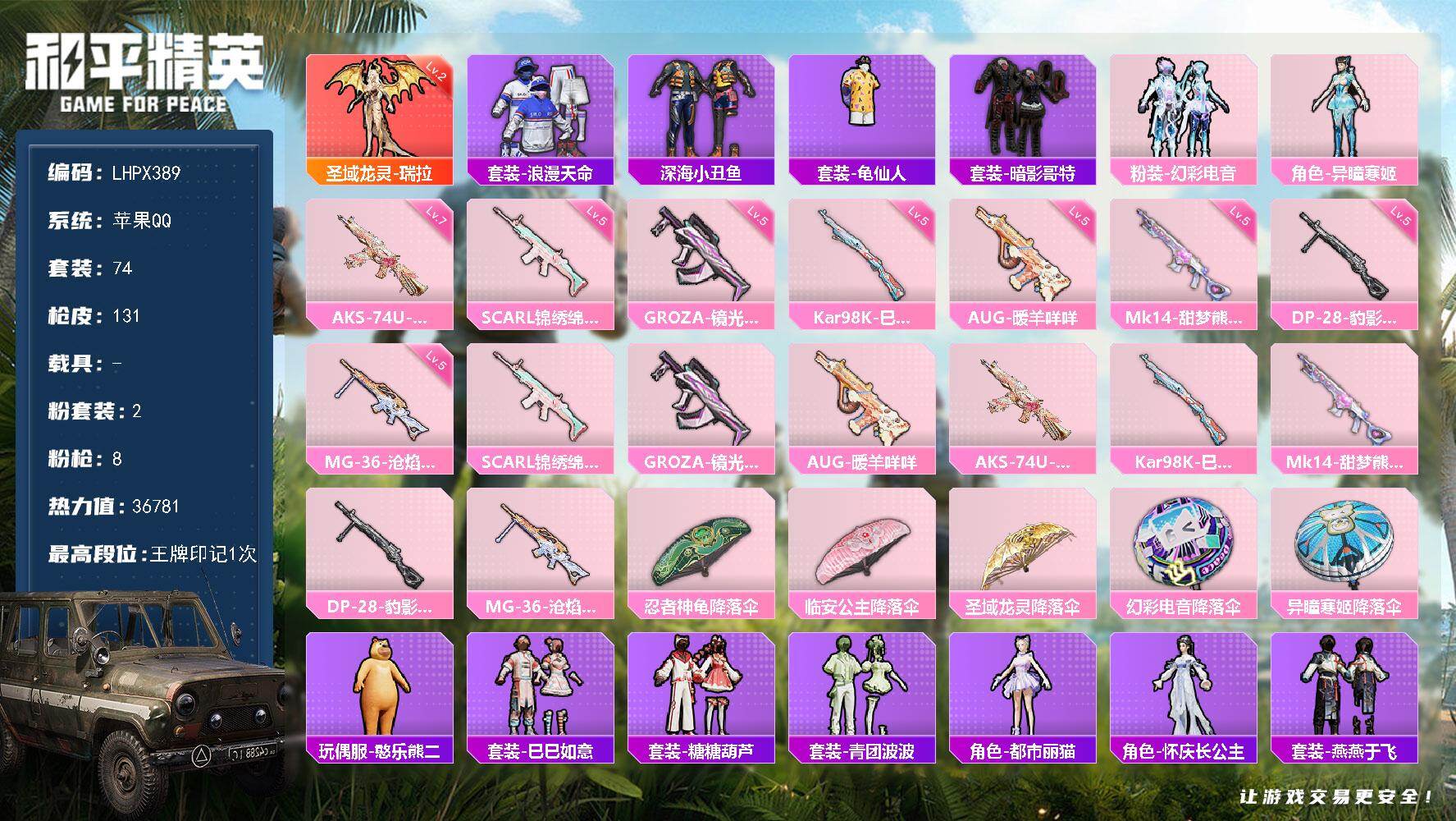 [15615693]【特价出售/店主推荐】苹果 手Q-1神装-2粉装-8特效枪-0载具-1粉色飞行器-36781热力值-1王牌印记-74套装-131枪皮 【红色神装等级】:圣域龙灵-瑞拉(二级) 【红色角色神装】:圣域龙灵-瑞拉 【热门品类】:套装-浪漫天命,套装-深海小丑鱼,套装-龟仙人,套装-暗影哥特 【粉色套装】:粉装-幻彩电音,角色-异瞳寒姬 【粉色枪皮等级】:SCAR-L-锦绣绵绵(五级),GROZA-镜光银凌(五级),AUG-暖羊咩咩(五级),AKS-74U-星穹咏叹调(七级),Kar98K-巳巳如意(五级),Mk14-甜梦熊击(五级),DP-28-豹影疾电(五级),MG-36-沧焰双生(五级) 【粉色枪皮】:SCAR-L-锦绣绵绵,GROZA-镜光银凌,AUG-暖羊咩咩,AKS-74U-星穹咏叹调,Kar98K-巳巳如意,Mk14-甜梦熊击,DP-28-豹影疾电,MG-36-沧焰双生 【粉色降落伞】:忍者神龟降落伞,临安公主降落伞,圣域龙灵降落伞,幻彩电音降落伞,异瞳寒姬降落伞,炫彩糖果降落伞 【稀有套装】:套装-龟仙人,玩偶服-憨乐熊二,套装-巳巳如意,套装-糖糖葫芦,套装-青团波波,角色-都市丽猫,角色-怀庆长公主,套装-燕燕于飞,套装-鱼渊荷华,套装-粉恋花,套装-紫幽梦,套装-蓝冰羽,角色-猎影月神,套装-云朵鹅,套装-雪绒豹,角色-乐音,套装-朱霞炽焰,套装-凌霄紫焰,角色-申公豹,角色-紫俏灵猫,套装-炫彩糖果 【稀有枪皮】:AUG-冰晶雪宝,AKM-江南烟雨,SCAR-L-夜灯,SCAR-L-冷漠罗丽,M416-萌萌史莱姆,GROZA-影袭,AUG-耀粉歌者,M762-彩虹符号,M762-云朵鹅,G36C-星穹咏叹调,蜜獾-天降萌叽,ARX-凌霄紫焰,UZI-天降萌叽,UZI-影袭,UMP45-夜灯,Vector-焰鹰斗篷,汤姆逊-智耀战神,JS9-凌霄紫焰,P90-巳巳如意,Kar98K-星穹咏叹调,M24-影袭,AWM-焰鹰斗篷,Mini14-穿刺龙虾,莫辛纳甘-蜜语绒猫,M200-六号稻草人,SVD-云朵鹅,S686-彩虹符号,S686-巳巳如意,S686-千金淑猫,S12K-玩趣呆呆,S12K-夜灯,S12K-智耀战神,S12K-极意拳锋,DBS-焰鹰斗篷,DBS-彩虹符号,SPAS-12-云朵鹅,M249-萌萌史莱姆,DP-28-焰鹰斗篷,MG3