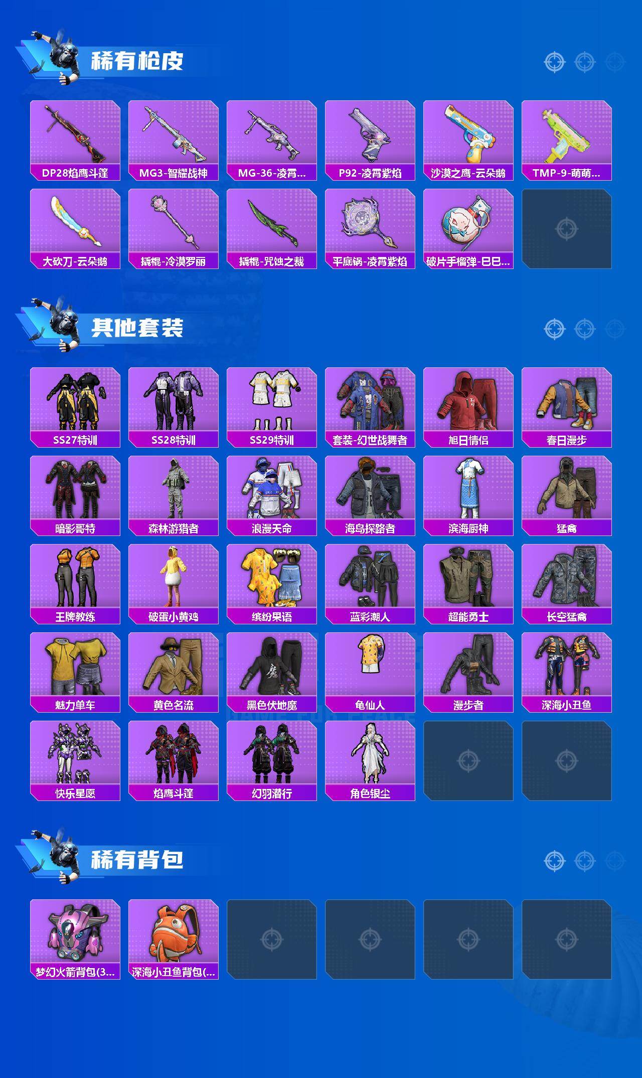【稀有枪皮】:AUG-冰晶雪宝,AKM-江南烟雨,SCAR-L-夜灯,SCAR-L-冷漠罗丽,M416-萌萌史莱姆,GROZA-影袭,AUG-耀粉歌者,M762-彩虹符号,M762-云朵鹅,G36C-星穹咏叹调,蜜獾-天降萌叽,ARX-凌霄紫焰,UZI-天降萌叽,UZI-影袭,UMP45-夜灯,Vector-焰鹰斗篷,汤姆逊-智耀战神,JS9-凌霄紫焰,P90-巳巳如意,Kar98K-星穹咏叹调,M24-影袭,AWM-焰鹰斗篷,Mini14-穿刺龙虾,莫辛纳甘-蜜语绒猫,M200-六号稻草人,SVD-云朵鹅,S686-彩虹符号,S686-巳巳如意,S686-千金淑猫,S12K-玩趣呆呆,S12K-夜灯,S12K-智耀战神,S12K-极意拳锋,DBS-焰鹰斗篷,DBS-彩虹符号,SPAS-12-云朵鹅,M249-萌萌史莱姆,DP-28-焰鹰斗篷,MG3
