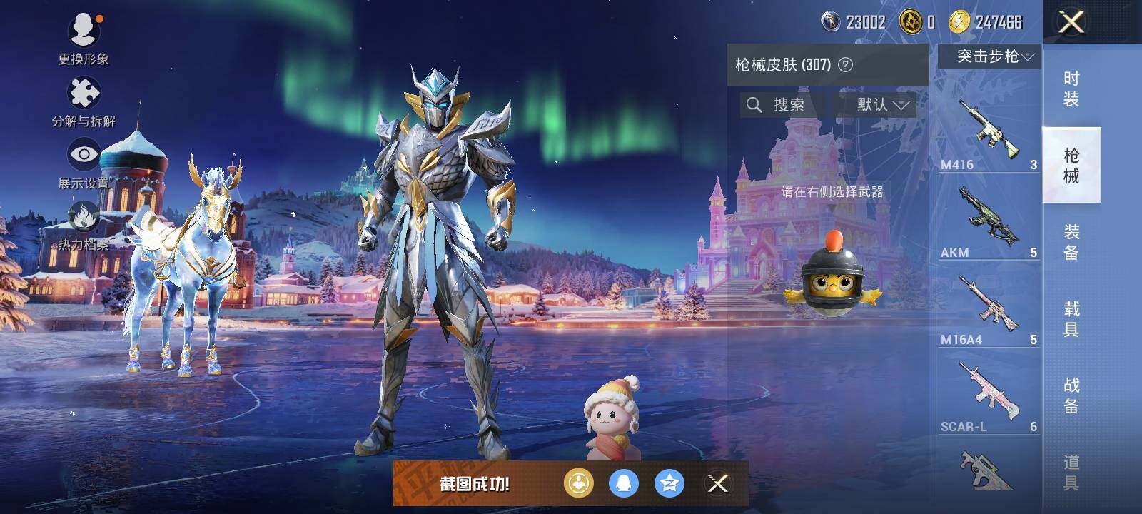 AKM-幽焰骑士,SCAR-L-甜梦小狐,Kar98K-巳巳如意,Kar98K-圣域龙灵,Mk14-盛世惊鸿,M417-第五大道,MK12-雪月幻音,DP-28-千金淑猫
