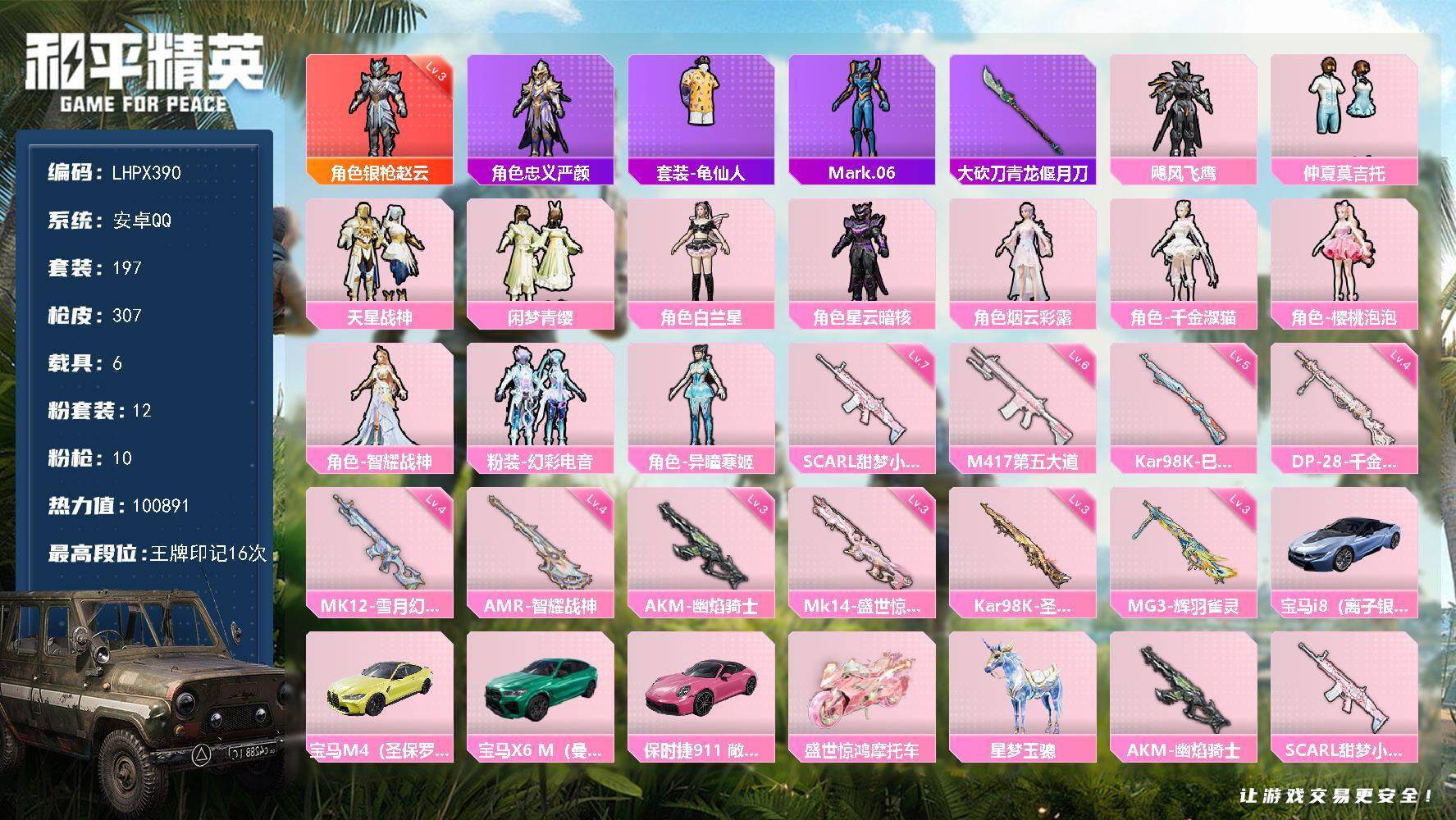 [15615714]安卓 手Q-1神装-12粉装-10特效枪-6载具-10粉色飞行器-100891热力值-16王牌印记-197套装-307枪皮
