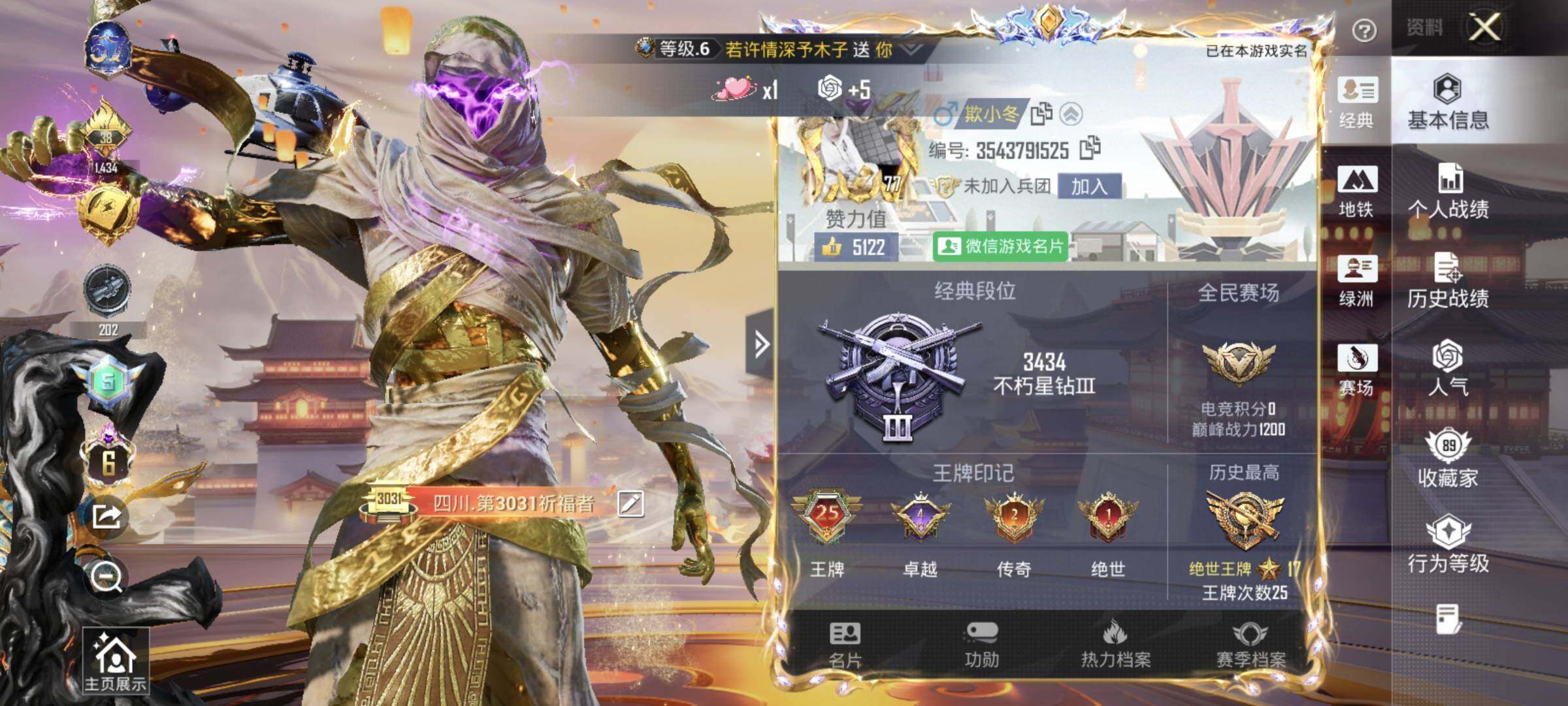 - PX_2017593-实名: 可修改 贵族等级: V8 英雄数: 122 皮肤数: 253 珍品传说: 器灵·落星盏 传说皮: 猫影幻舞,久胜战神,炽阳神光,一念神魔,李逍遥,时之恋人-刘备,淬星耀世,末日机甲-孙策,挚爱之约,无双飞将,乘龙·问璇玑,幻光神枪 限定皮: 李小龙,祈雪灵祝,时雨天司,天狼溯光者,神威,乒乒小将,天狼征服者,天狼运算者,天狼绘梦者,白虎志,如梦令-后羿,大圣娶亲,孙行