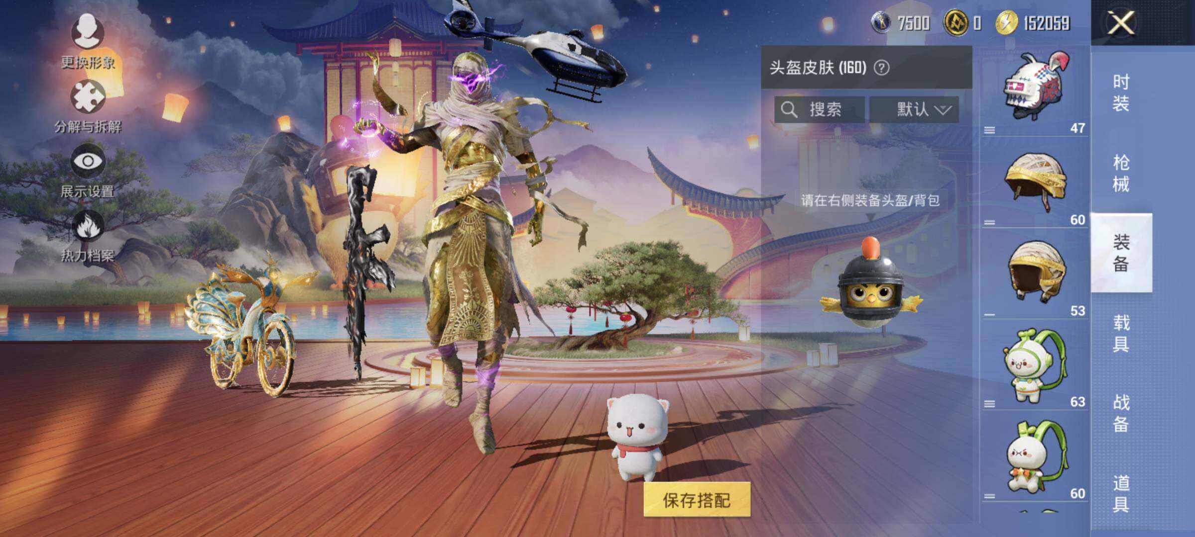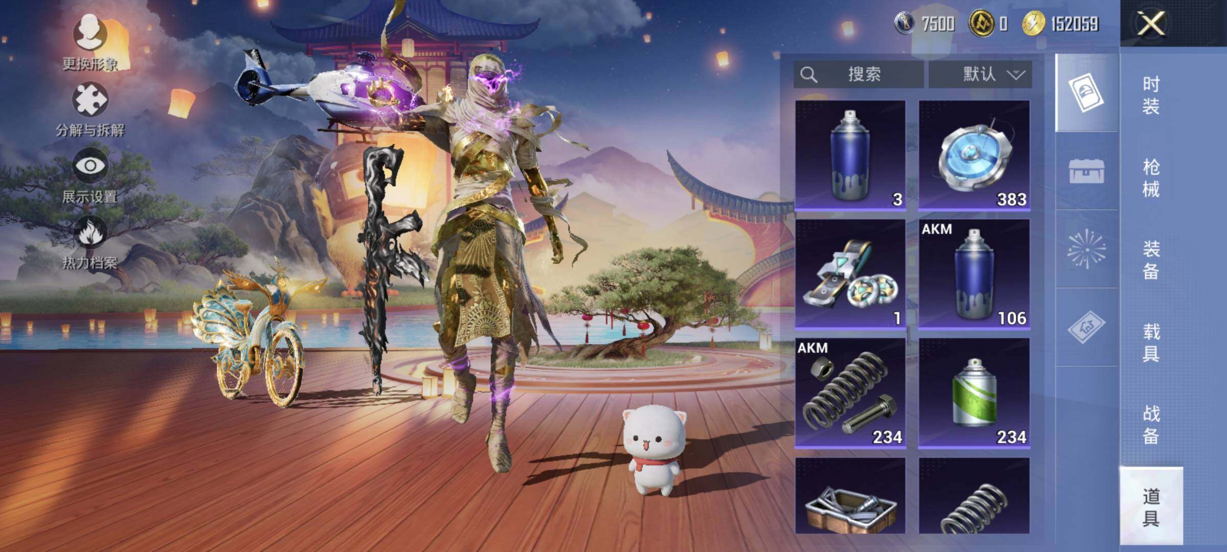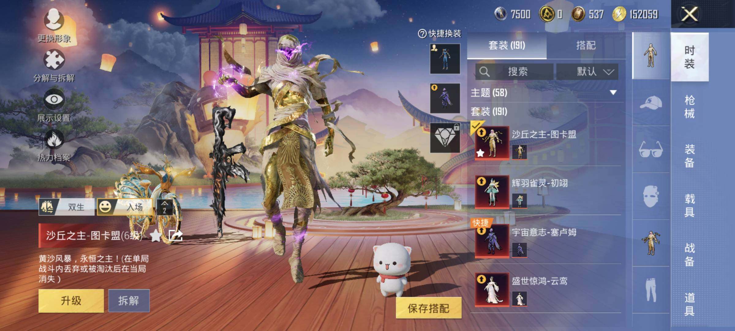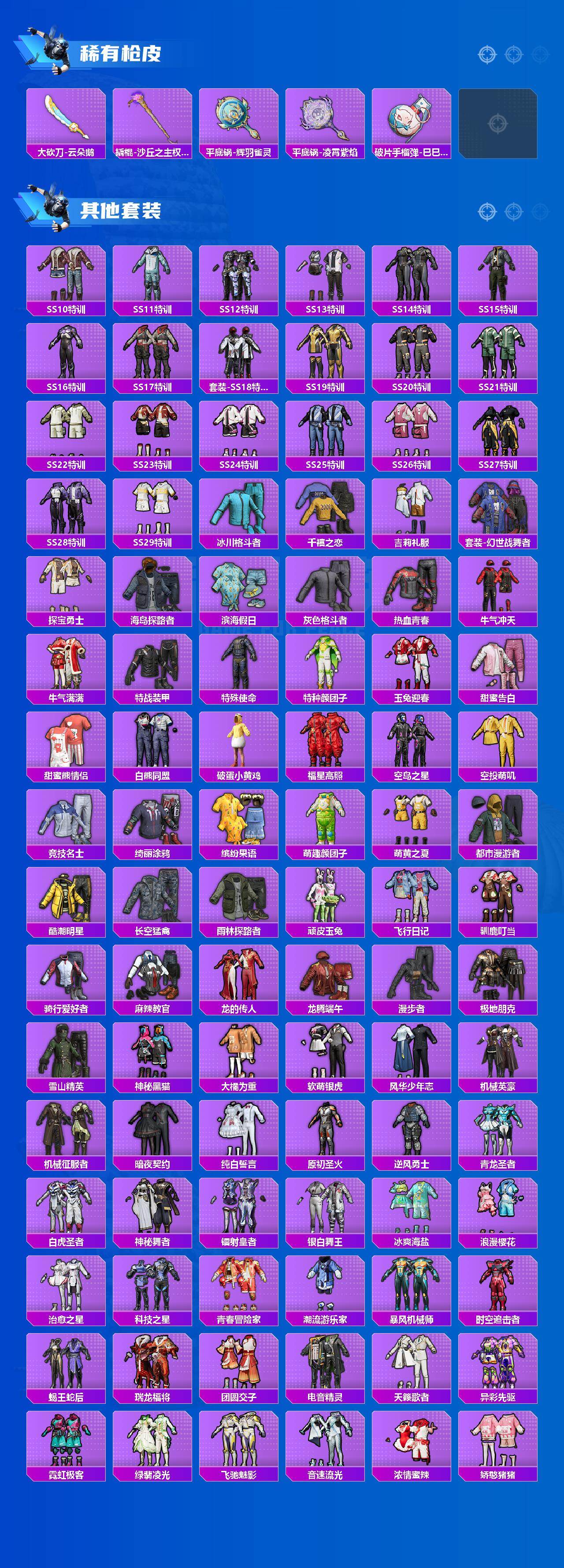 AKM-炫紫旋律,AKM-魔法神域,SCAR-L-金蛇镇世,M416-墨龙九天,GROZA-香水柠檬,M762-甜蜜誓约,UMP45-宇宙意志,P90-沙丘之主,Kar98K-巳巳如意,Kar98K-圣域龙灵,Mk14-盛世惊鸿,DP-28-圣堂之誓,DP-28-千金淑猫,PKM-江南烟雨,平底锅-林间仙鹿