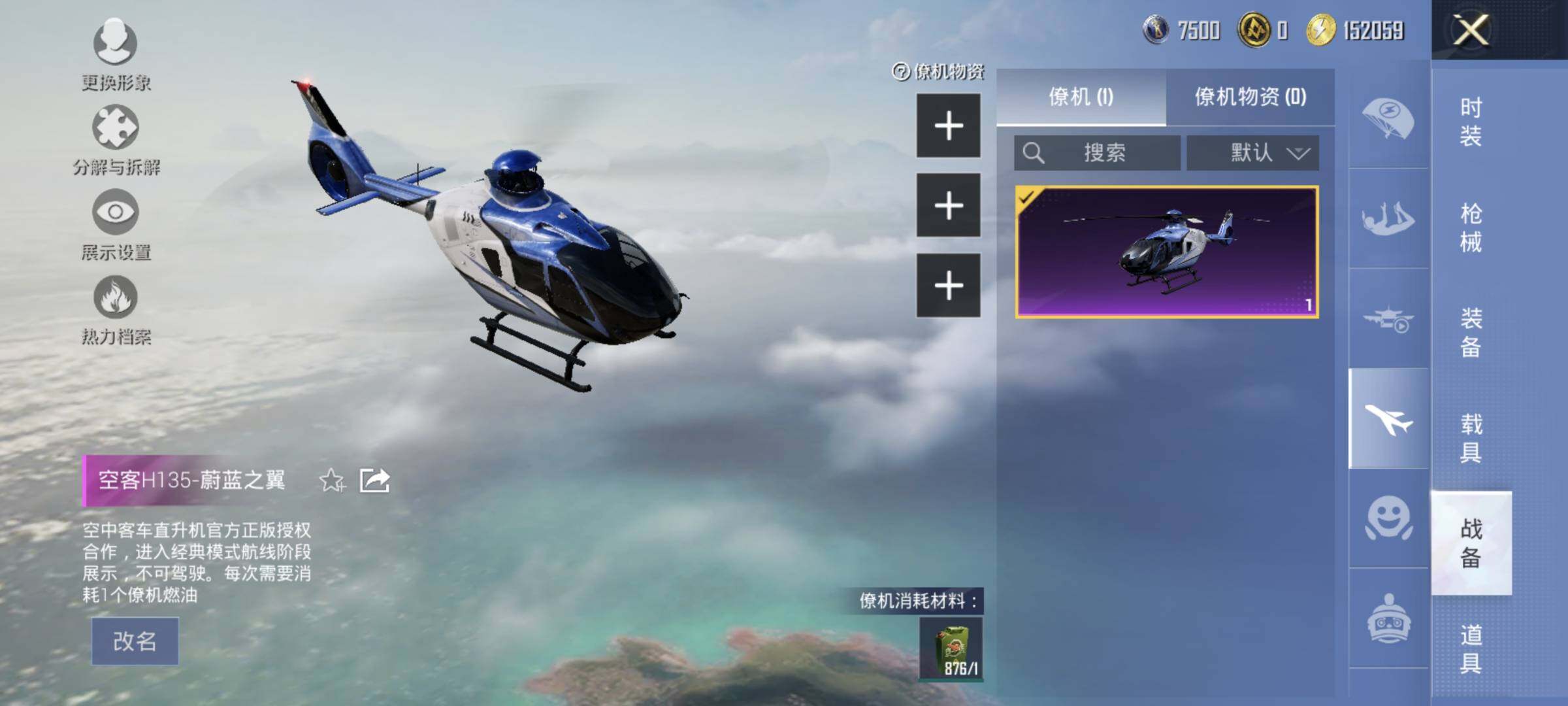 宾利欧陆GT敞篷(火焰橘),仰望U7先锋版(阿盖尔紫),盛世惊鸿摩托车,空客H135-蔚蓝之翼,星梦玉骢,护世瑞兽
