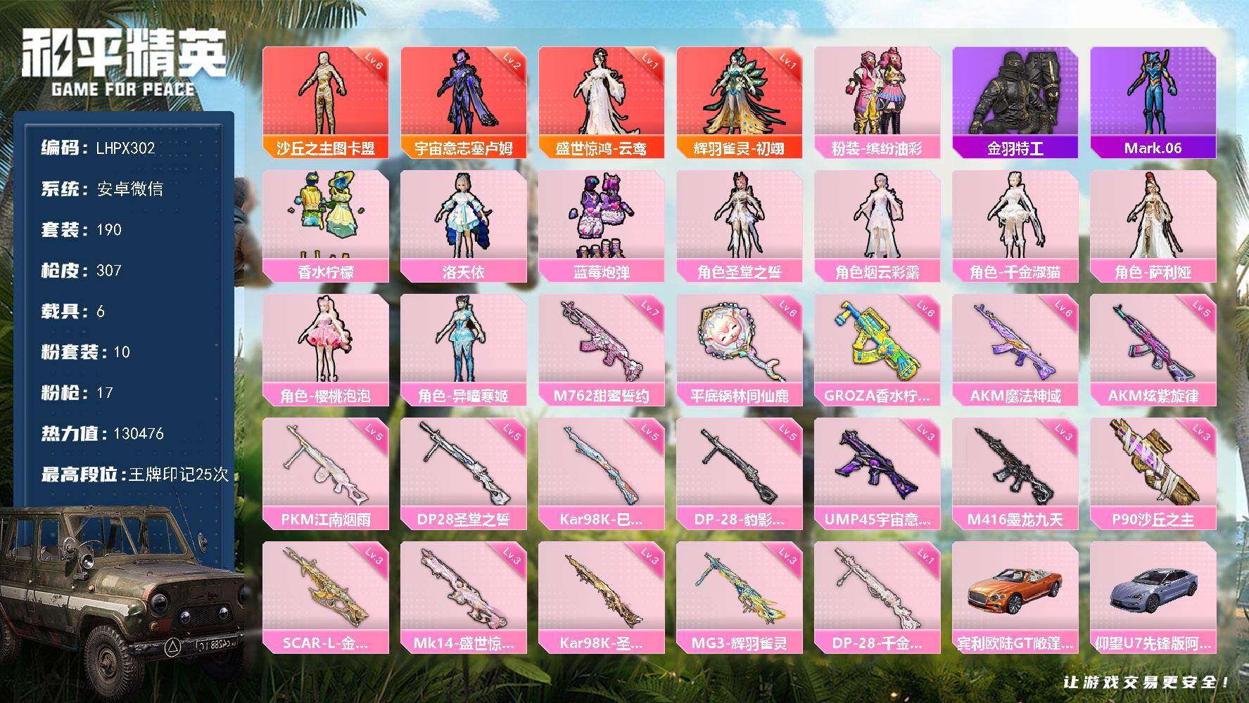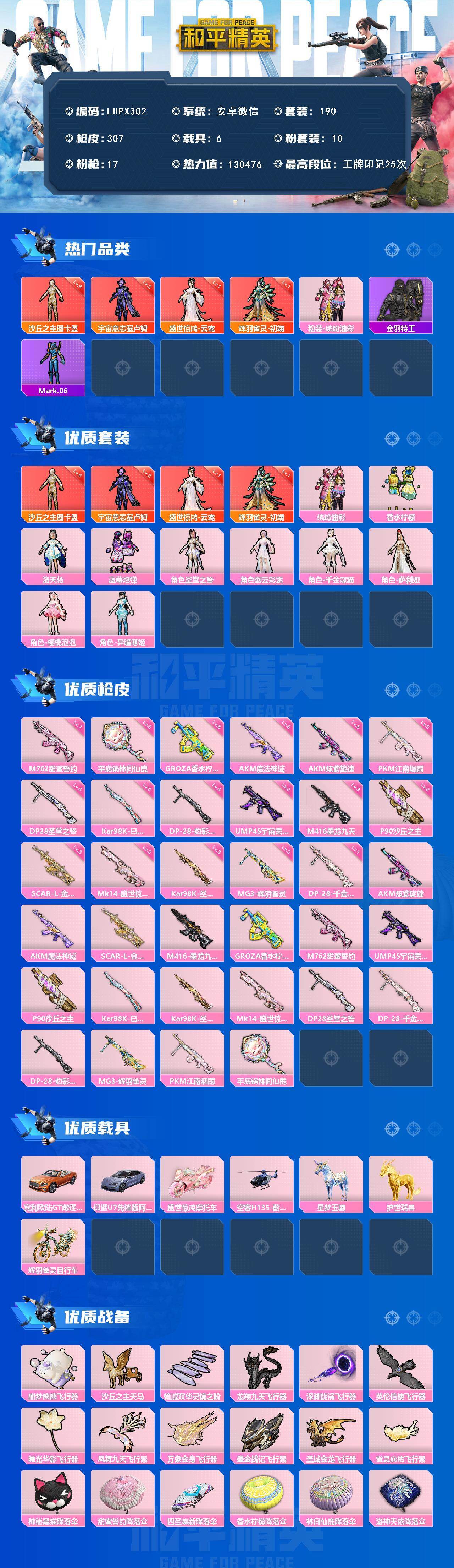 [15615758]4套6级红装可随意切换【特价出售/店主推荐】安卓 微信-4神装-10粉装-17特效枪-6载具-14粉色飞行器-130476热力值-25王牌印记-190套装-307枪皮 【红色神装等级】:辉羽雀灵-初翊(一级),盛世惊鸿-云鸾(一级),宇宙意志-塞卢姆(二级),沙丘之主-图卡盟(六级) 【红色角色神装】:辉羽雀灵-初翊,盛世惊鸿-云鸾,宇宙意志-塞卢姆,沙丘之主-图卡盟 【热门品类】:粉装-缤纷油彩,套装-金羽特工,角色-Mark.06 【粉色套装】:粉装-缤纷油彩,粉装-香水柠檬,角色-洛天依,粉装-蓝莓炮弹,角色-圣堂之誓,角色-烟云彩露,角色-千金淑猫,角色-萨利娅,角色-樱桃泡泡,角色-异瞳寒姬 【粉色枪皮等级】:AKM-炫紫旋律(五级),AKM-魔法神域(六级),SCAR-L-金蛇镇世(三级),M416-墨龙九天(三级),GROZA-香水柠檬(六级),M762-甜蜜誓约(七级),UMP45-宇宙意志(三级),P90-沙丘之主(三级),Kar98K-巳巳如意(五级),Kar98K-圣域龙灵(三级),Mk14-盛世惊鸿(三级),DP-28-圣堂之誓(五级),DP-28-千金淑猫(一级),DP-28-豹影疾电(五级),MG3-辉羽雀灵(三级),PKM-江南烟雨(五级),平底锅-林间仙鹿(六级) 【粉色载具】:宾利欧陆GT敞篷(火焰橘),仰望U7(阿盖尔紫),盛世惊鸿摩托车,空客H135-蔚蓝之翼,星梦玉骢,护世瑞兽,辉羽雀灵自行车 【粉色枪皮】:AKM-炫紫旋律,AKM-魔法神域,SCAR-L-金蛇镇世,M416-墨龙九天,GROZA-香水柠檬,M762-甜蜜誓约,UMP45-宇宙意志,P90-沙丘之主,Kar98K-巳巳如意,Kar98K-圣域龙灵,Mk14-盛世惊鸿,DP-28-圣堂之誓,DP-28-千金淑猫,DP-28-豹影疾电,MG3-辉羽雀灵,PKM-江南烟雨,平底锅-林间仙鹿 【粉色飞行器】:酣梦熊熊飞行器,沙丘之主天马,镜域双华-灵镜之阶,龙翔九天飞行器,深渊漩涡飞行器,英伦信使飞行器,曦光华影飞行器,凤舞九天飞行器,万象金身飞行器,墨金战记飞行器,圣域金龙飞行器,雀灵庇佑飞行器 【粉色降落伞】:神秘黑猫降落伞,甜蜜誓约降落伞,四圣焕新降落伞,香水柠檬降落伞,林间仙鹿降落伞,洛神天依降落伞,筑梦精灵降落伞,圣堂之誓降落伞,沙丘之主降落伞,绝色倾城降